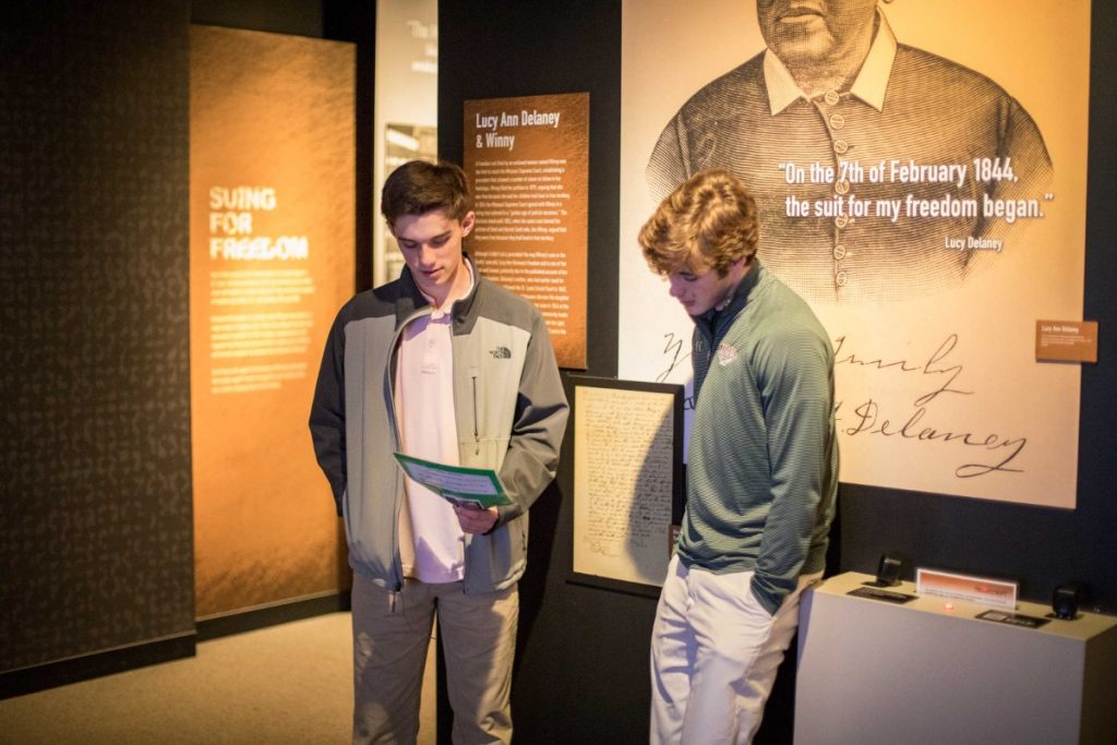 During the trip, students learned what it means to be an activist and the role activists—of all ages—play in taking a stand to protect people’s rights. They also explored important freedom cases and stories from the pre-Civil War era. While learning about the 1963 Jefferson Bank protests, students reenacted a protest and sang songs, as they learned what it meant to participate in nonviolent, peaceful protest and the various influencers and emotions that come into play. They visited the Ferguson section of the exhibit and observed artifacts and video stories demonstrating various perspectives behind the Ferguson protests. Granted special access to the museum’s primary sources, students explored newspaper files from events such as Ferguson, the Jefferson Bank protests, the Dred Scott case and more, where they identified the difference between fact, opinion and bias.