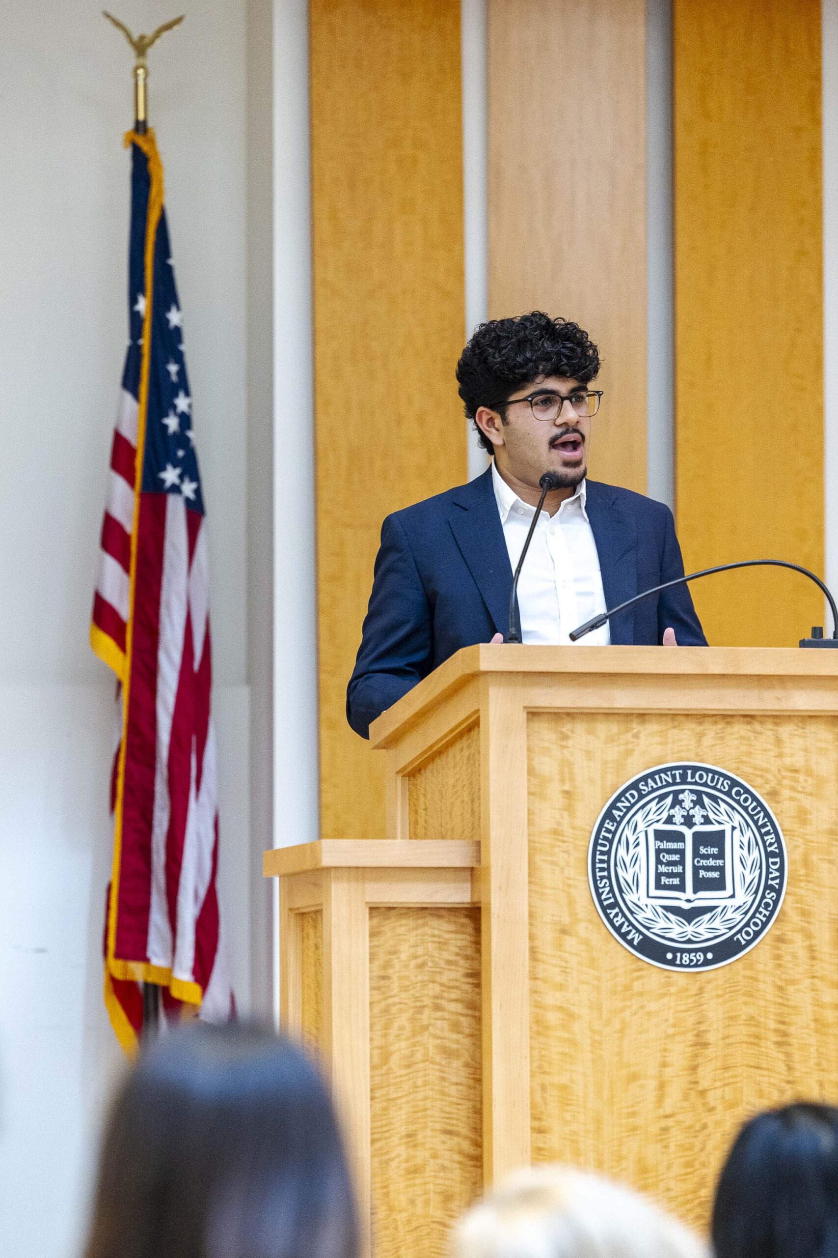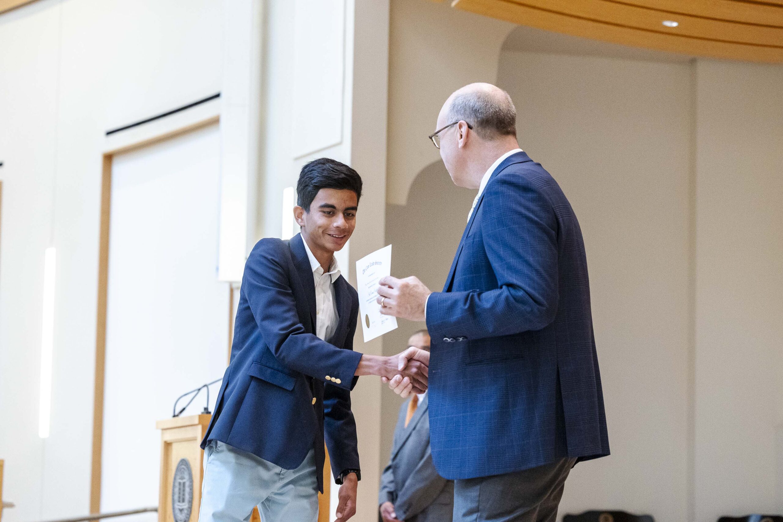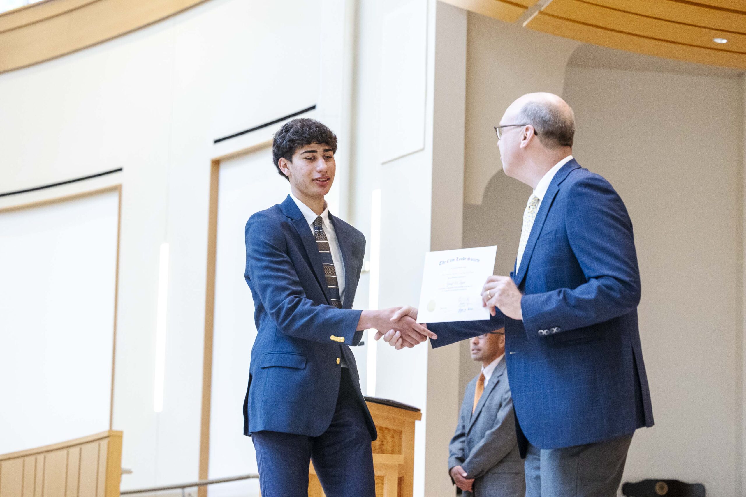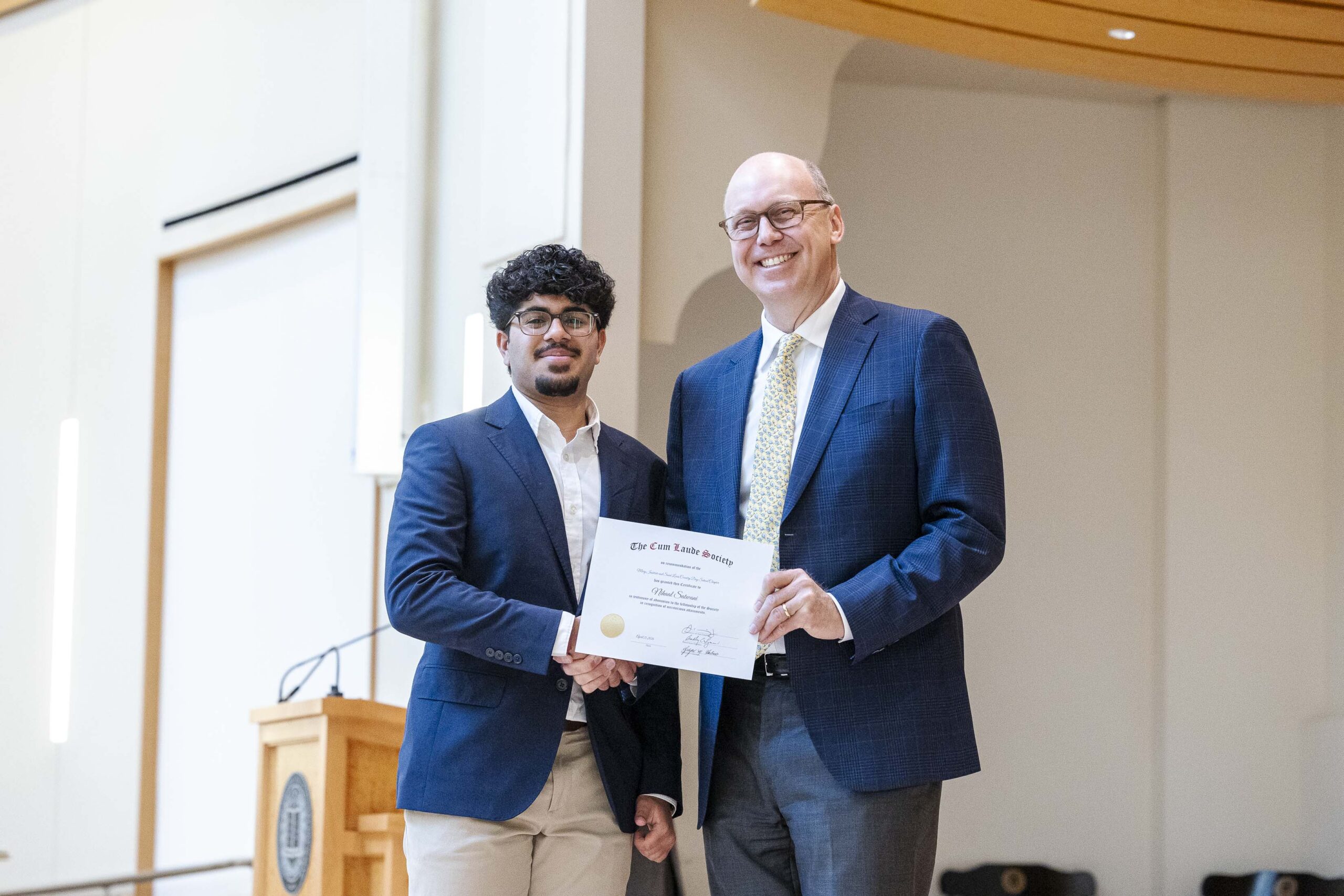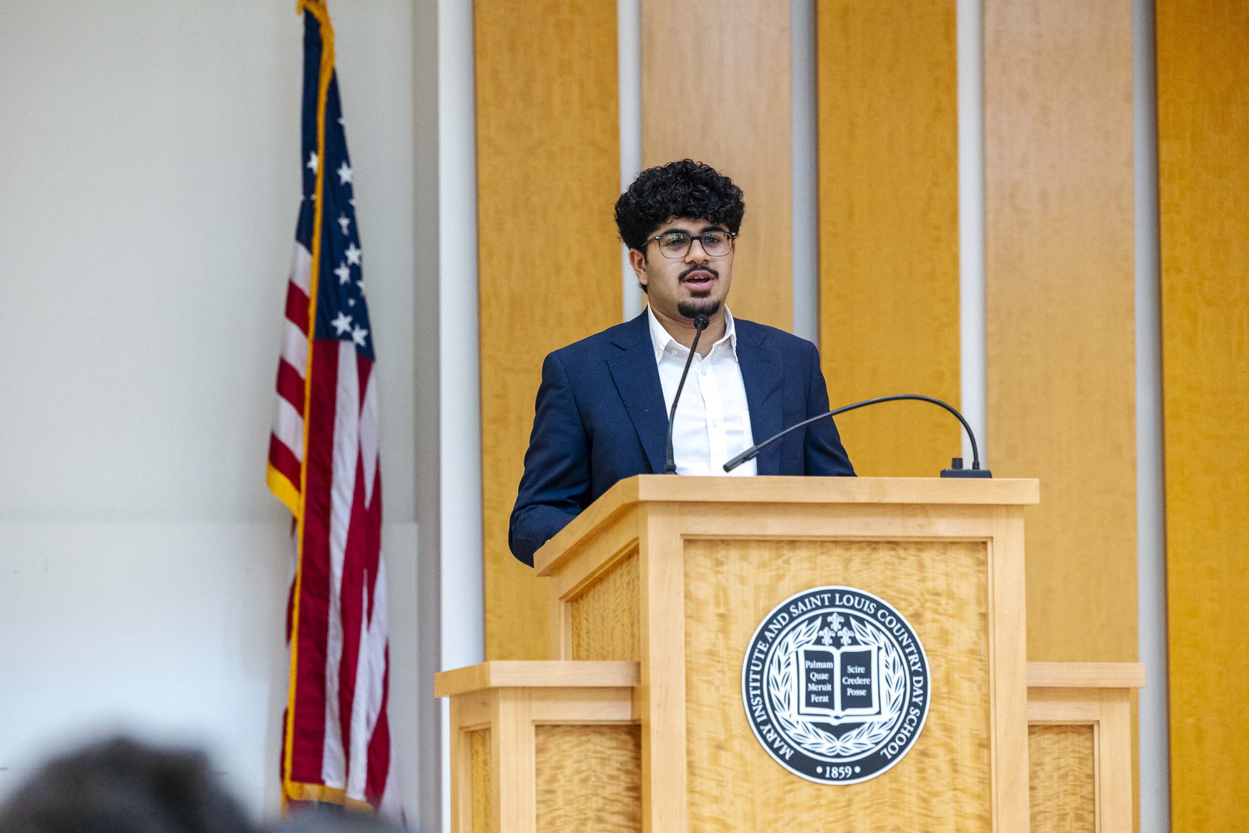The students selected Cade-Michael Miller ’26 and Nihaal Satwani ’26 to share their essays with the Upper School student body during the ceremony.