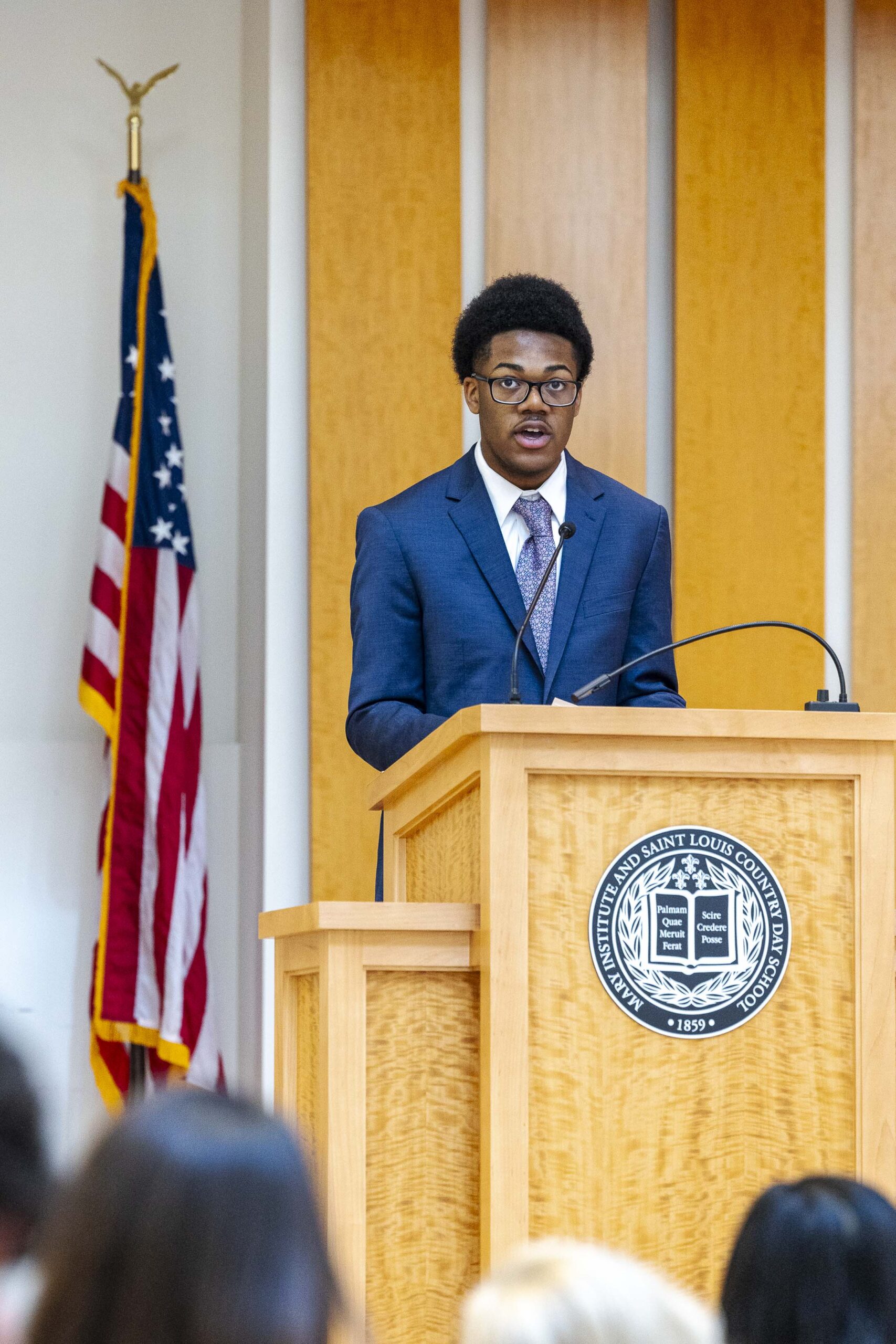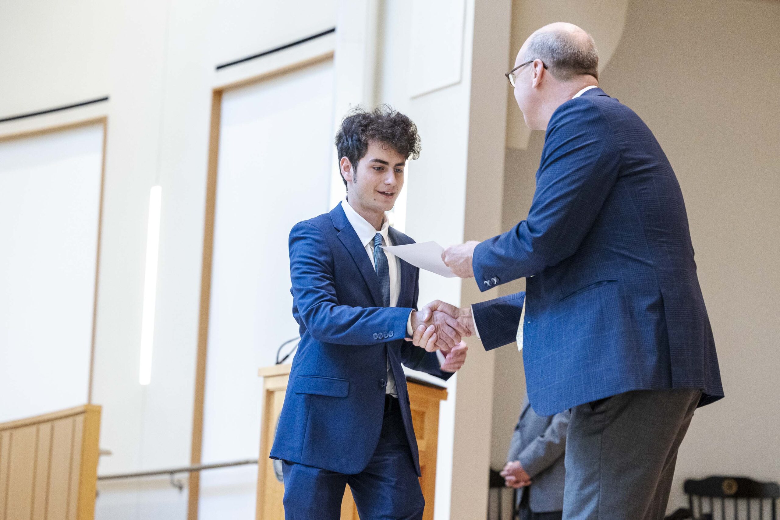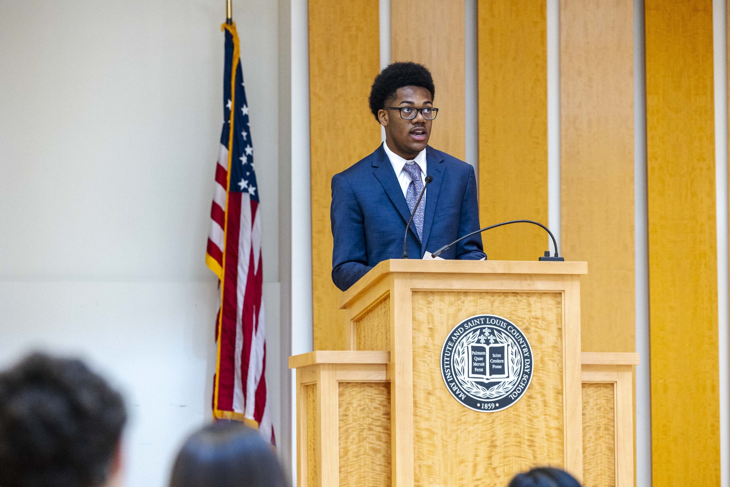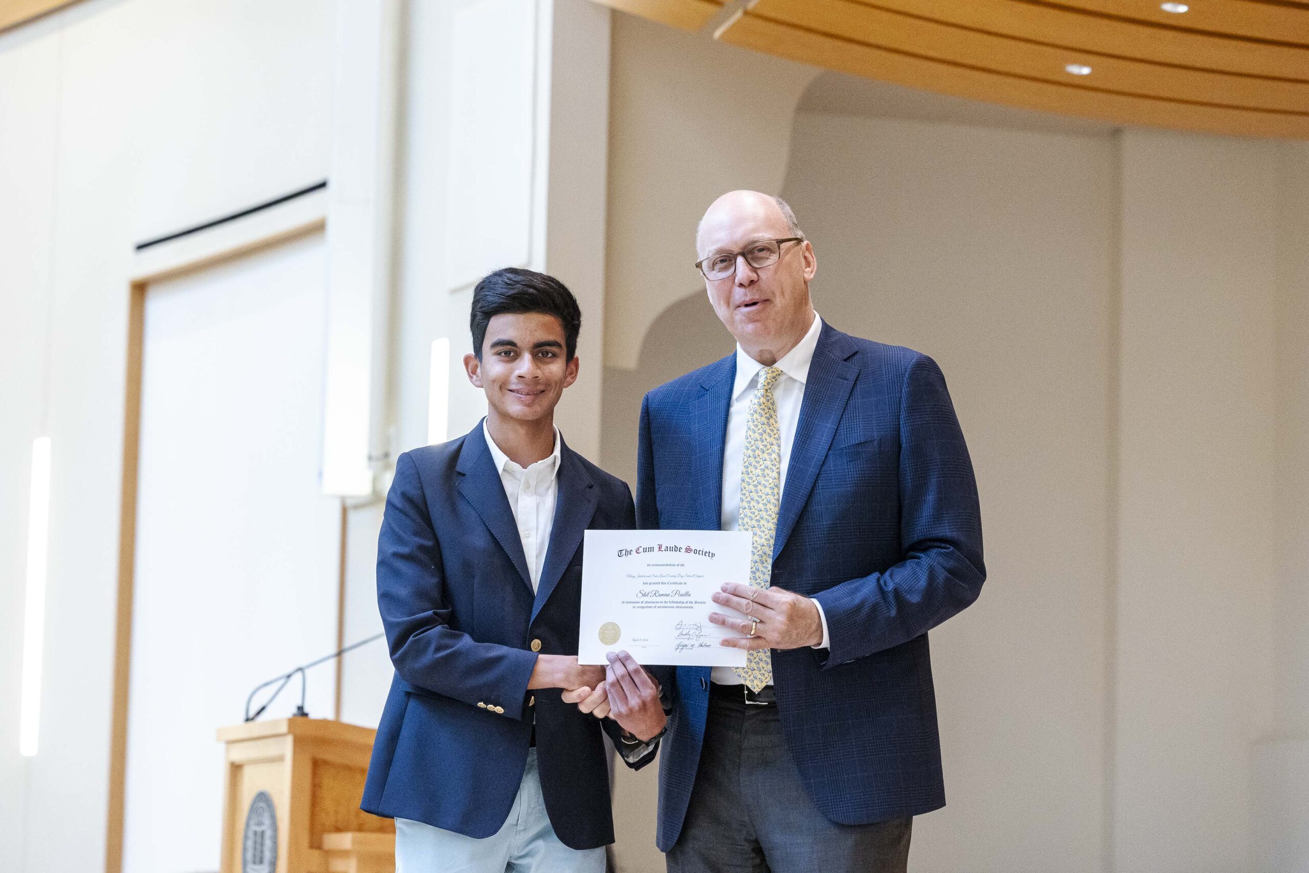 The students selected Cade-Michael Miller ’26 and Nihaal Satwani ’26 to share their essays with the Upper School student body during the ceremony.