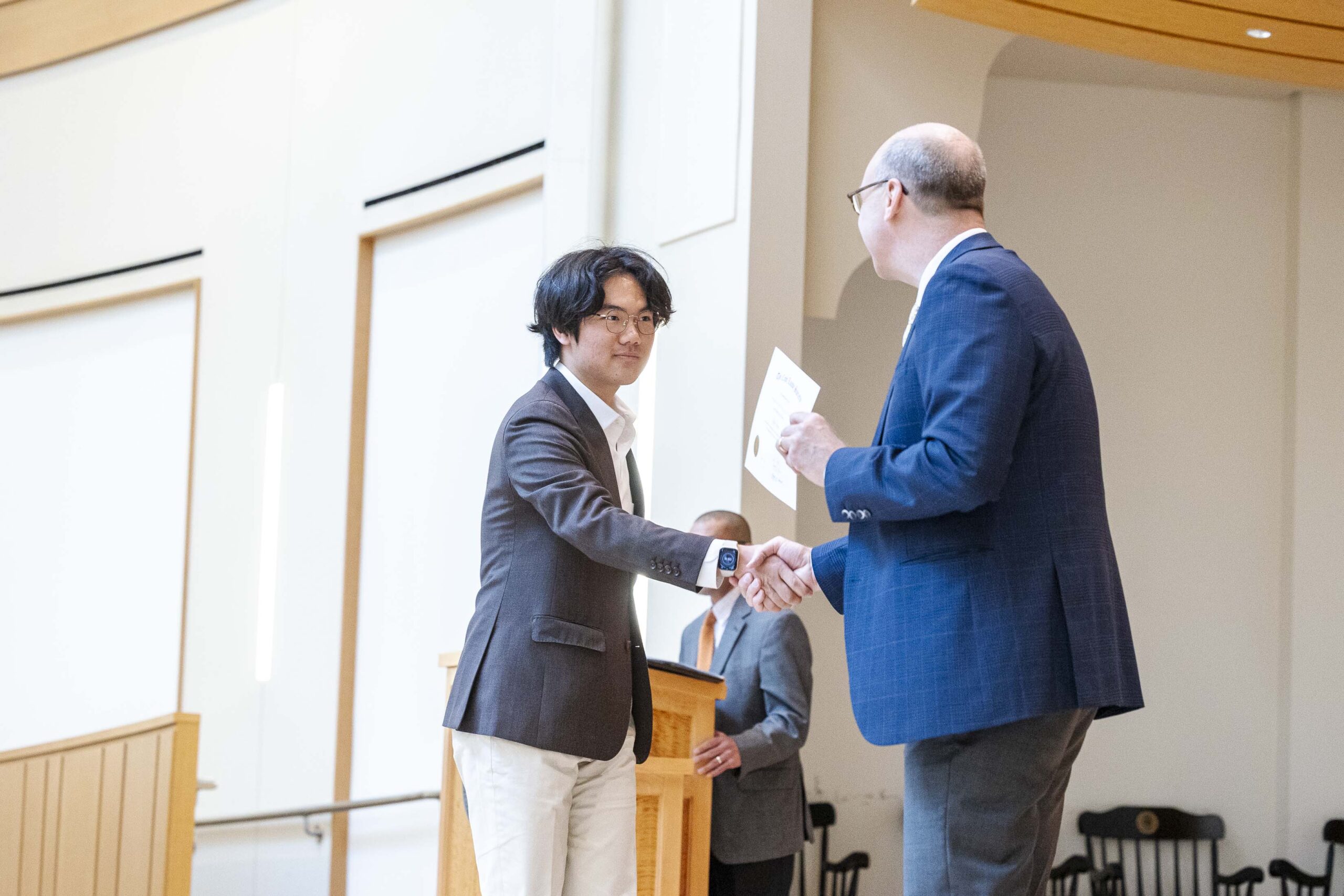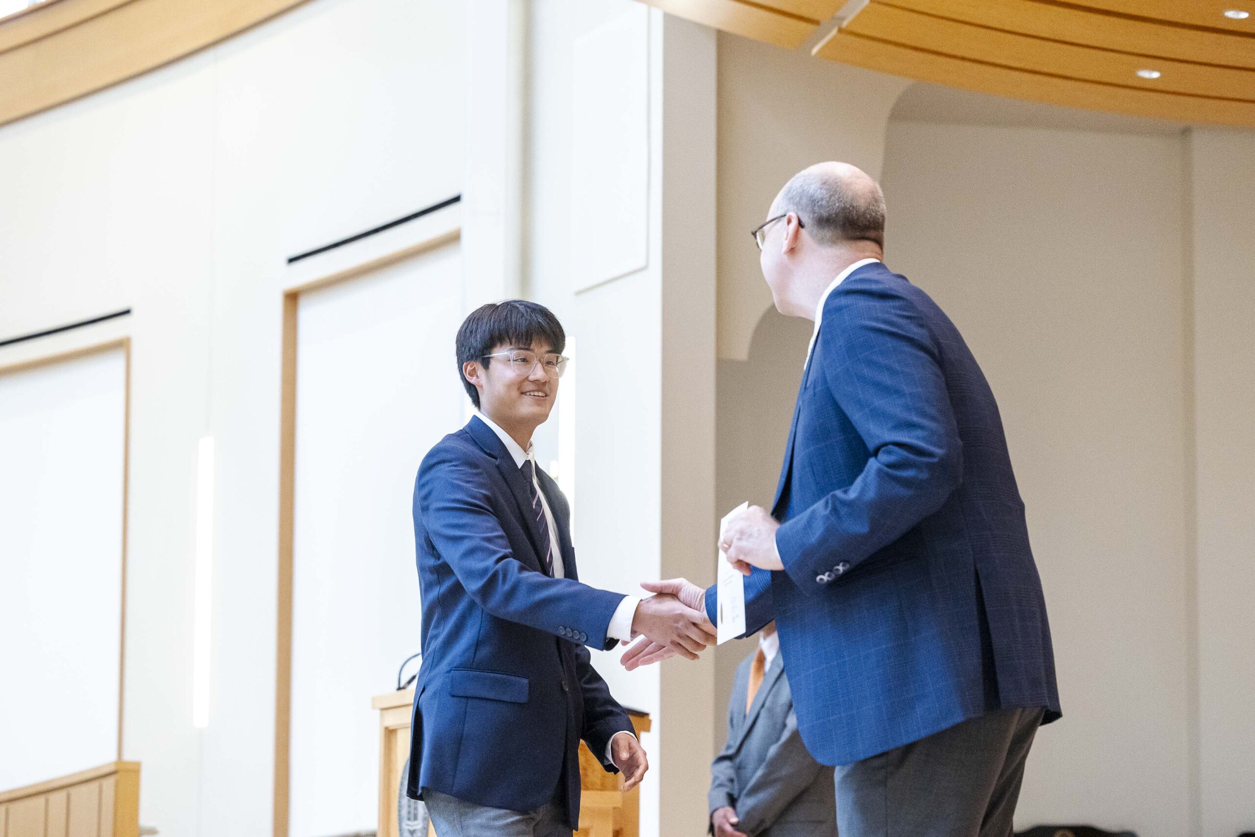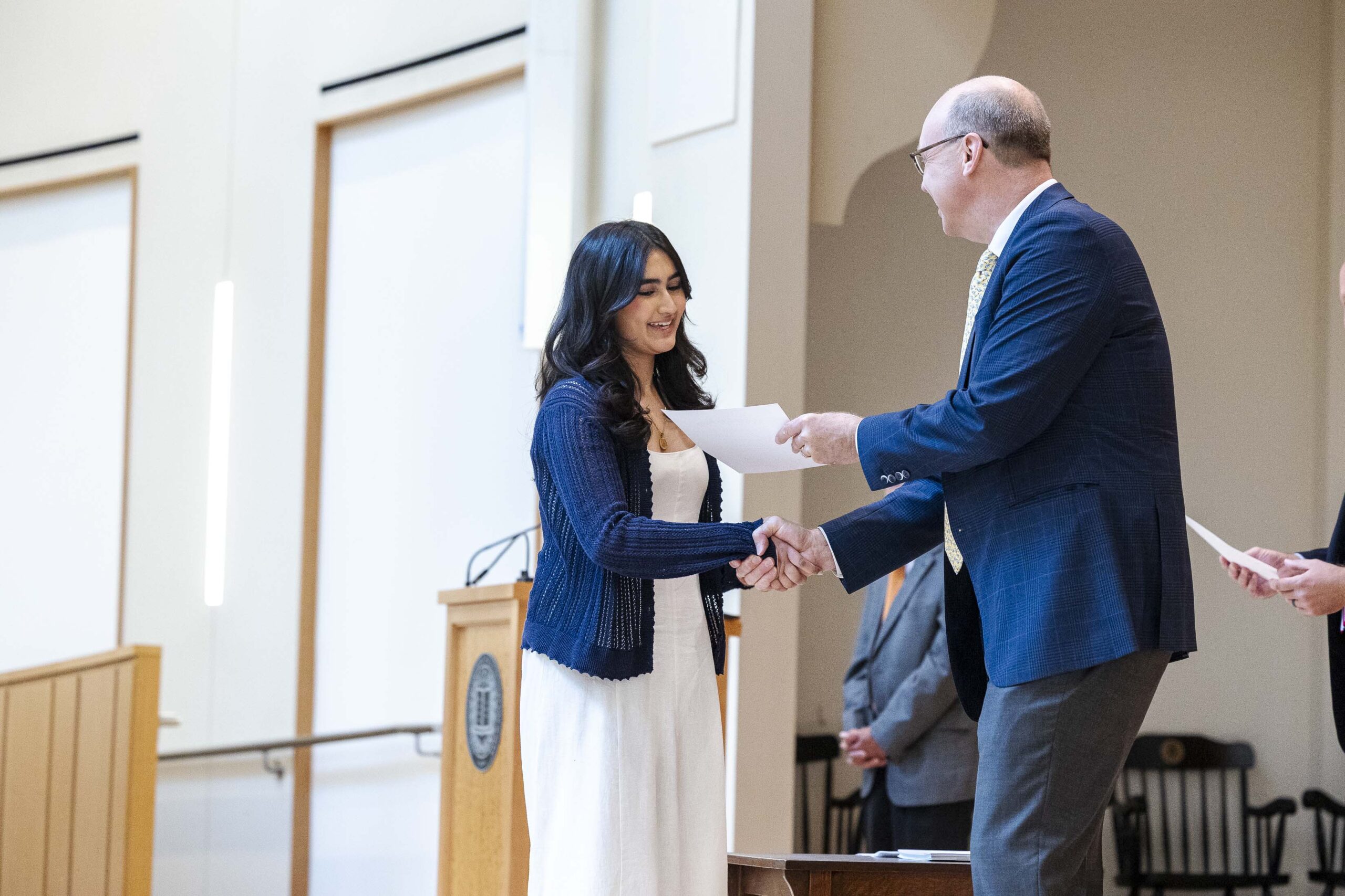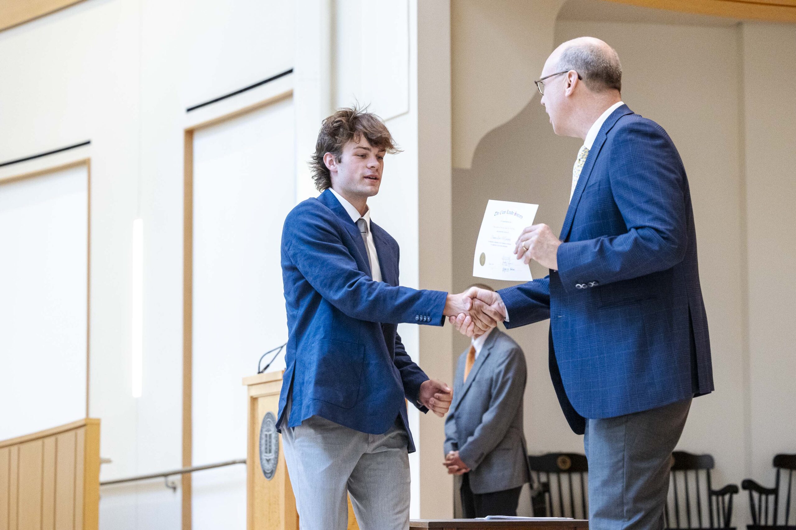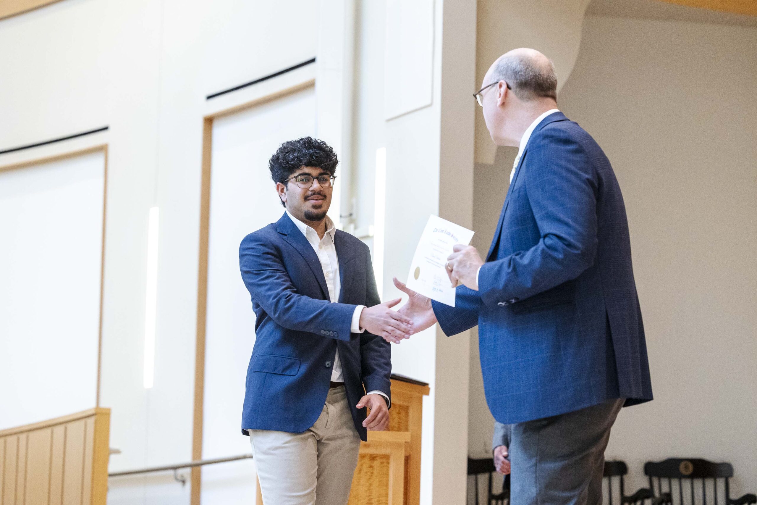 The students selected Cade-Michael Miller ’26 and Nihaal Satwani ’26 to share their essays with the Upper School student body during the ceremony.