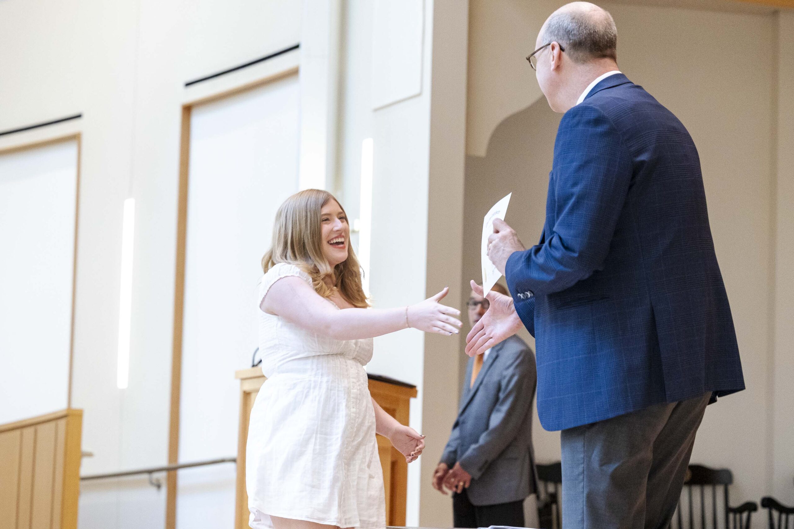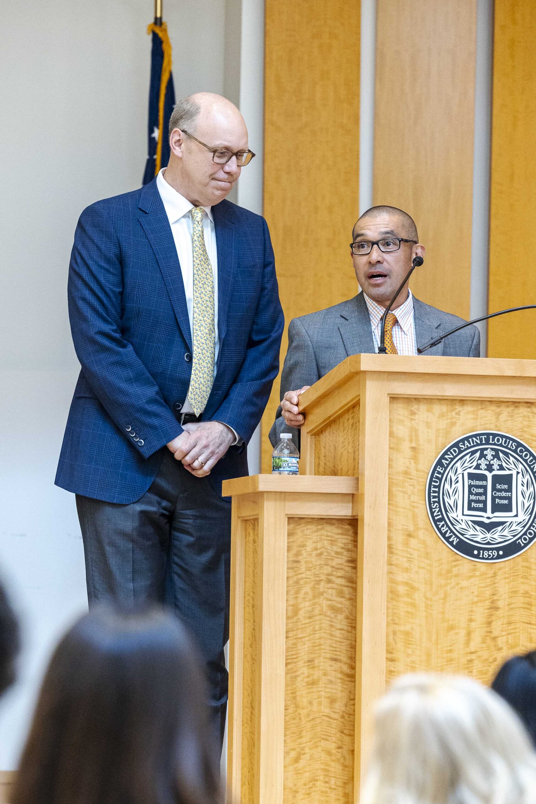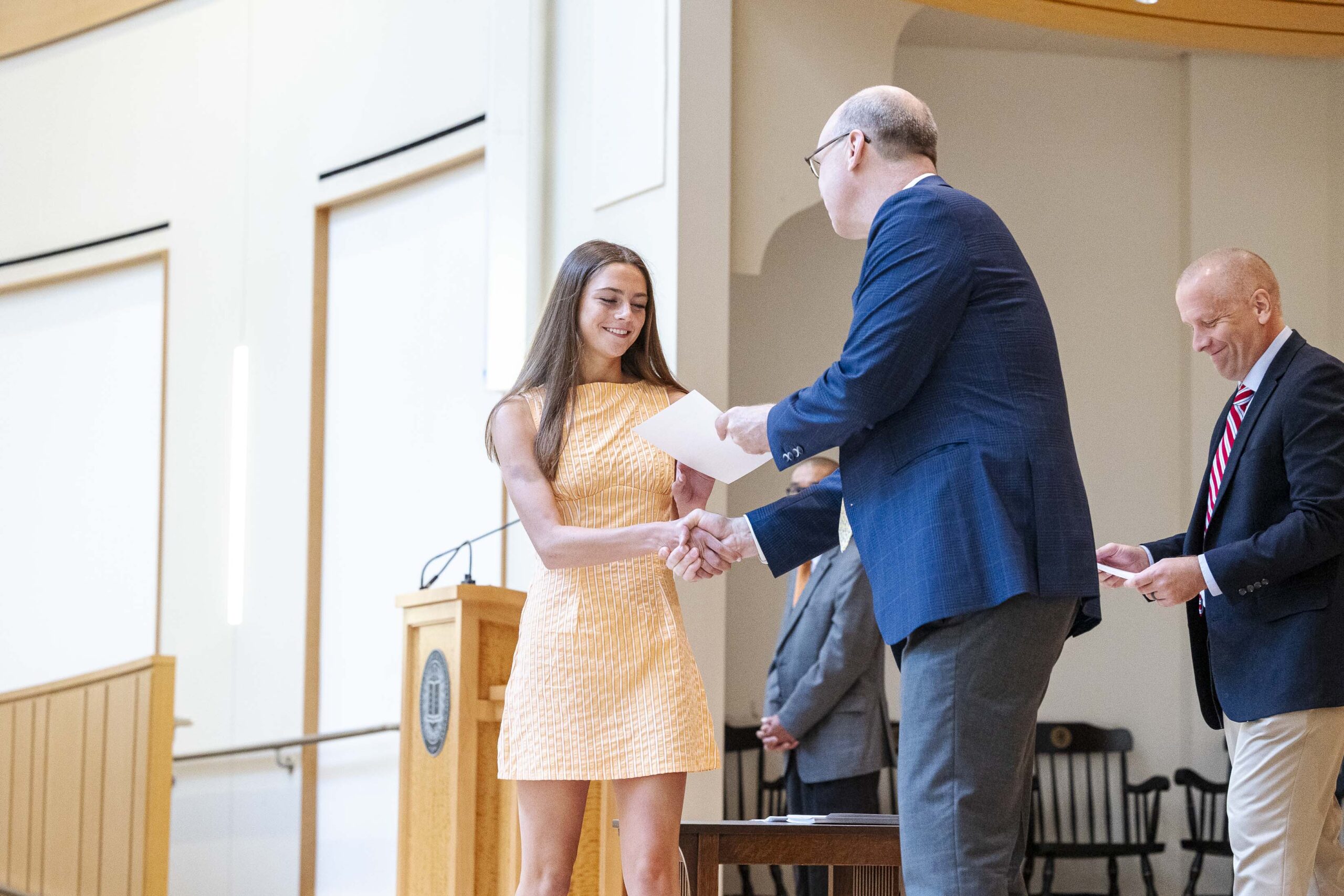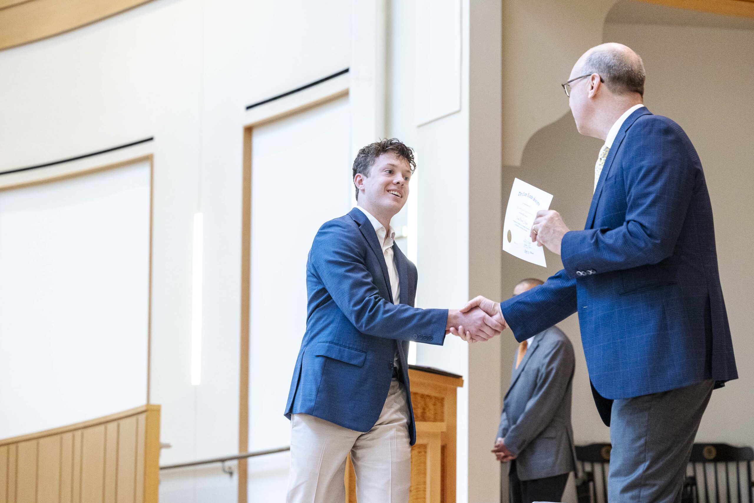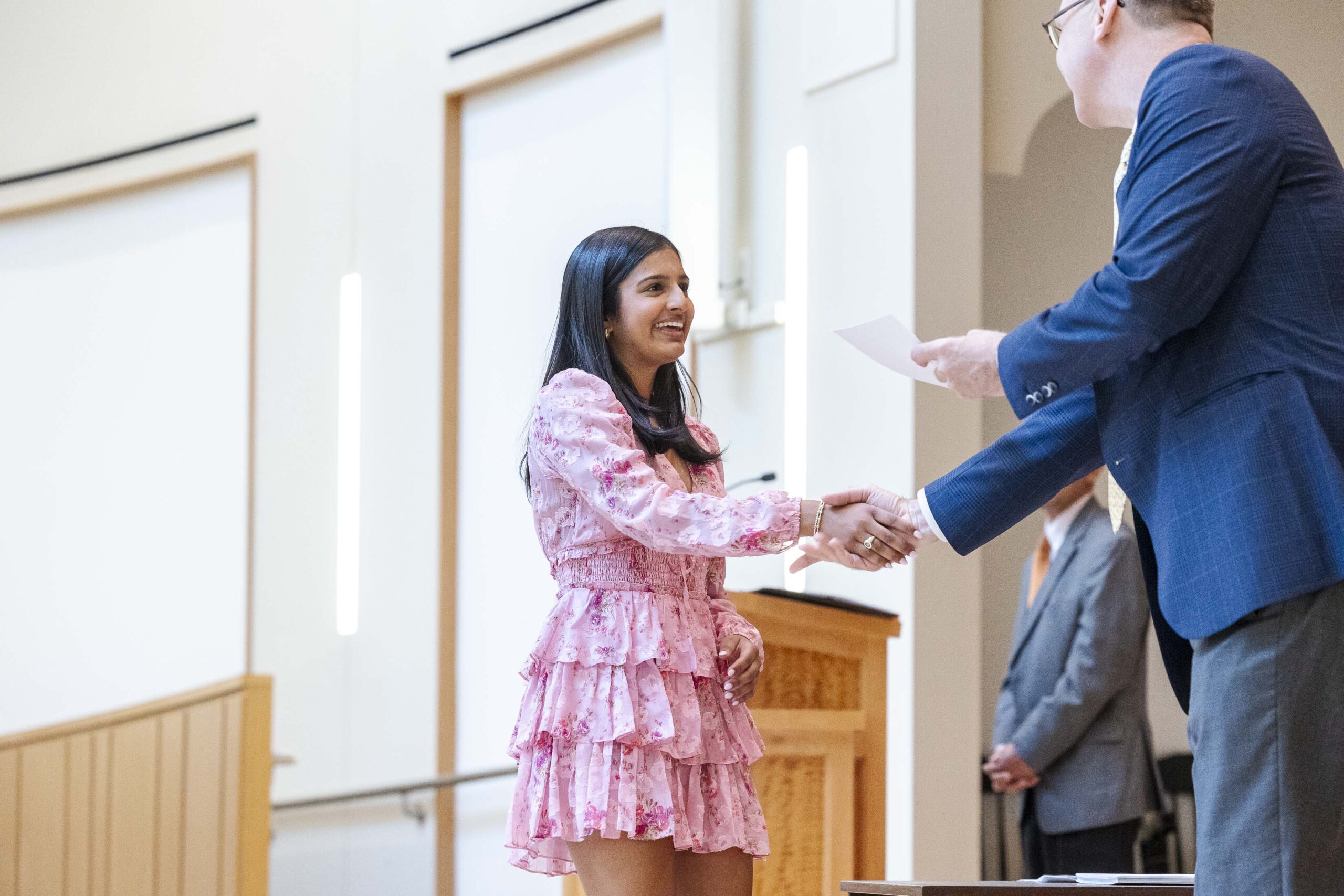 The students selected Cade-Michael Miller ’26 and Nihaal Satwani ’26 to share their essays with the Upper School student body during the ceremony.
