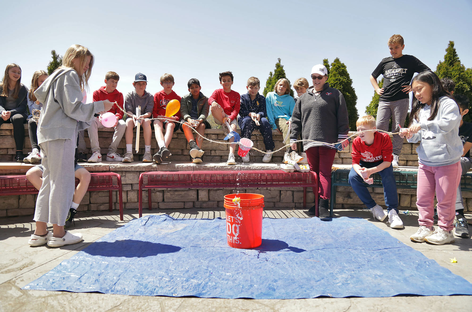 Back on the MICDS campus, students worked on a new version of the egg drop STEM challenge. In a typical egg drop challenge, students have to construct a contraption that allows them to drop an egg from a specific height without breaking the egg. For the sixth-grade egg-drop challenge, students were told that a virus was released onto an island that infected everyone who lived there, turning them into zombies. Their mission was to transport the golden egg, filled with a special potion, across the ocean (a blue tarp) and onto the island (a bucket) without cracking the egg and spilling the potion. They had specific constraints that forced them to have to think outside the box. And, they had to collaborate, communicate, and use their listening skills to execute the challenge without breaking the egg. Middle School Science Teacher, Michelle Hrastich shared, “Some were successful, many left a pile of gooey egg to clean up, but all had fun working together with their team members.” Middle School Humanities Teacher Megan Caulfield added, “It was super cool to watch different groups of students collaborate and problem-solve together. They were thinking outside the box and demonstrating great teamwork.”