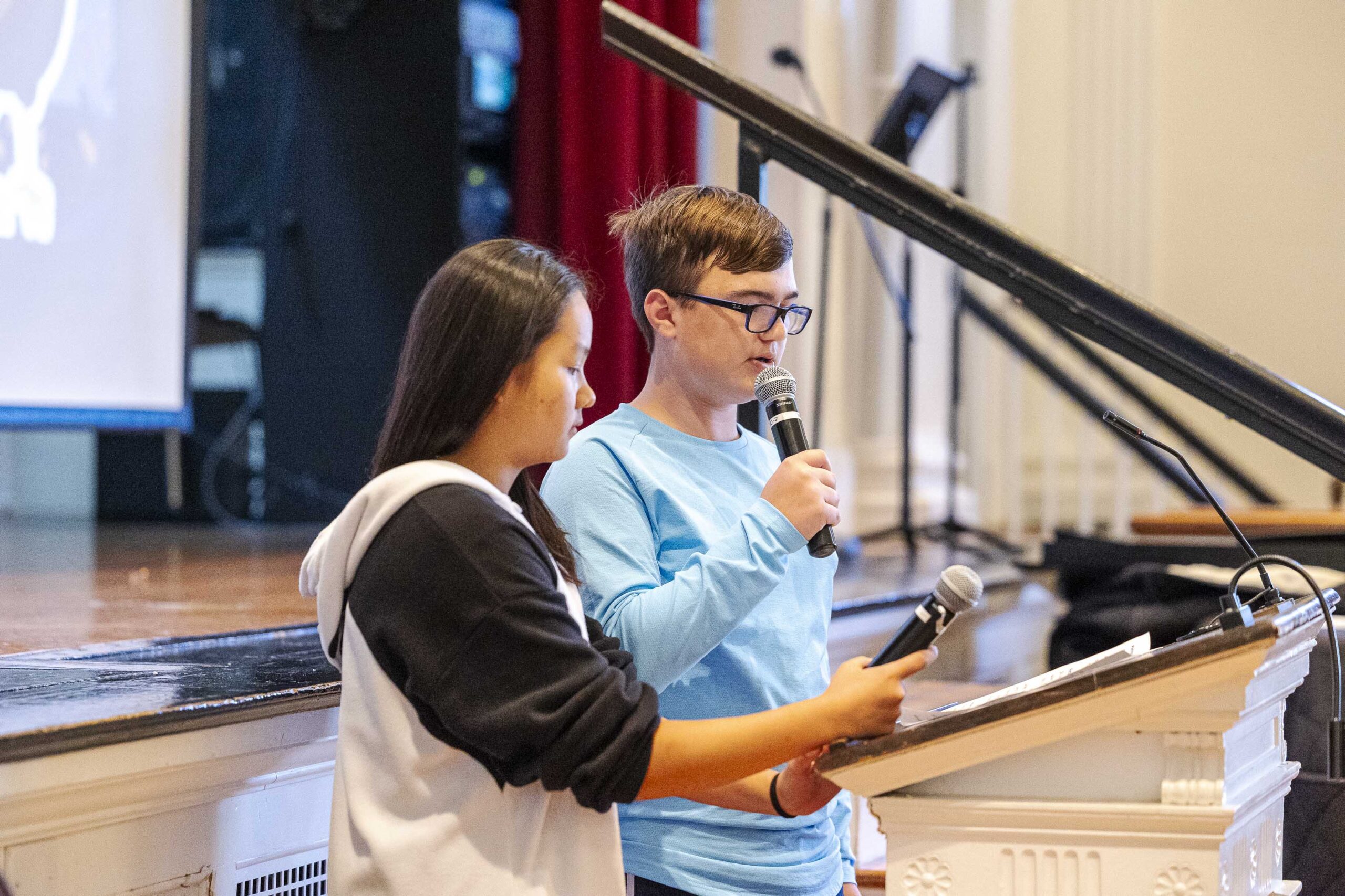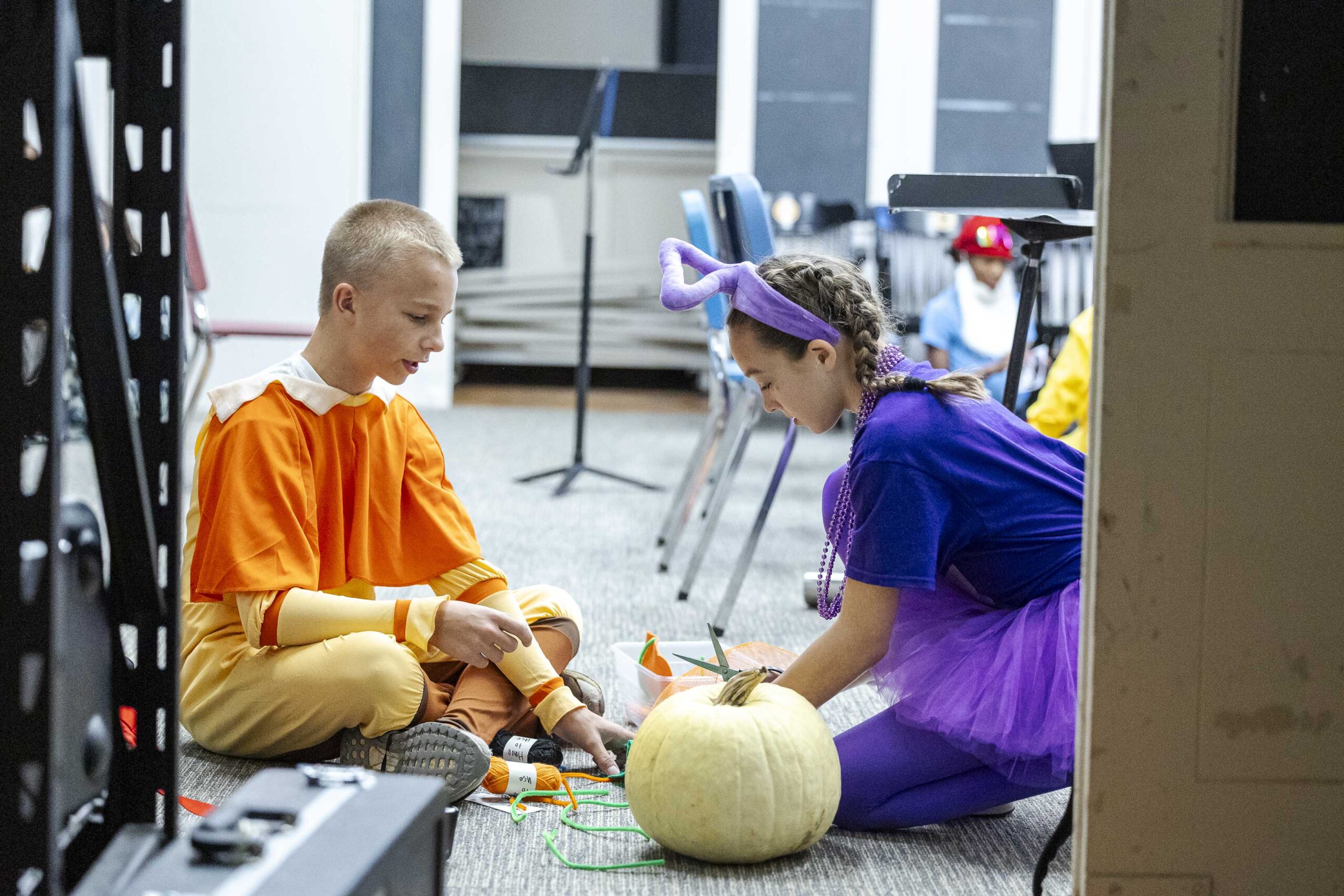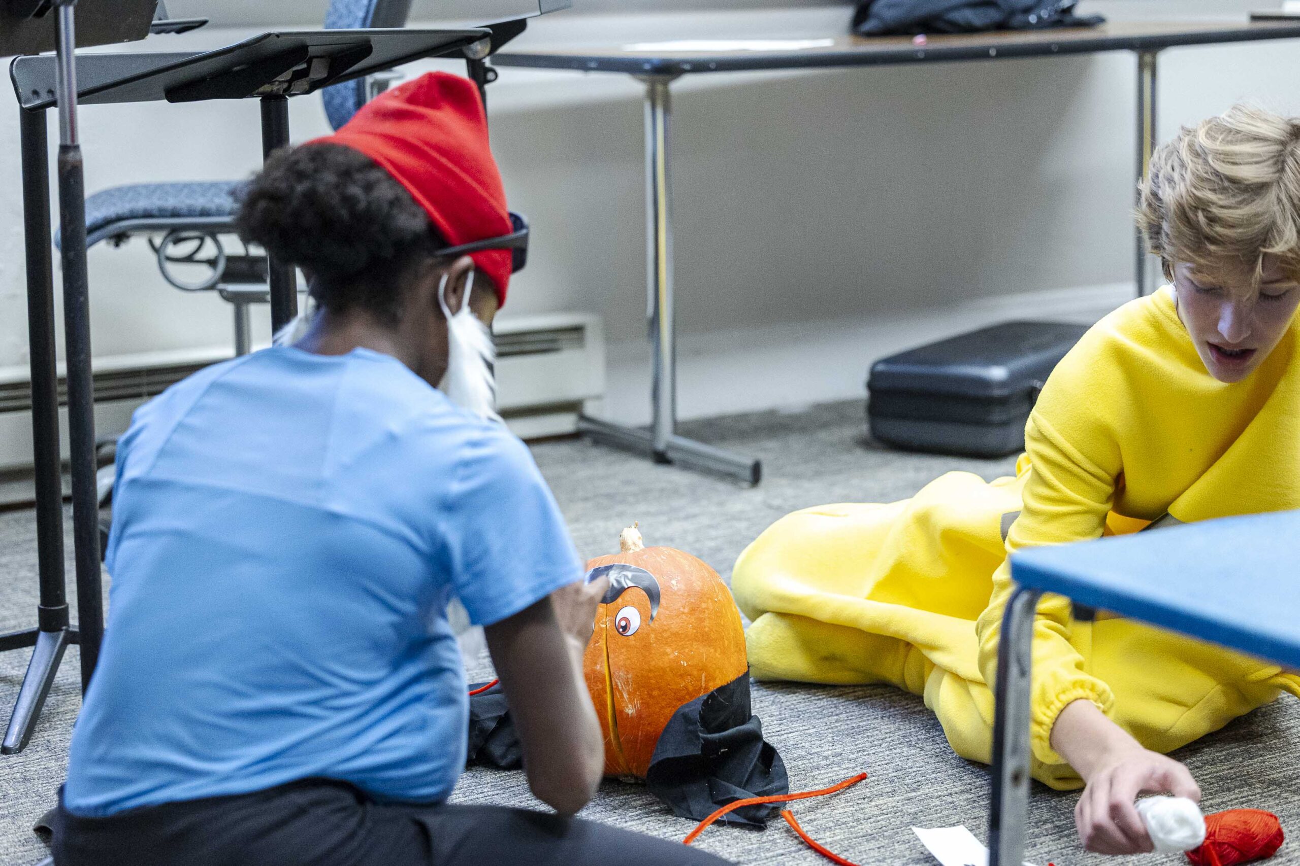 As the school day wound to a close, Middle Schoolers assembled in Mary Eliot Chapel for an assembly. Student leaders selected two schoolmates from each grade to come to the front for a pumpkin decorating contest. Teams received a pumpkin, a decorating kit, and an assigned “creature” and headed backstage to get to work. They could use only the supplies in their kits, and they were required to use a “mystery supply” no matter what. They knew their pumpkins would be judged for creativity, attention to detail, and thematic execution.