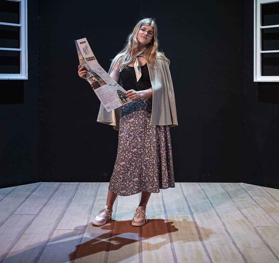For Tommy Kastor ’28, who played one of the museum’s security guards, character development extended beyond the rehearsal room. At the suggestion of Huber, Kastor took a trip to a local art museum—not to look at the art, but to study the guards.