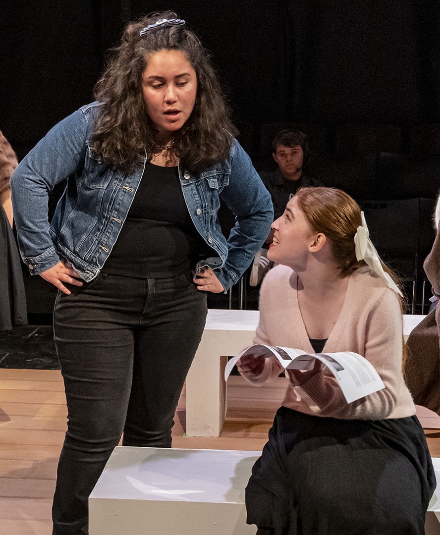 Laila Holmes ’28 added, “The first thing that came to mind when I saw Julie’s lines was, ‘This girl is definitely Sharpay Evans, a character from High School Musical. I imagined a total daddy’s girl, but at the same time, I imagined her being a stronger, confident, and professional woman. So, I created a character that was a mix of Elle Woods from Legally Blonde with Sharpay Evans, without all the pink, because you can be strong and show your feminine side without relying on the color pink.”