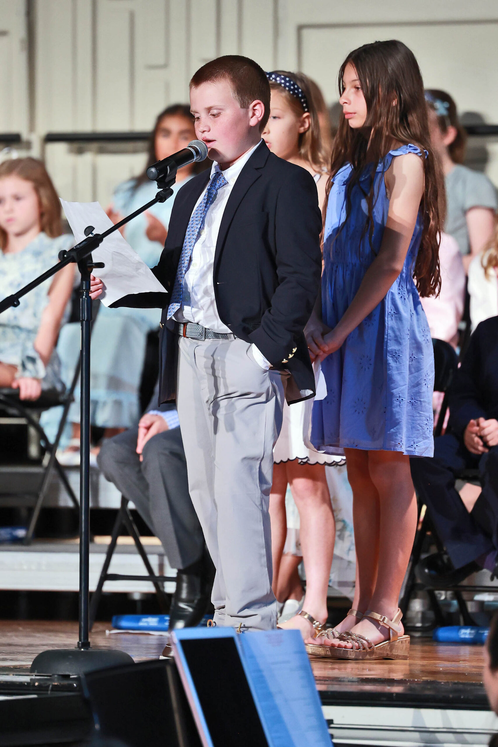 Head of Lower School Amy Scheer then took to the podium to share her thoughts with the Class of 2033. She said, “Yesterday, in our rehearsal, Dr. Nichols complimented you on your ability to improvise, and the theme of improvisation is a perfect way to wish you well and send you on your way to the Middle School. Improvisation means to make things up as you go, to figure things out in the moment, to fall back on the knowledge and skills that you have to solve the problem right in front of you. It doesn’t mean being unprepared; it means being ready for anything because you trust yourself, and you know how to listen, think, and try.