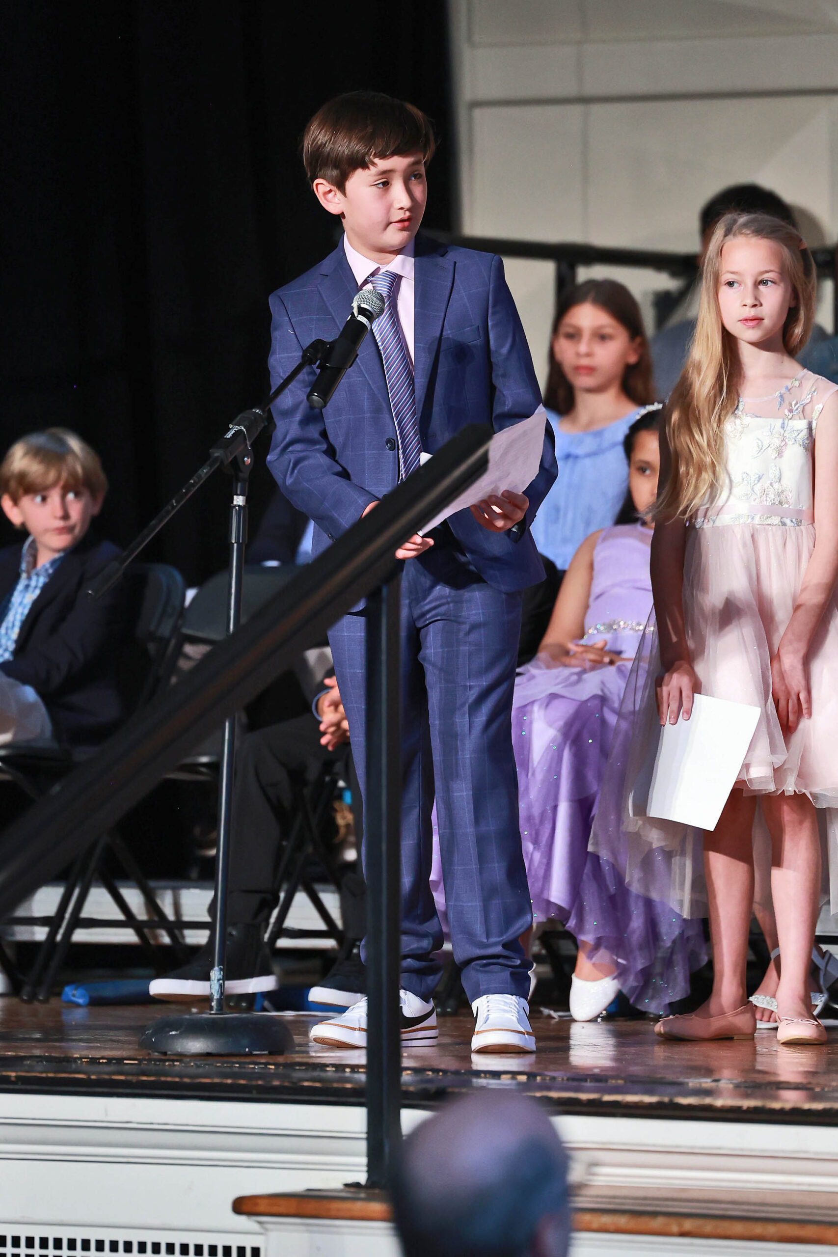 Scheer then read each student’s name as they walked across the stage to shake Mr. Rainey’s hand and accept their fourth-grade recognition certificate. The soon-to-be fifth graders then asked the audience to stand with them again while performing one final song: the MICDS Alma Mater.