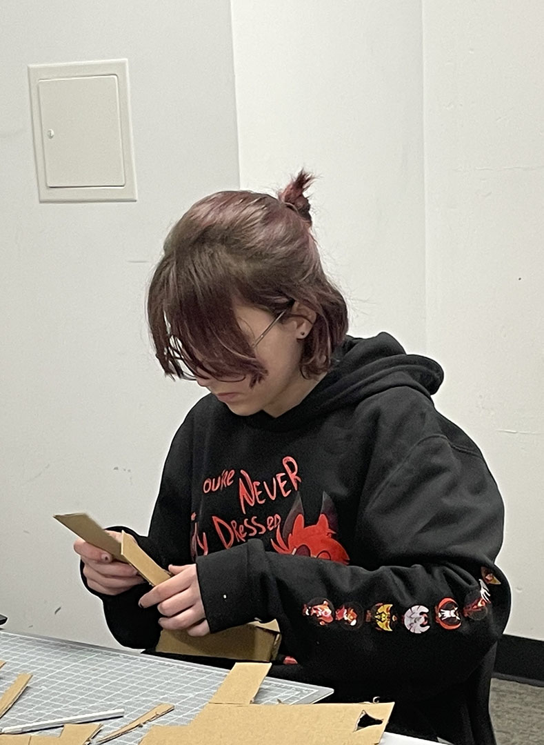 All of the students in the technical design program for Winter Term have been working together by helping each other finish things and cover things that their classmates might not have been able to get to or finish. This course has a lot of collaboration involved in it, whether it is holding up a model so a classmate can hot glue something or having a conversation about what to work on next, all of the students in Techies – Producing a Show worked hard and collaborated to make the show as good as possible by making costumes, making makeup design and doing the makeup, and doing lights and sound.