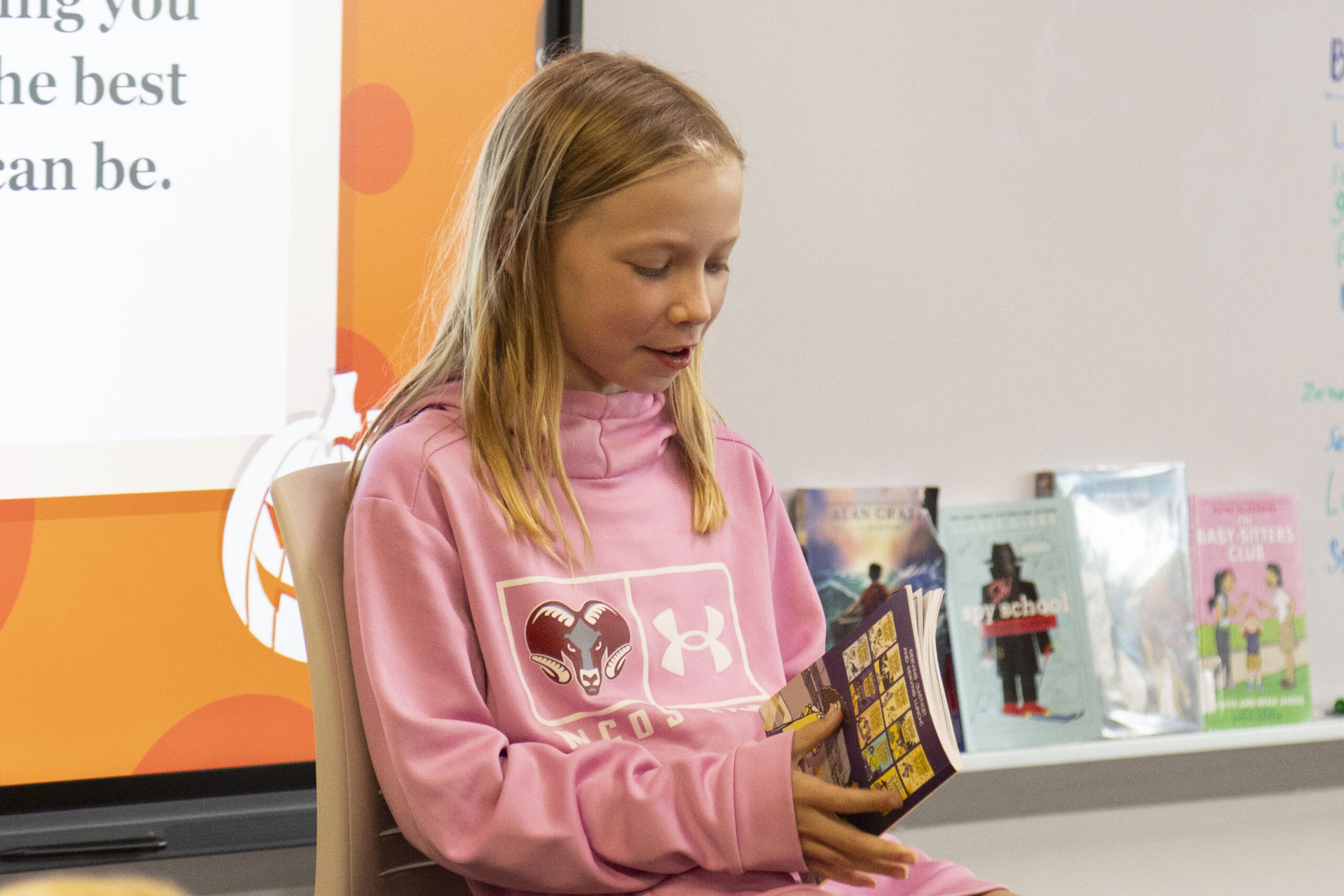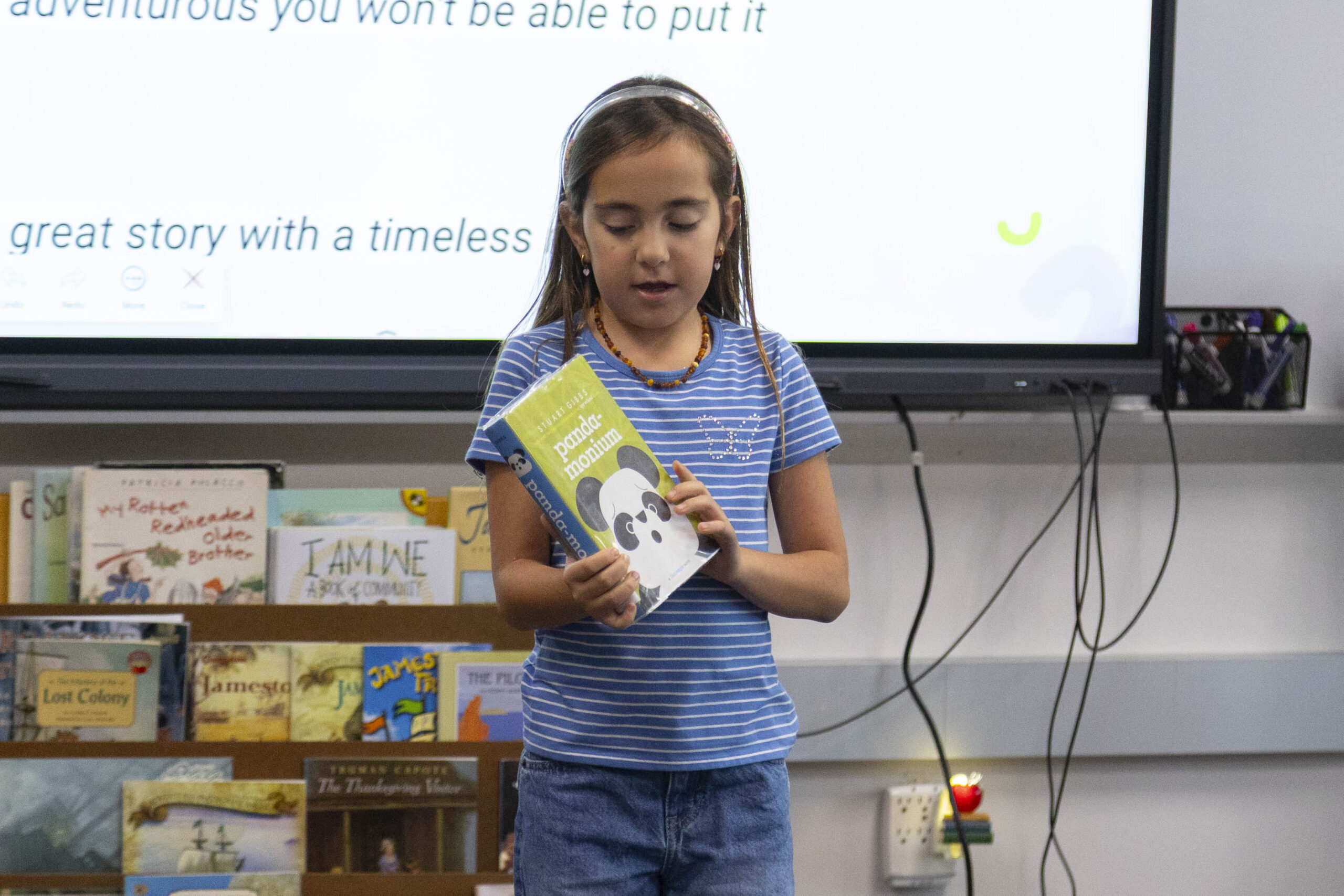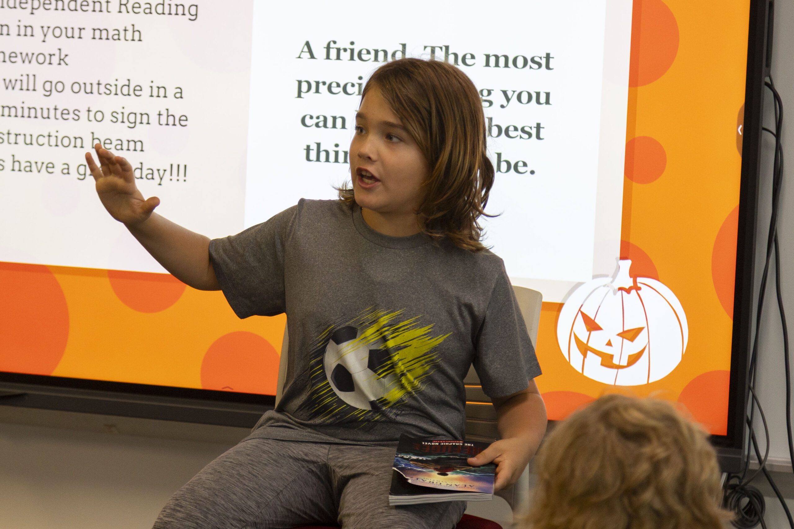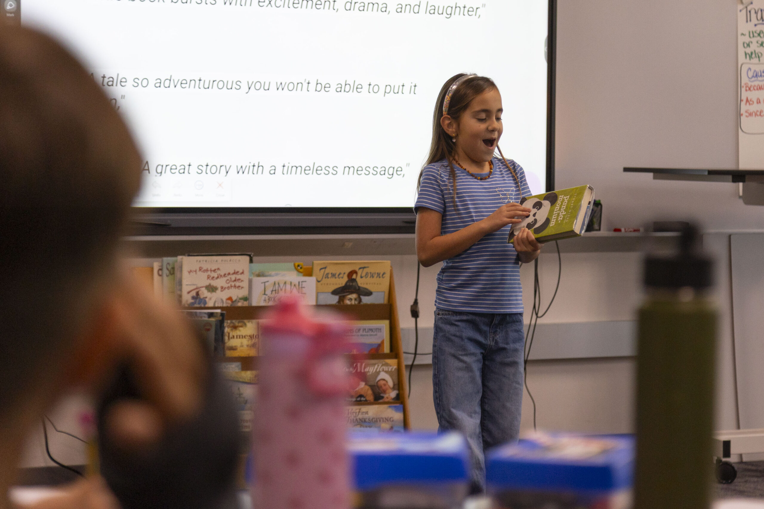 Beyond new genres, students practice presentation skills and persuasive speech while getting comfortable speaking in front of an audience. Additionally, they work on listening, critical thinking, and analytical skills as they answer questions from the audience on the fly about which book in a series they like most or how the main character compares to another character. The Book Talks also fuel a genuine interest in reading. “I had several parents remark at Fall Conferences that their child seems so much more excited about reading this year and was actually choosing to read at home,” adds Ms. Waters.