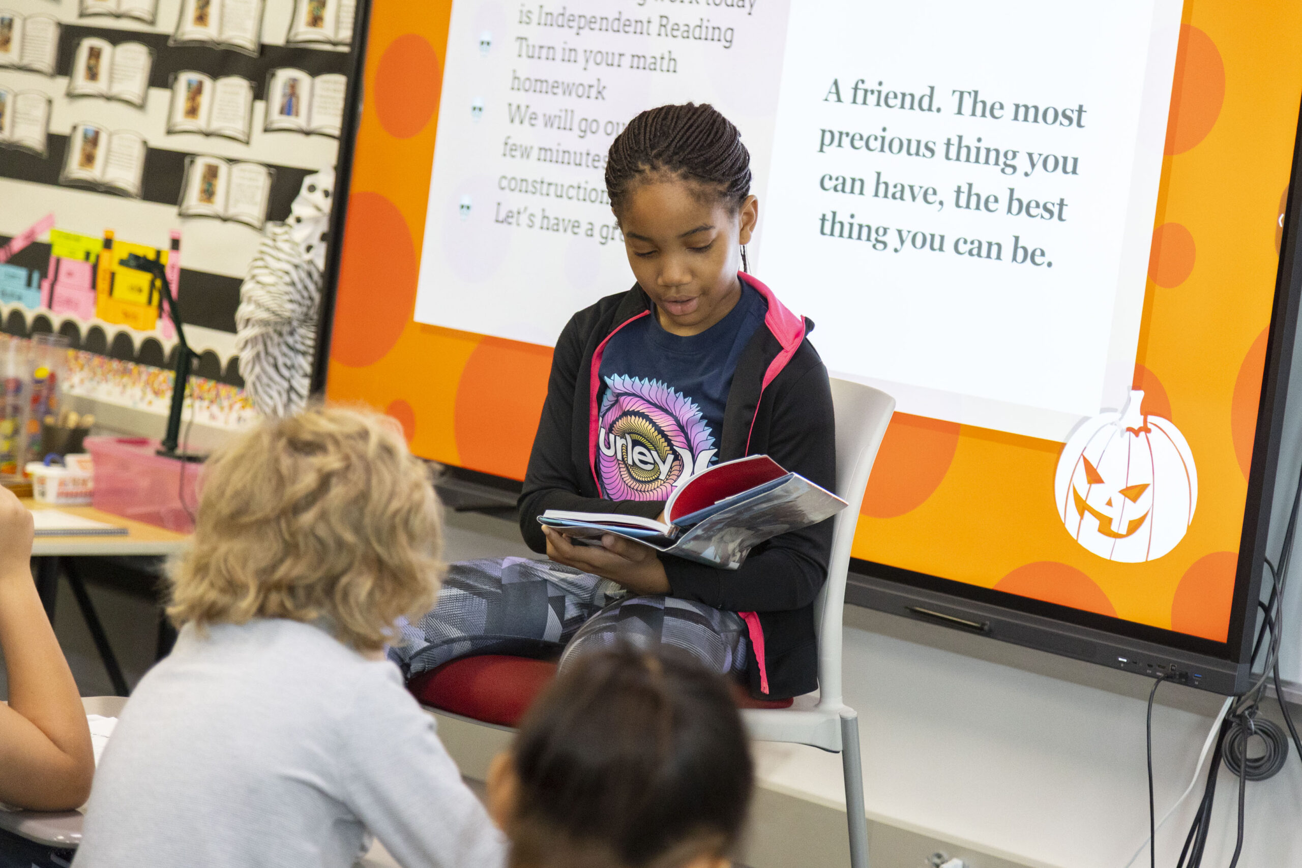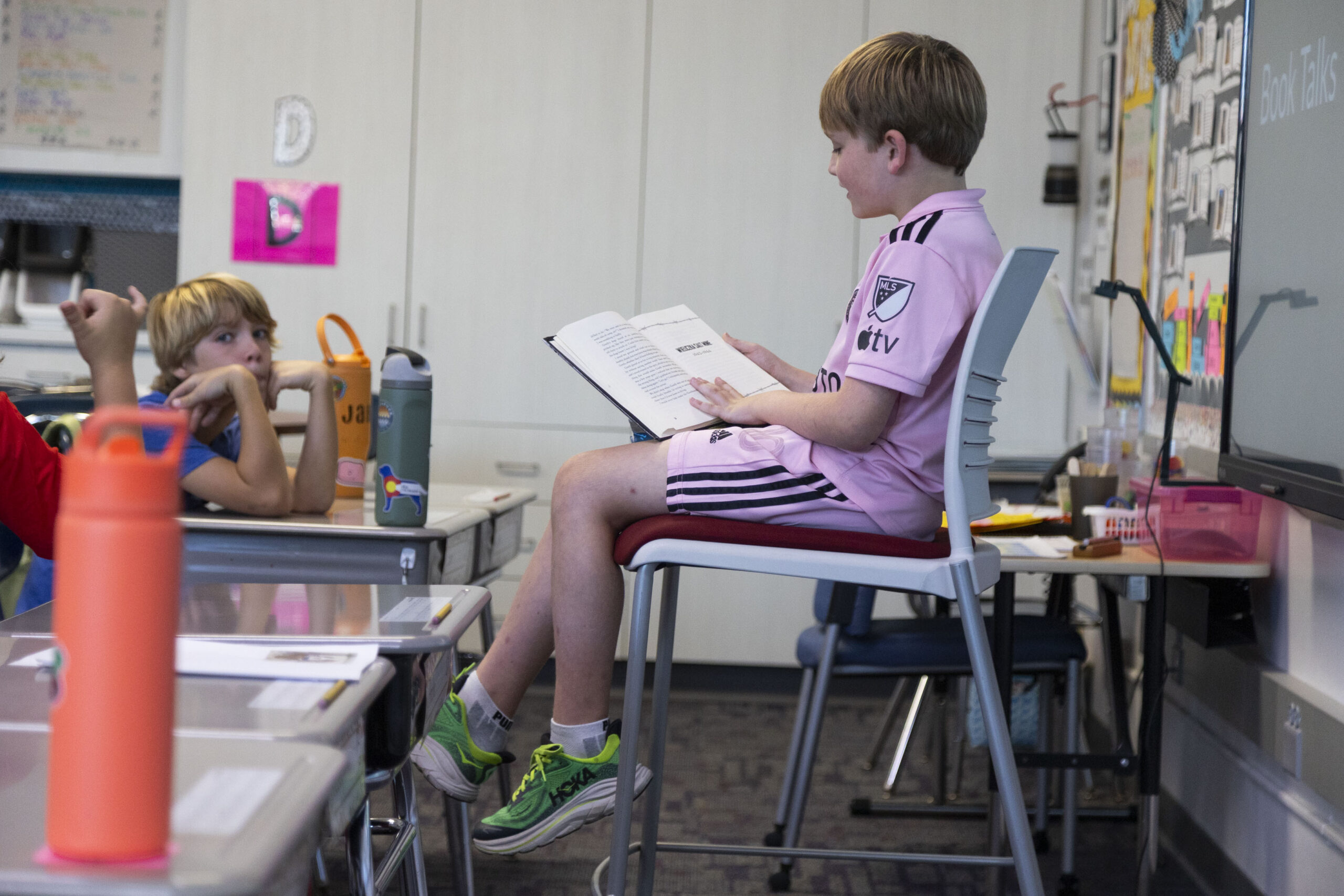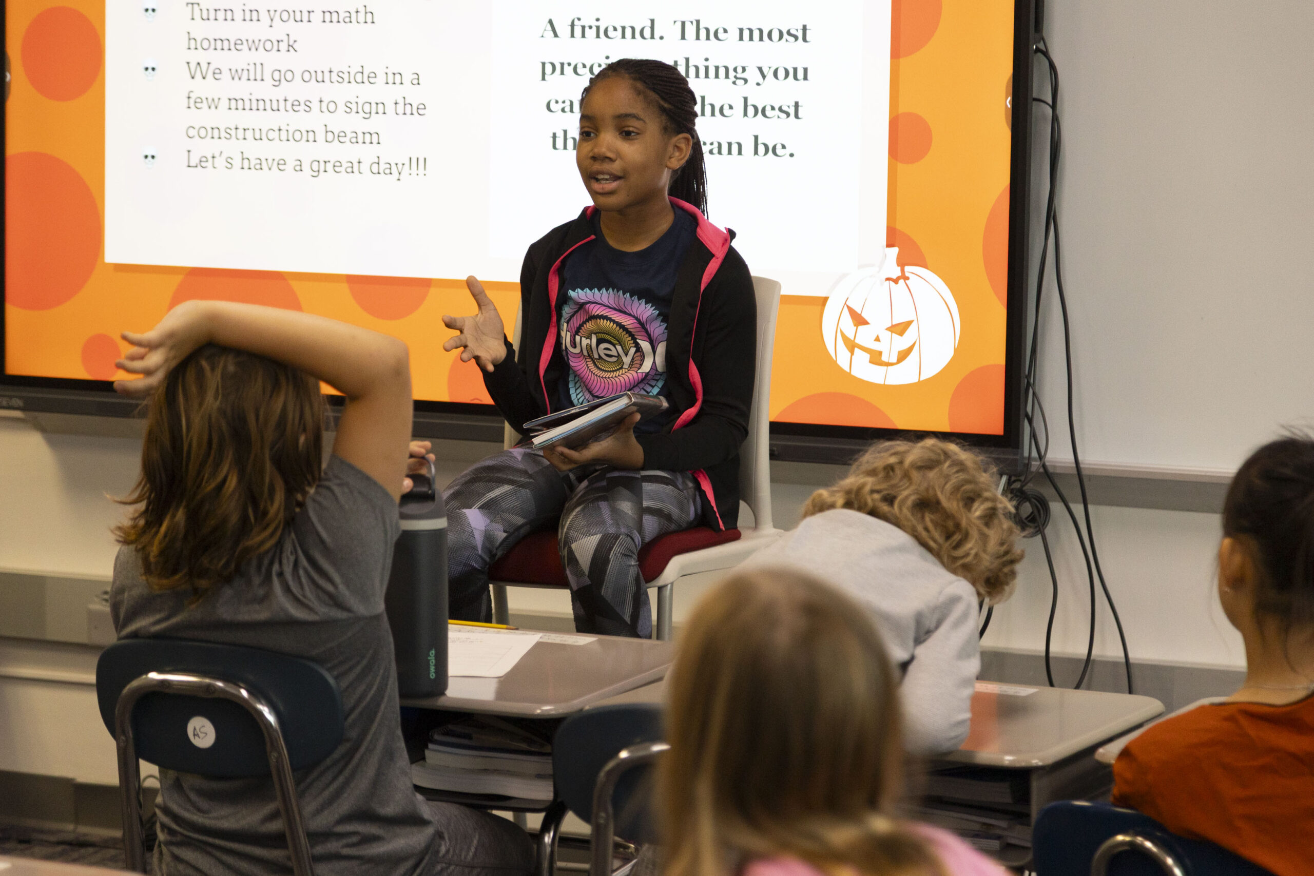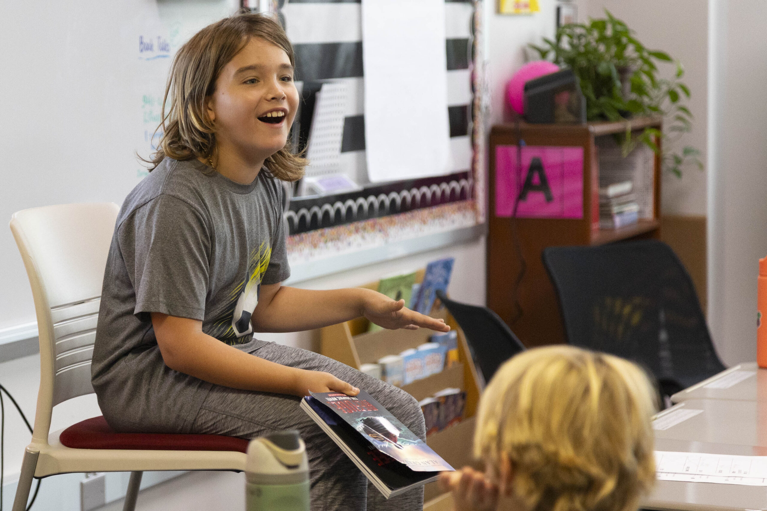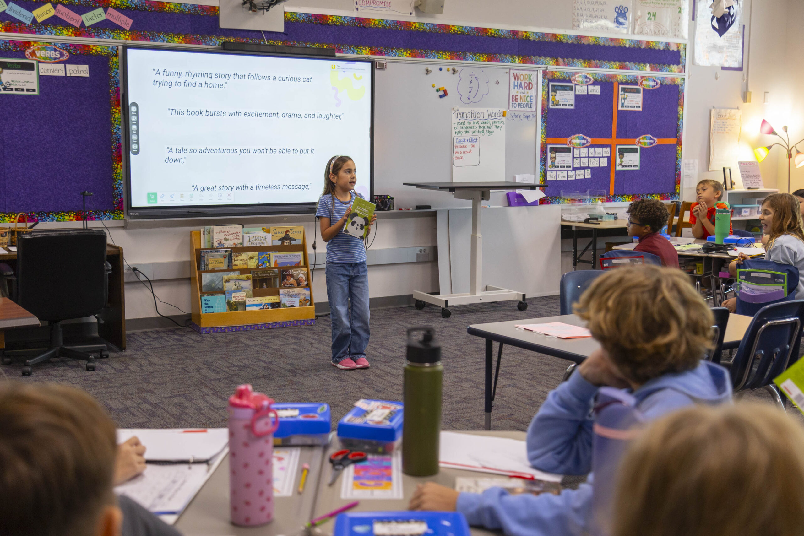 Beyond new genres, students practice presentation skills and persuasive speech while getting comfortable speaking in front of an audience. Additionally, they work on listening, critical thinking, and analytical skills as they answer questions from the audience on the fly about which book in a series they like most or how the main character compares to another character. The Book Talks also fuel a genuine interest in reading. “I had several parents remark at Fall Conferences that their child seems so much more excited about reading this year and was actually choosing to read at home,” adds Ms. Waters.