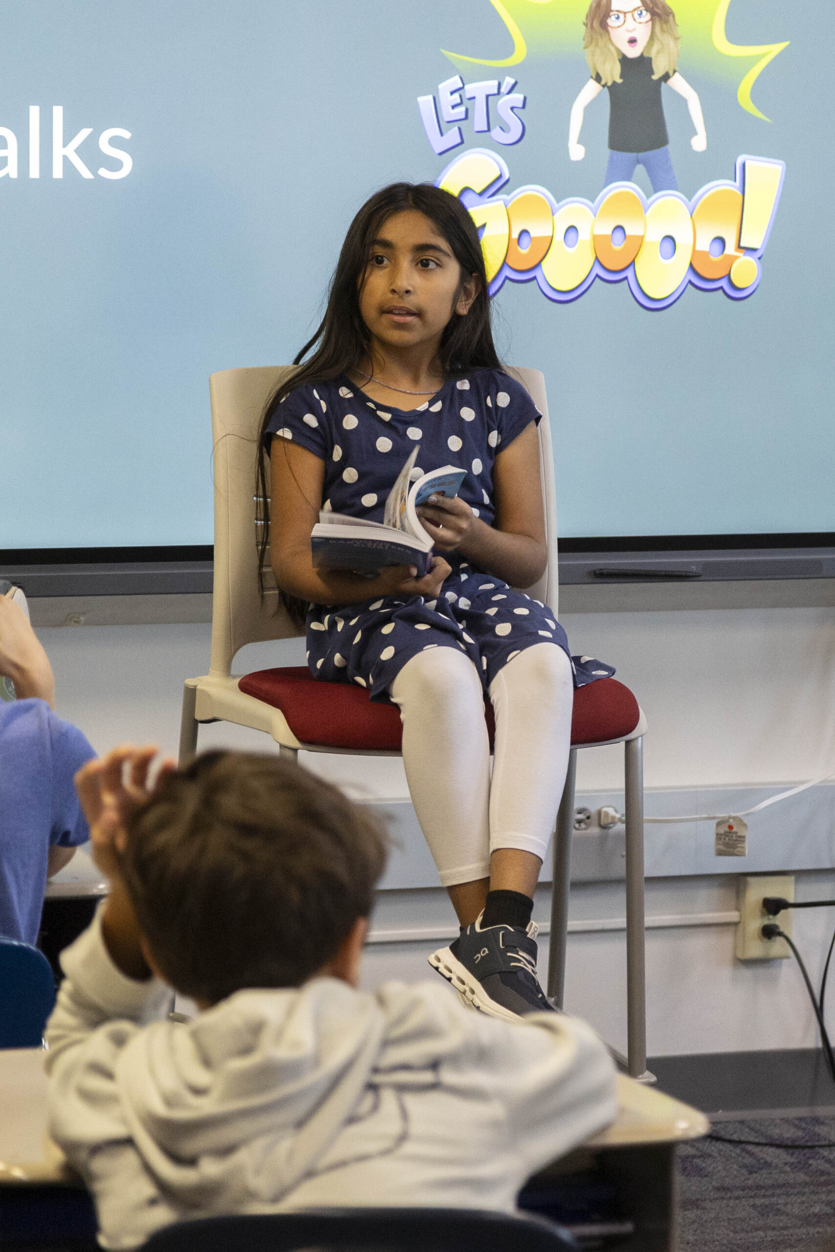 As for its goals, Book Talks help students grow in a number of ways, both as readers and as students. First, they get exposed to different authors and genres through the volume of books shared. “I first really only liked picture chapter books like graphic novels,” details Alexander O. ’34. “Now, I’ve seen that there are other good books in this world, and I’ve been reading soooo much more. I thought only graphic novels were cool, and I only read them. Now that other people are telling me about books, which nobody ever did, I’m like, ‘Wow, I actually want to read this book!'” Merit O. ’34 agreed. She said, “At first, I only wanted to read graphic novels and mostly picture books, but now I’m seeing all of the things that people bring up to show to us and I’m like ‘Woa, I actually like this book!'” The world of reading for Emily G. ’34 has opened up as well. “I like getting to expand which genres I like. Before, I liked a little bit of realistic fiction and a little bit of historical fiction, but now I like more fantasy.”
