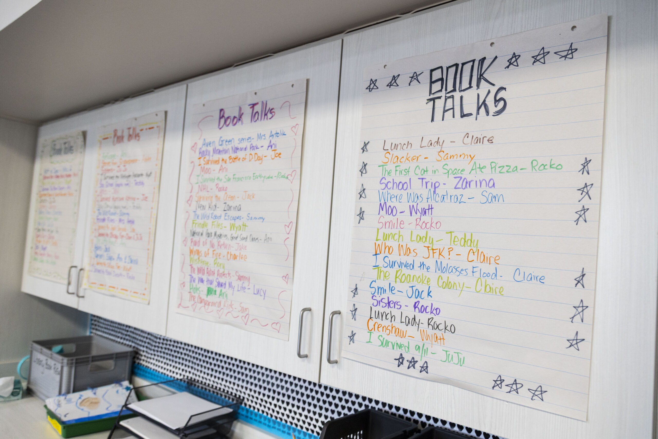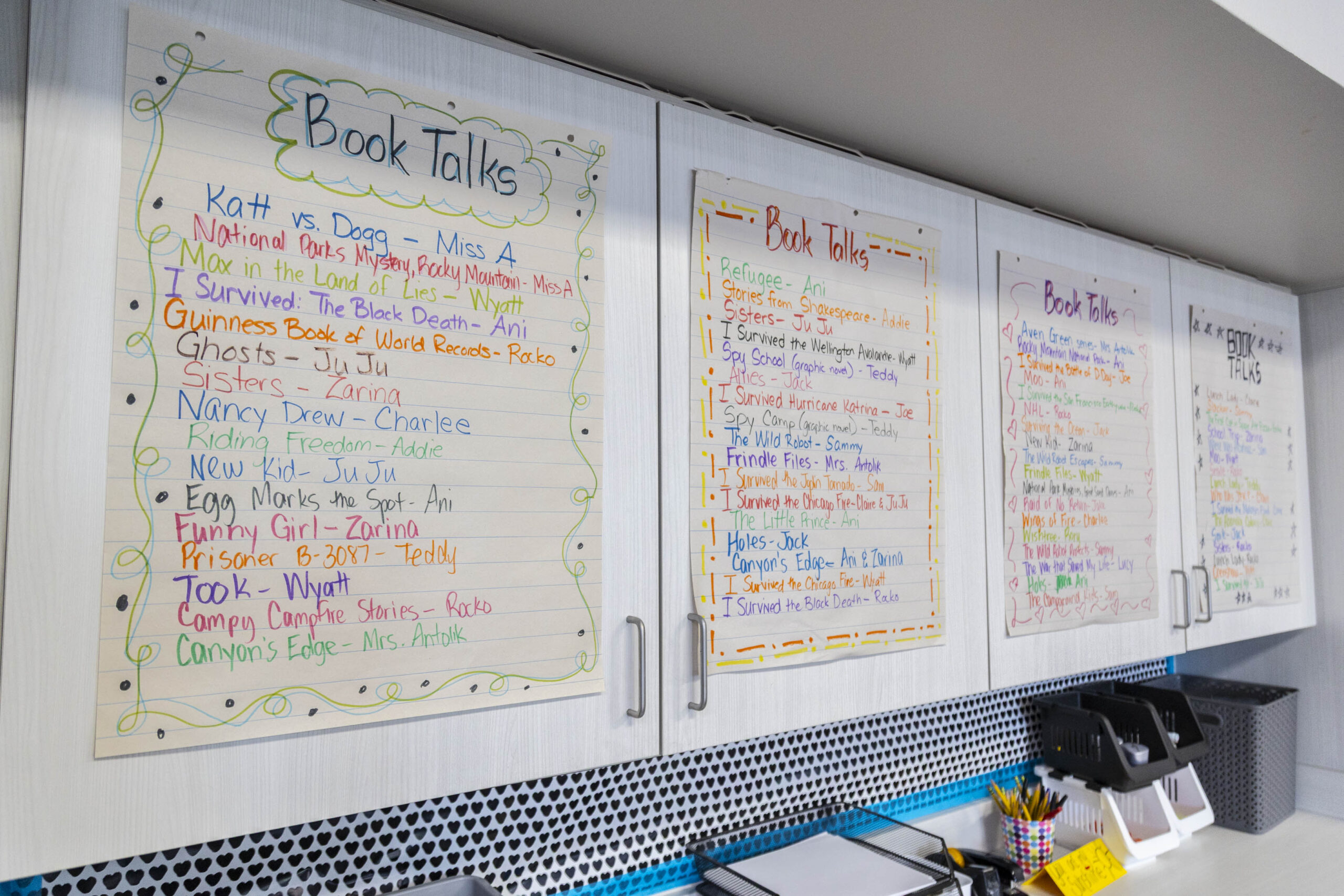 Through the years of Book Talks, Ms. Antolik has developed a few quick hacks that help keep the reading going! She created posters that track which books have been talked about and by whom. Already, her class is on its seventh poster! Also, as students want to do future book talks, they write their name on a sign-up list on the whiteboard. “Book Talks take on a life of their own based on the personality of the kids,” Ms. Antolik states.