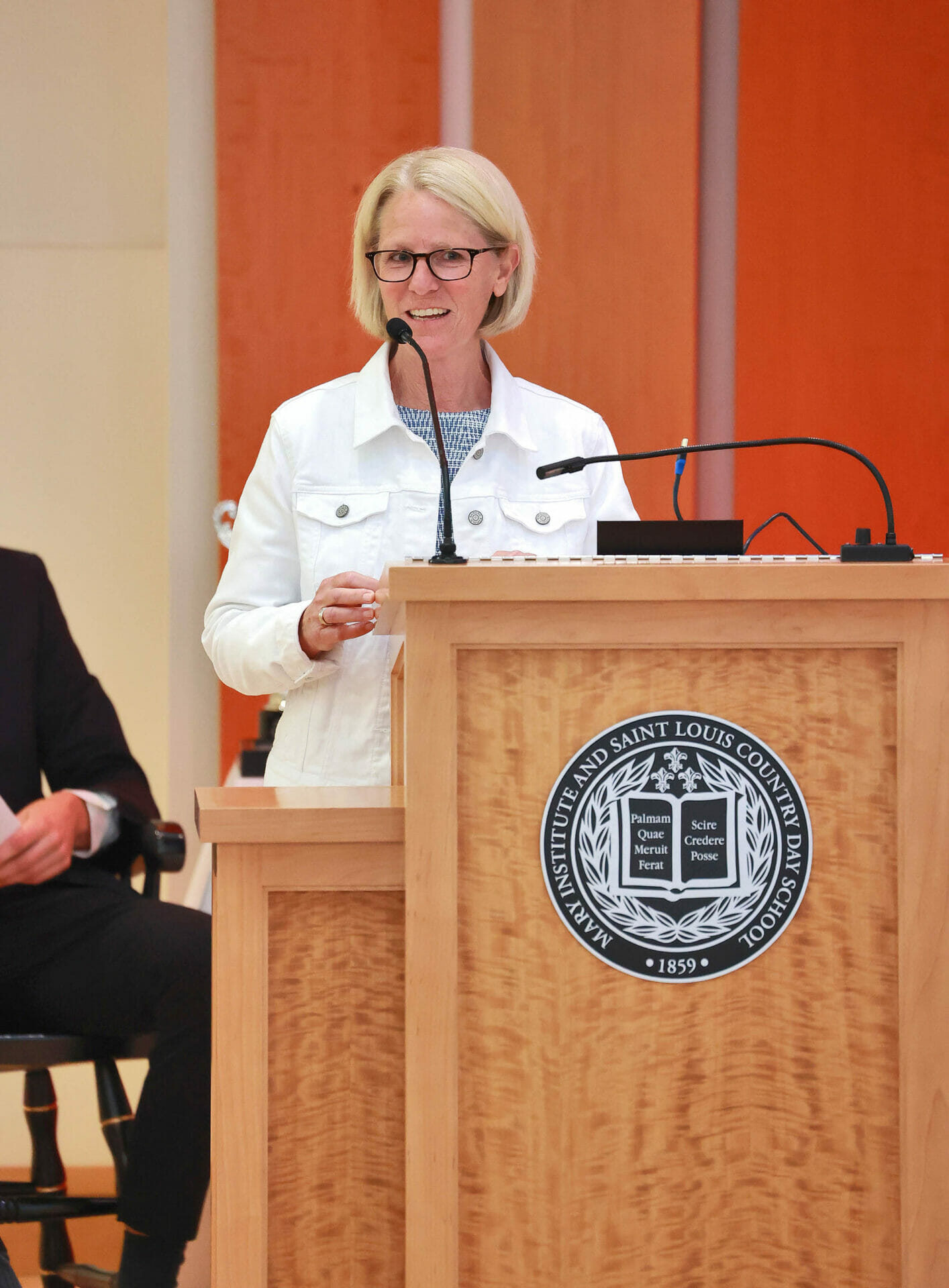 Peter Grace ’23 took to the podium to deliver remarks as the Class President, after which he thanked several members of the MICDS faculty and staff for their support, on behalf of the Class of 2023. He said, “The Class of 2023 would like to honor the special adults in our school community who have given so much to us over the last four years. We are grateful to Mr. Jay Rainey, Head of School, and Mr. Scott Small, Head of the Upper School. Thank you to our college counselors, Mr. Herrmann-Keeling, Ms. Wildman, Dr. Macam, and Mr. Essman, and to Ms. Menke in the College Counseling office.”