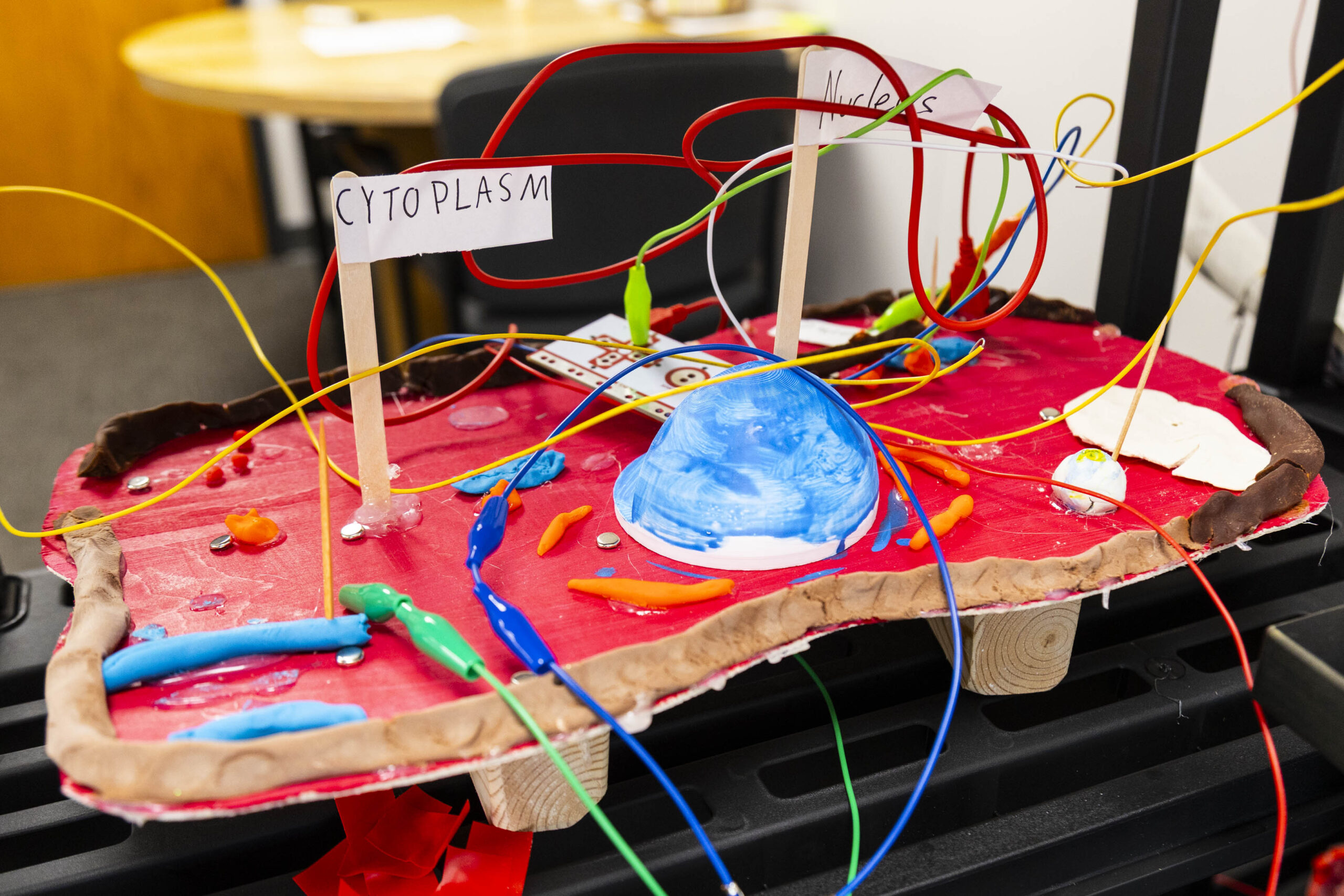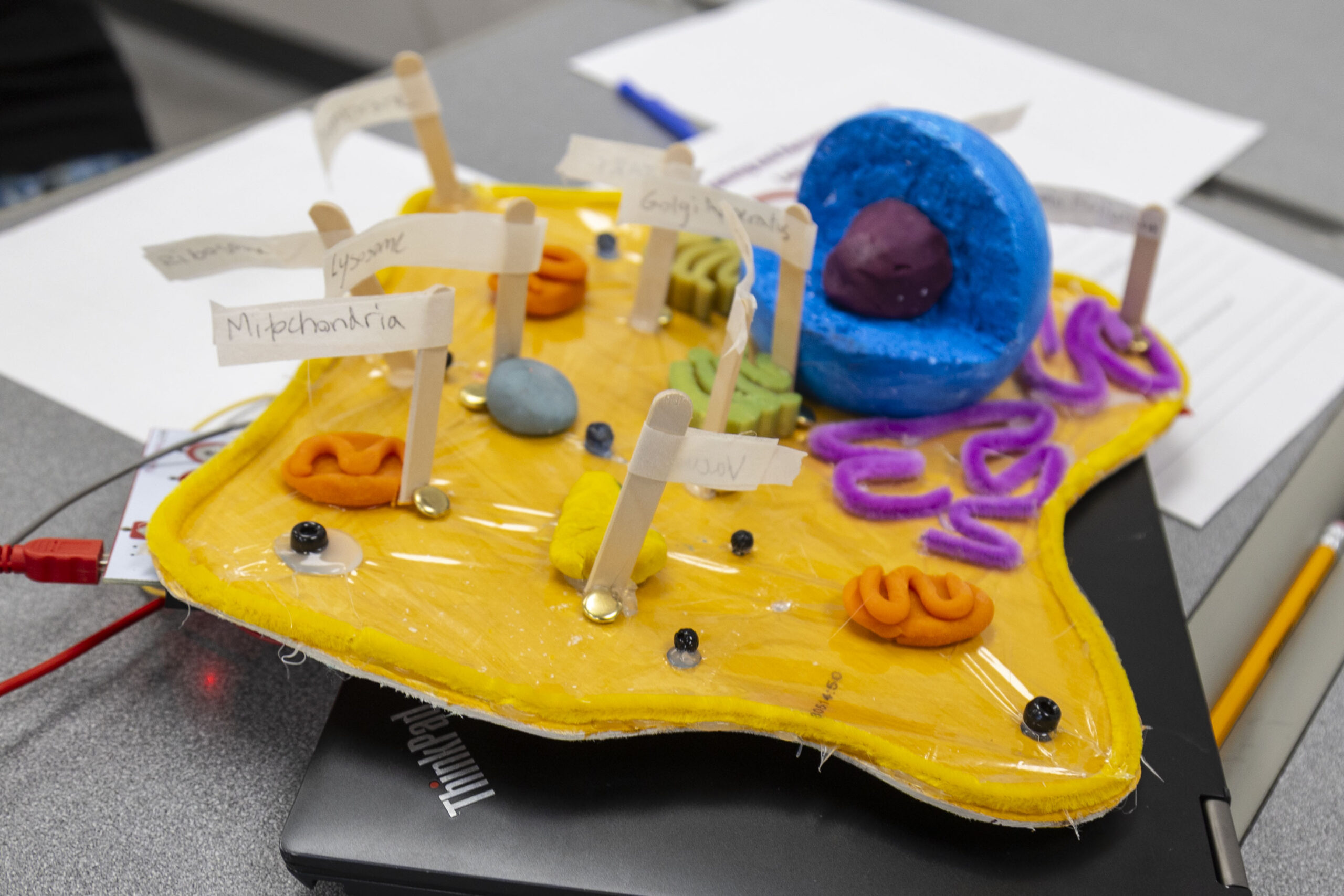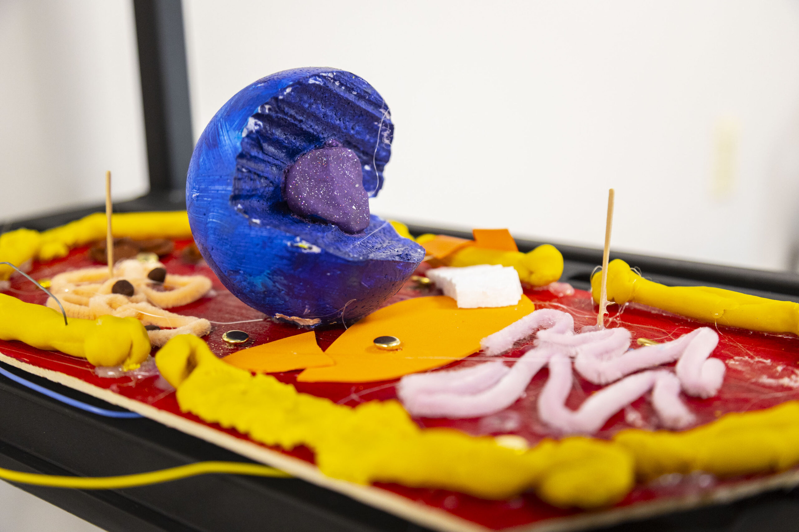 Over the past several weeks, seventh graders were challenged to design and create a unique, interactive 3D model of a cell during their unit on cells and cellular activity. First, they researched organelles, the specialized structures inside cells that perform specific jobs. Organelles serve various functions to help keep the cell alive, much like organs, such as the heart or liver, serve specific functions to keep an organism alive.