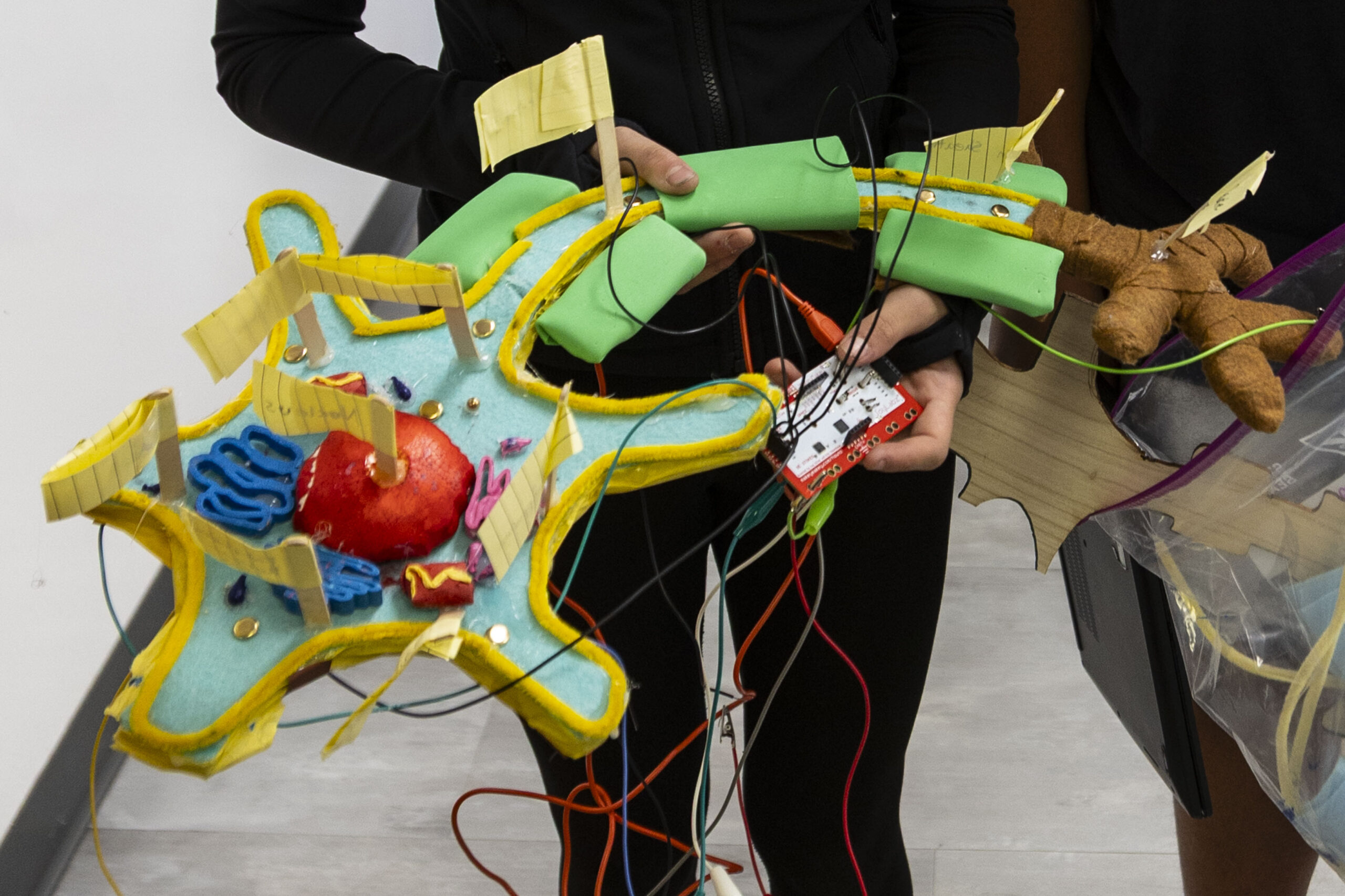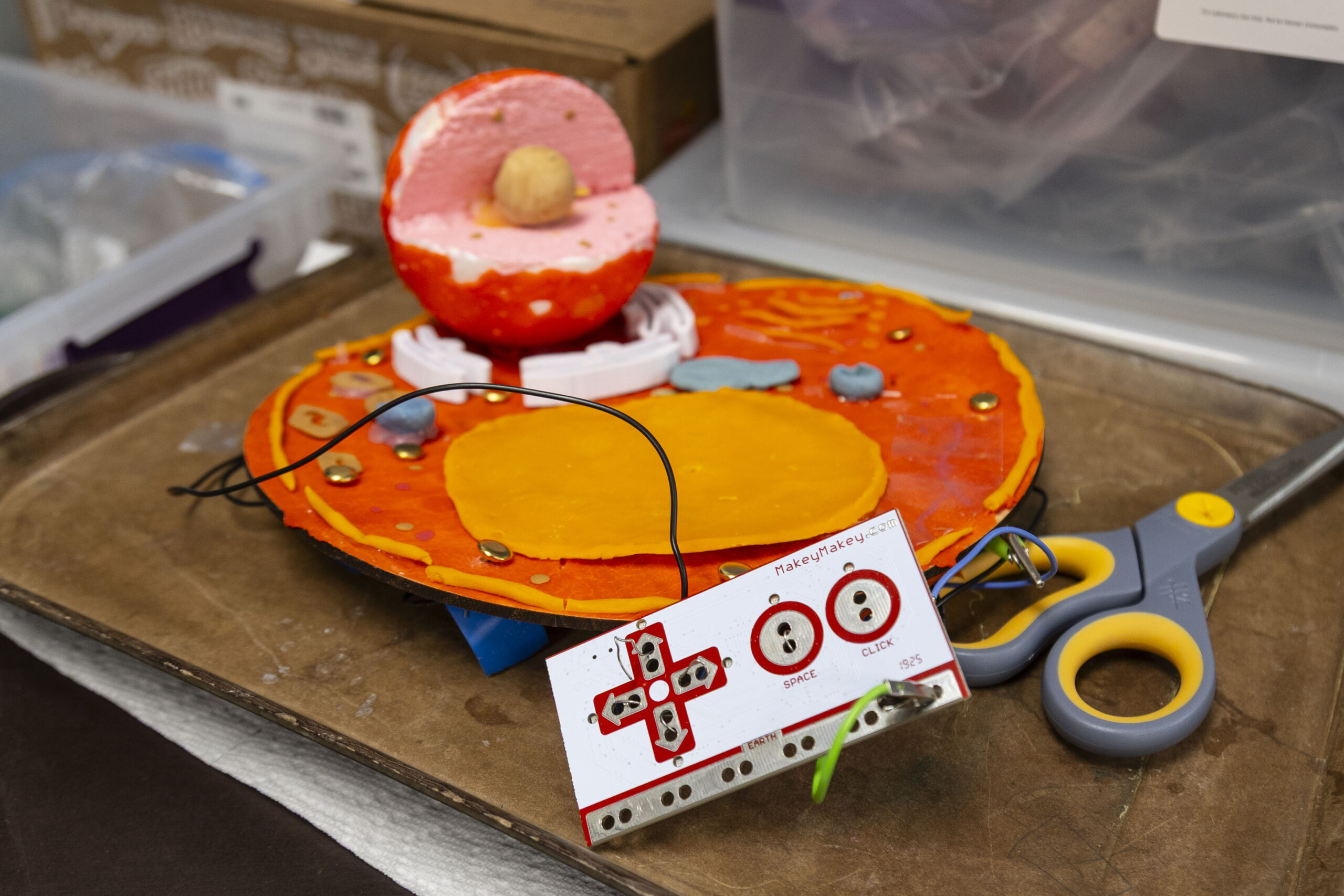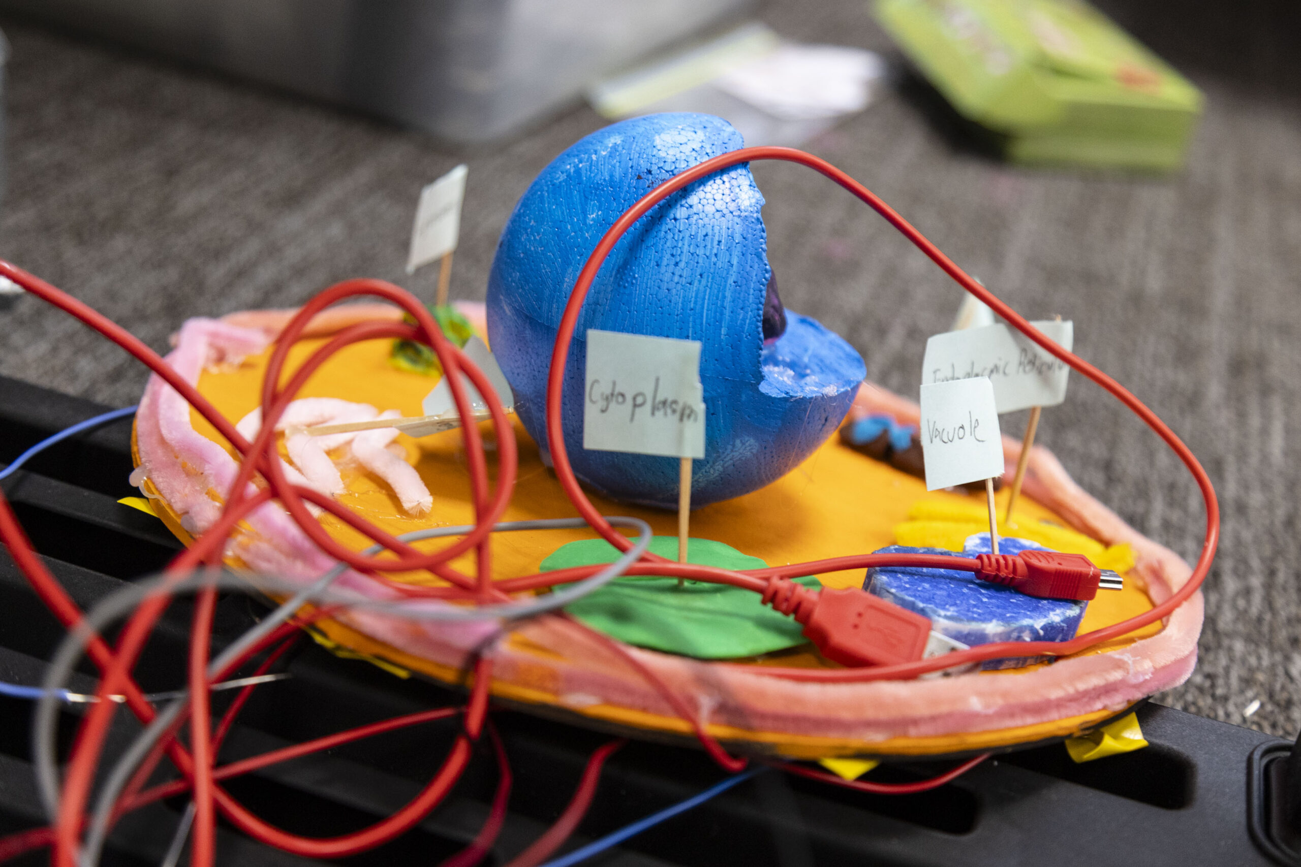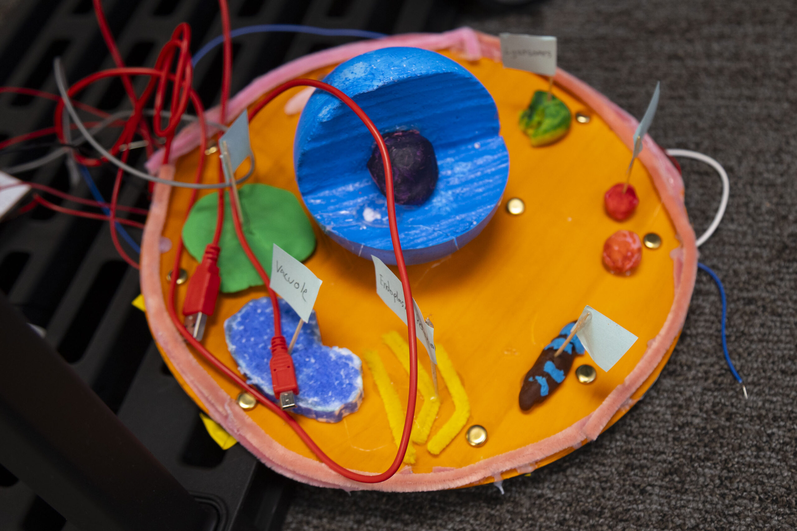 After some basic practice with the Makey Makey and Scratch tools, where some students even connected celery to the Makey Makey, which triggered the Scratch program to play the notes of Jingle Bells, students chose the type of cell for which they wanted to build their interactive model. They then went to the Middle School Maker Space to build their 3D cell models. They used a variety of materials from Play-Doh and styrofoam spheres to cardboard and Q-tips. They carefully incorporated materials that can and cannot conduct electricity in order to make their models interactive.