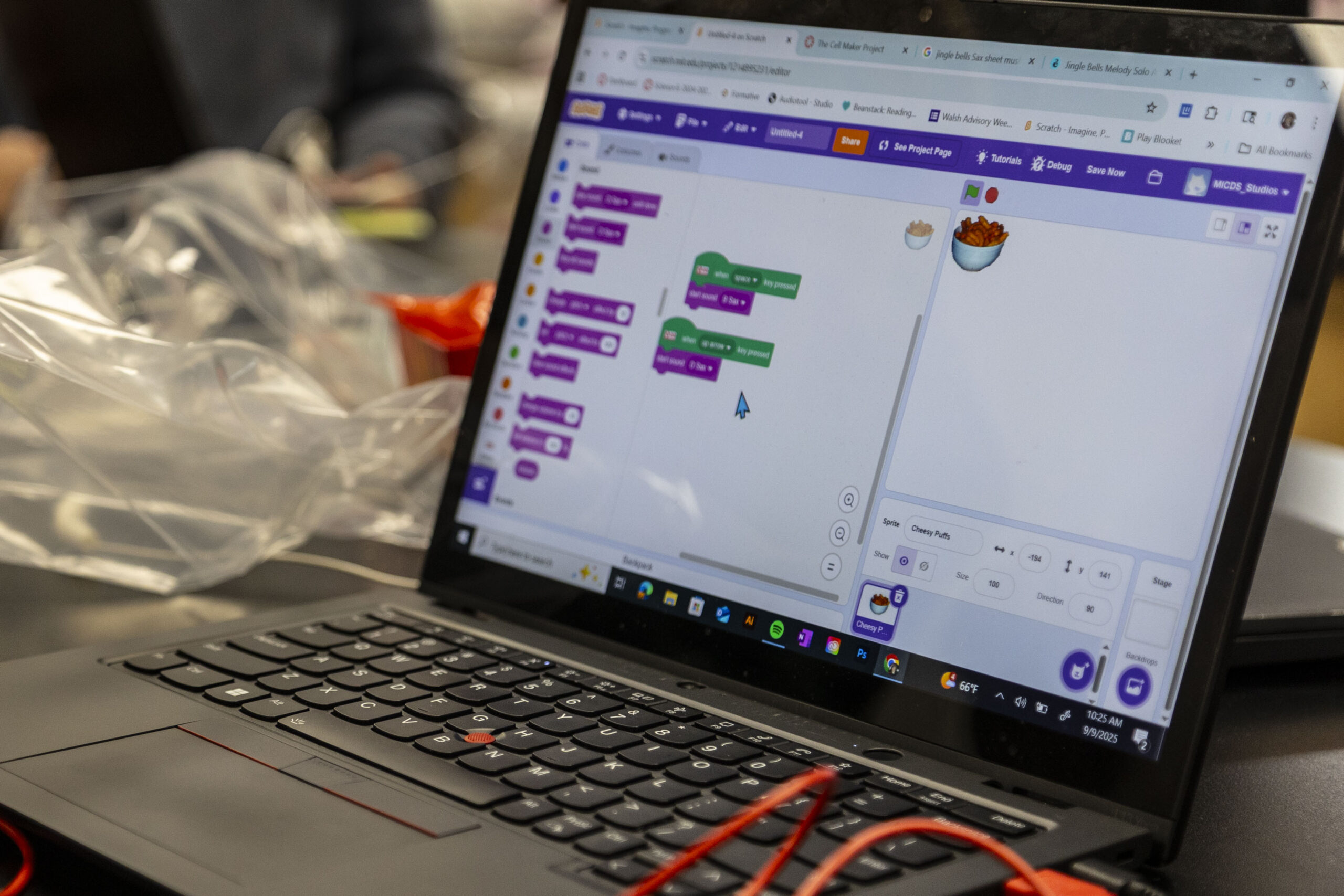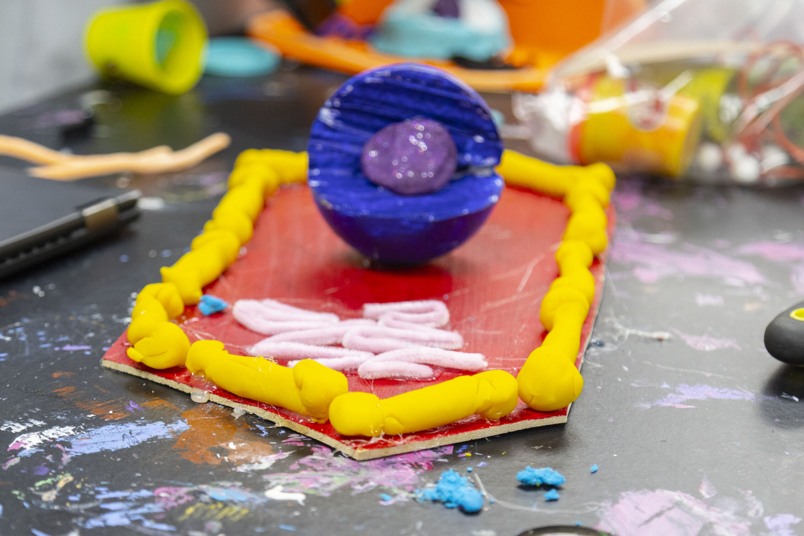 Once the models were finished, complete with bright colors and wires from the Makey Makey, students built out the Scratch programming so that each organelle, when touched, would trigger a set of events on the computer. Some such events included a recording by the student of the organelle’s name and function, a video diagram showcasing how the organelle worked, or both! For example, touching the mitochondria, Golgi apparatus, or endoplasmic reticulum on the model would set off a recording identifying and defining the organelle while a video diagram played.
