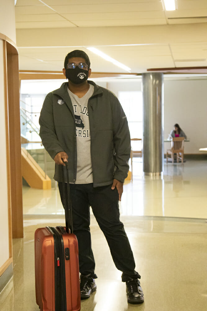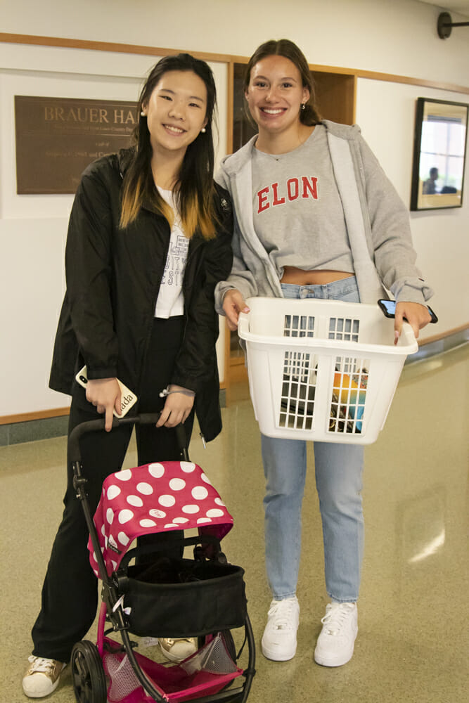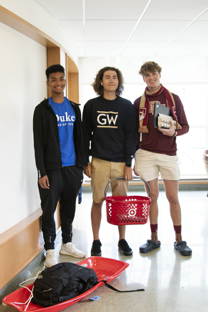 Decked out in their college t-shirts and hoodies, students participated in “Anything But a Backpack” day by carrying their laptops, books, and other sundry backpack items in non-traditional carrying devices. Students toted their backpack contents in snow sleds, egg cartons, pet carriers, traditional Japanese rice grinders, on an end table, and more. Students also enjoyed a buffet of delicious breakfast, lunch, and snack items all day in the lobby of the Steward Aquatic Center. They posed for photos and selfies on the 2022 “stage” while waving their college pennants and playing games outside the pool area.