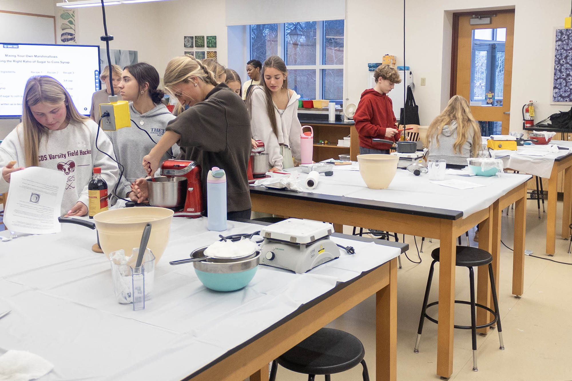 Each lesson pairs food preparation with chemical reasoning. Students investigate reactions such as caramelization and the Maillard reaction while actively making dishes themselves. “We learn about the chemistry of reactions in cooking… and then we make food and eat it,” says Dhruv Avirneni ’27. Cooking becomes an experiment: variables are changed, results are observed, and outcomes are analyzed. One example was when students were making marshmallows and each group had to use a different amount of corn syrup giving each batch a different flavor.