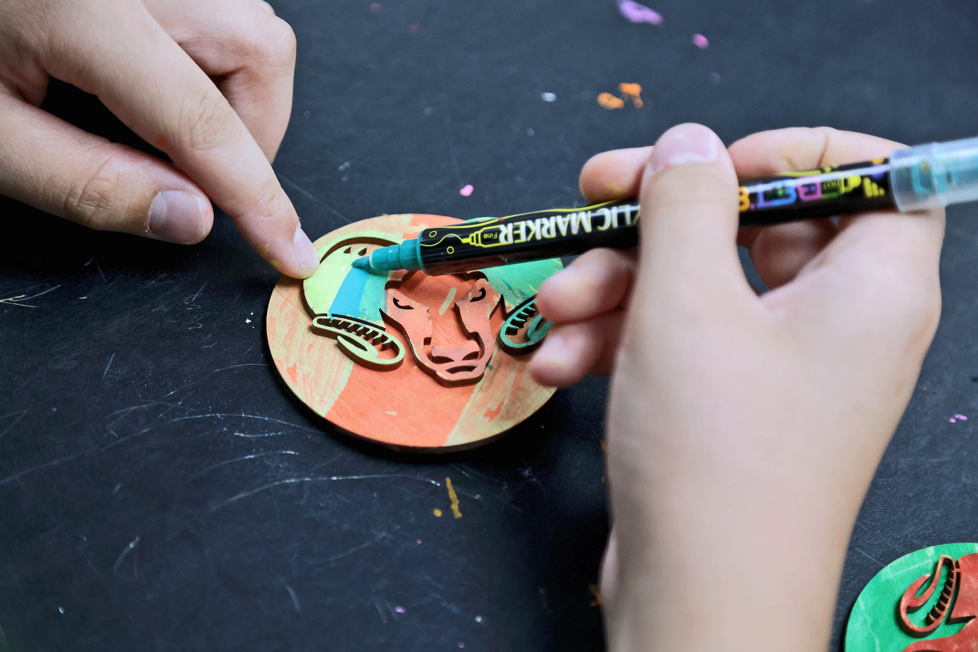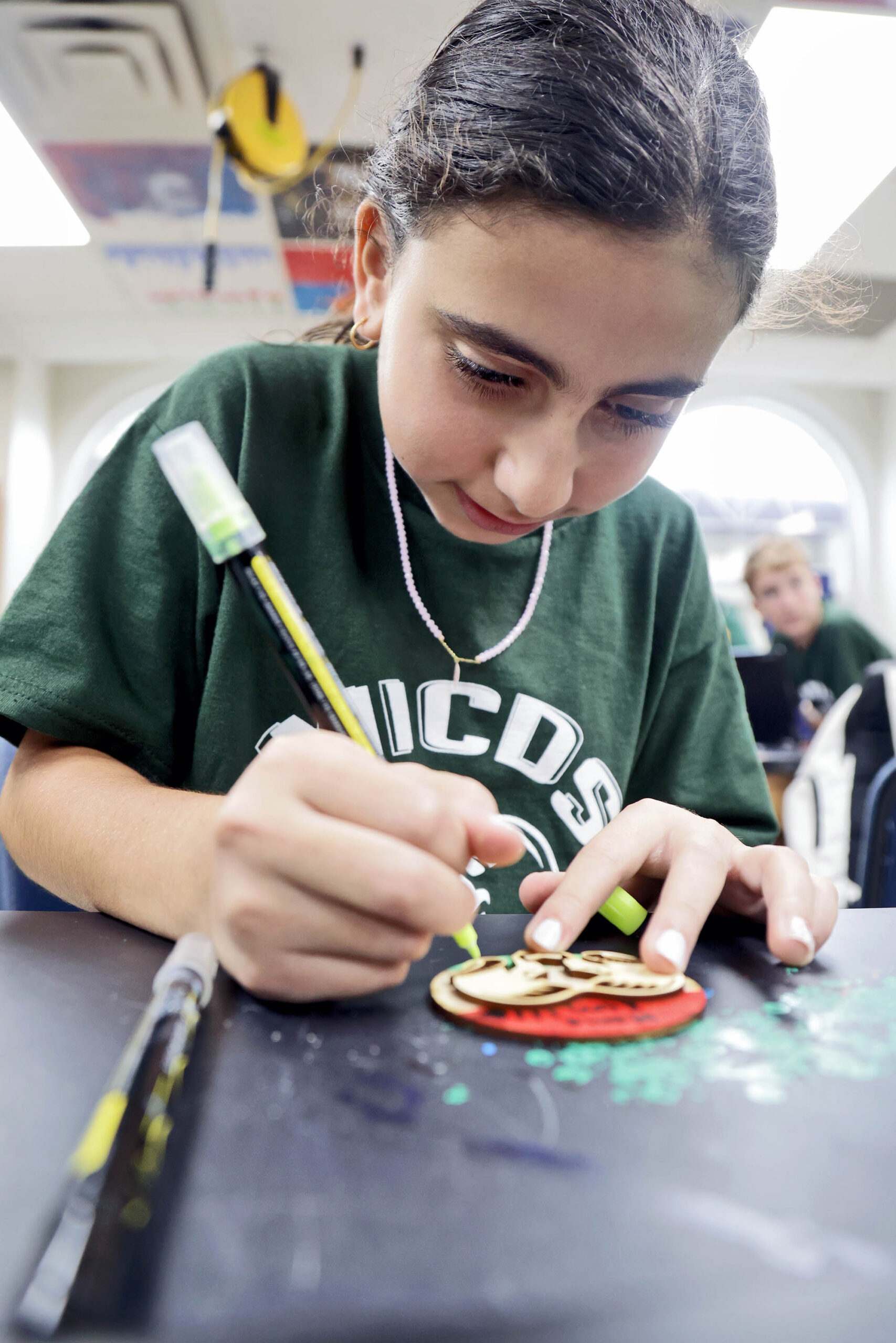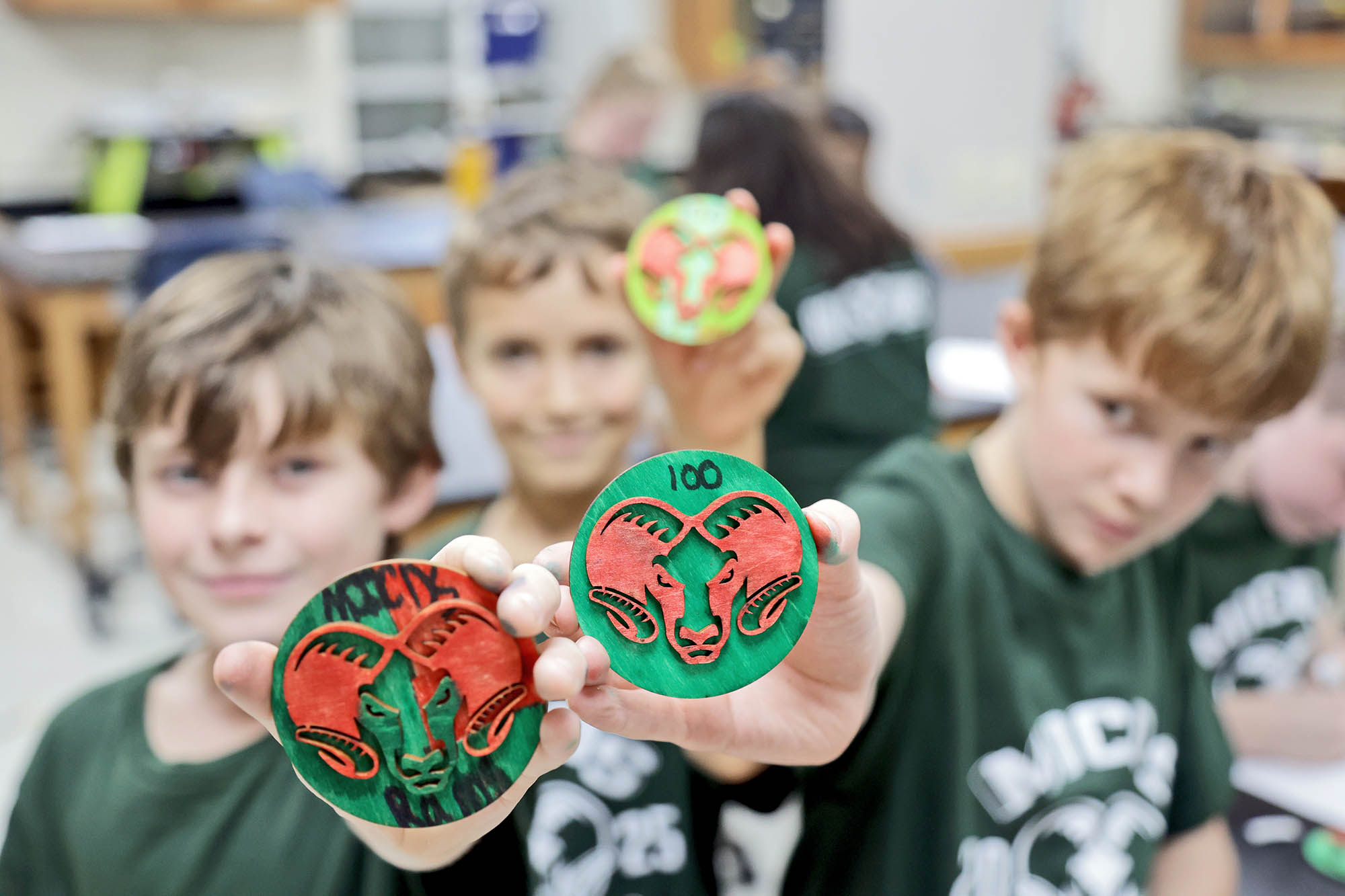 For the spirit magnet activity, Jones approached Middle School History Teacher & Makerspace Coordinator Blake Whitney for ideas on something the fifth graders could create, build, or decorate in 30 minutes or less. He laser-cut wooden circles and ram heads for the students to decorate and glue together to create a magnet for their lockers, allowing their creativity to shine through. Whitney said, “Anytime we can get the students using some of the amazing tools in the makerspace and creating a hands-on project, I think it is a winning situation. Homecoming presents the opportunity to combine school spirit with these tools. The magnets were a great way for kids to gain hands-on experience while also showing their school spirit. Go Rams!”