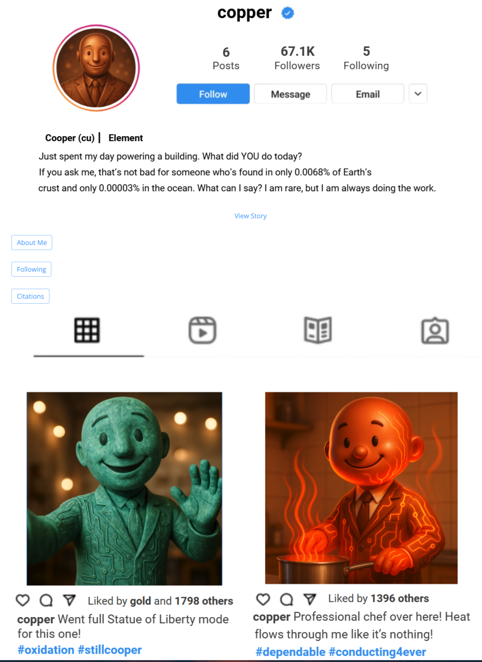 Copper is another element with a significant range in our daily lives. Anvi Pullakandam ’30 went for the challenge. She said, “Copper, being bonded with a wide range of elements and having a shiny reddish-bronze appearance, encouraged me to be more creative and think of copper as a creator online rather than an element. I enjoyed using the facts about copper to create its personality if it were a person, and using my own imagination when constructing the social media page. However, my original site, Google Sites, was not as adjustable as I would’ve liked. That’s when I involved Canva. I was able to copy and paste realistic social media details from the web and add them to my page. To get this on my site’s page, I had to take a screenshot of what I wanted and paste it into the page. If I were to do this project again, I would stick with Canva because it is more adjustable and much easier.”