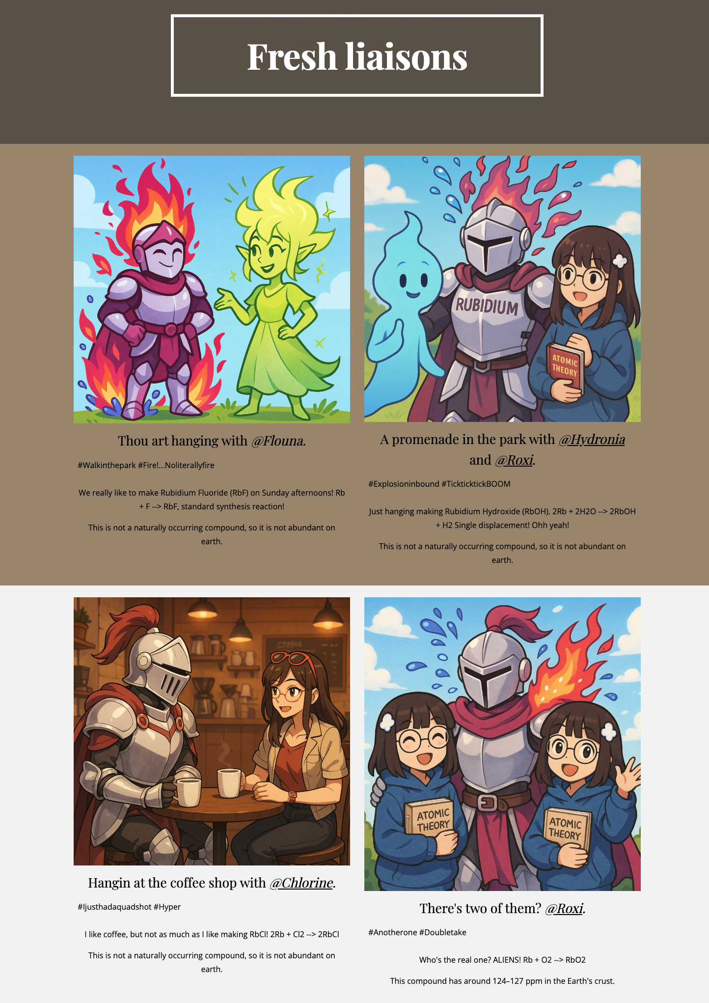 Fletcher Davis ’30 chose a similarly potent element: rubidium. He said, “What I really like about rubidium is the violent reaction that occurs when it touches water. To me, it was fascinating that such a small amount of rubidium could cause a big bang! The hardest part was designing the right personality for our element, researching which chemical compounds occur in nature and which are unnatural. While I was researching the project, something that really surprised me was that nearly all of the alkali metals were discovered in the early to mid-1800s. It was a shock to realize that even hundreds of years ago, people were making astounding discoveries. I enjoyed making a personality for our element, and then bringing it to life through the ‘websites’ we created.”