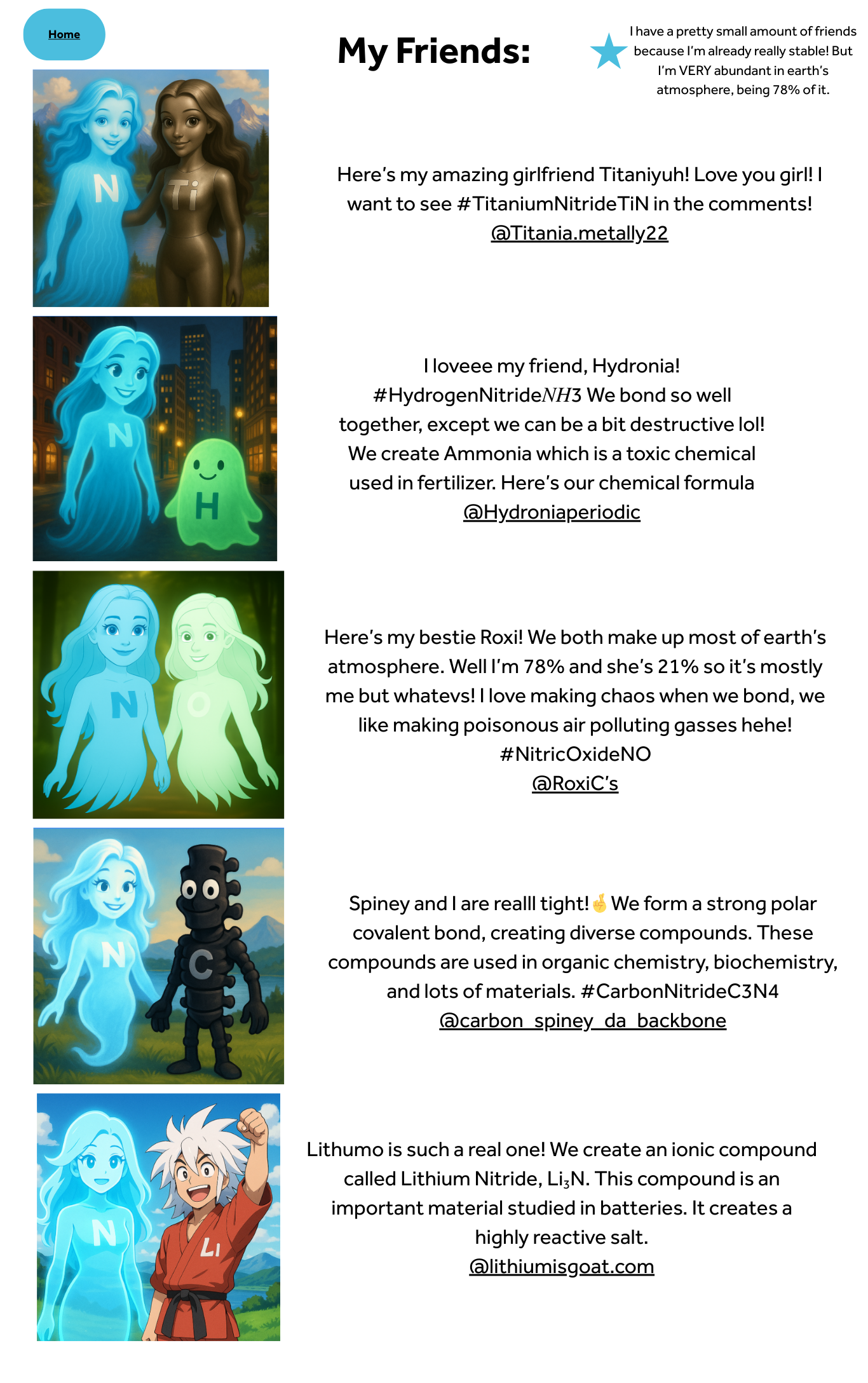 Like all social media worlds, there are reactive and explosive personalities, as well as plenty of neutral, easygoing personalities. Carbon, an essential element of life, was selected by Theo Cohan ’30 for this project. He said, “I researched carbon, and I thought it was super cool how it is involved in so many compounds. Ten million different compounds is a crazy number, and I was really surprised. I enjoyed making the Google Sites page because I realized how fun it is. It was also really hard because of all of the work I had to put in to get the good scores that I wanted. This included researching many websites to gather the right information and using Flint to generate pictures of my character. All in all, this was one of the most fun projects I’ve ever done in science class.”