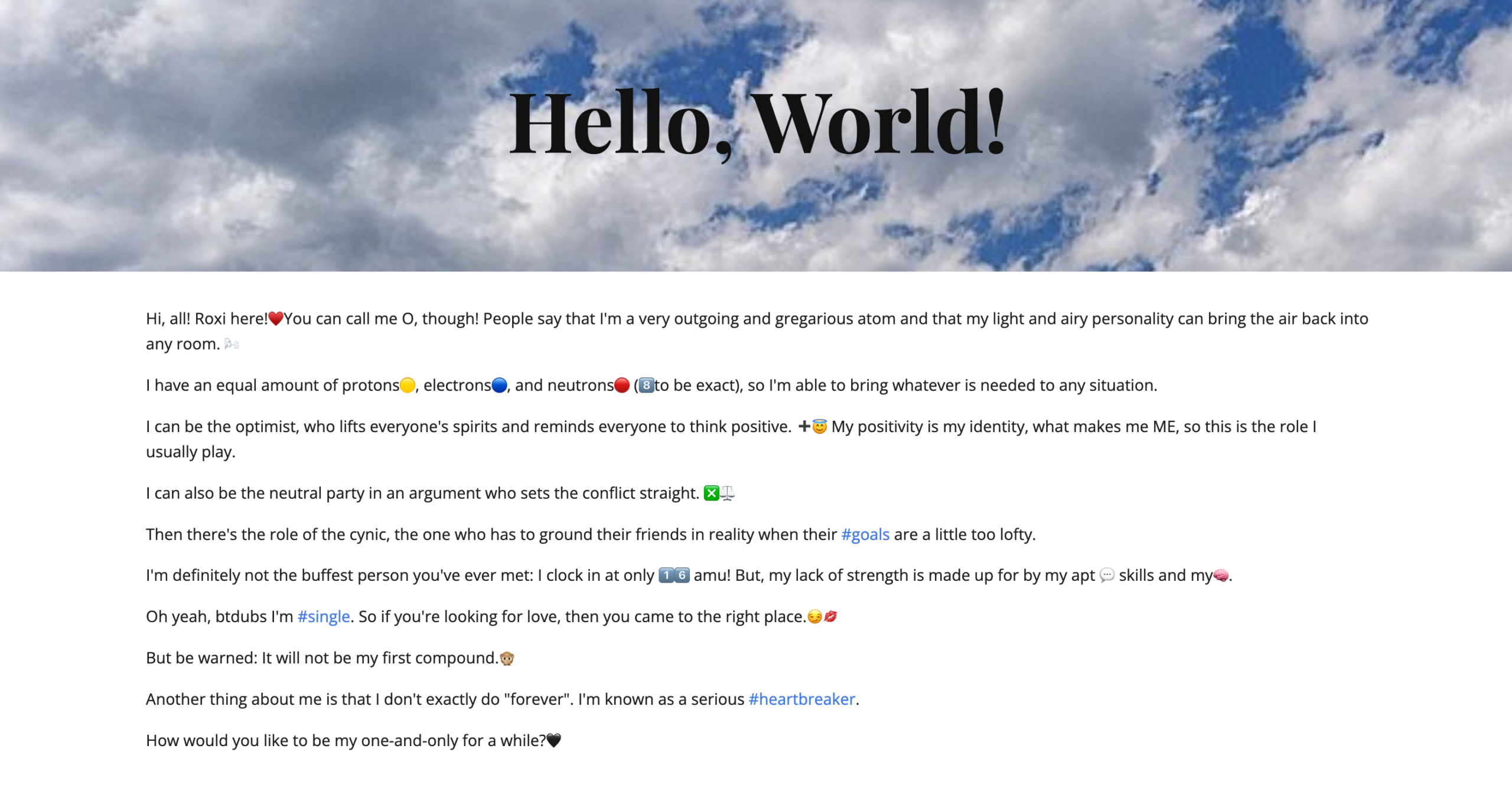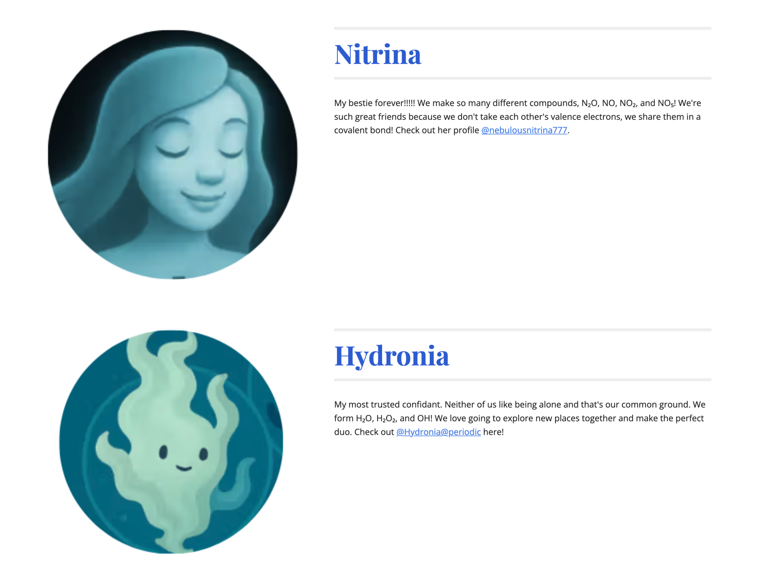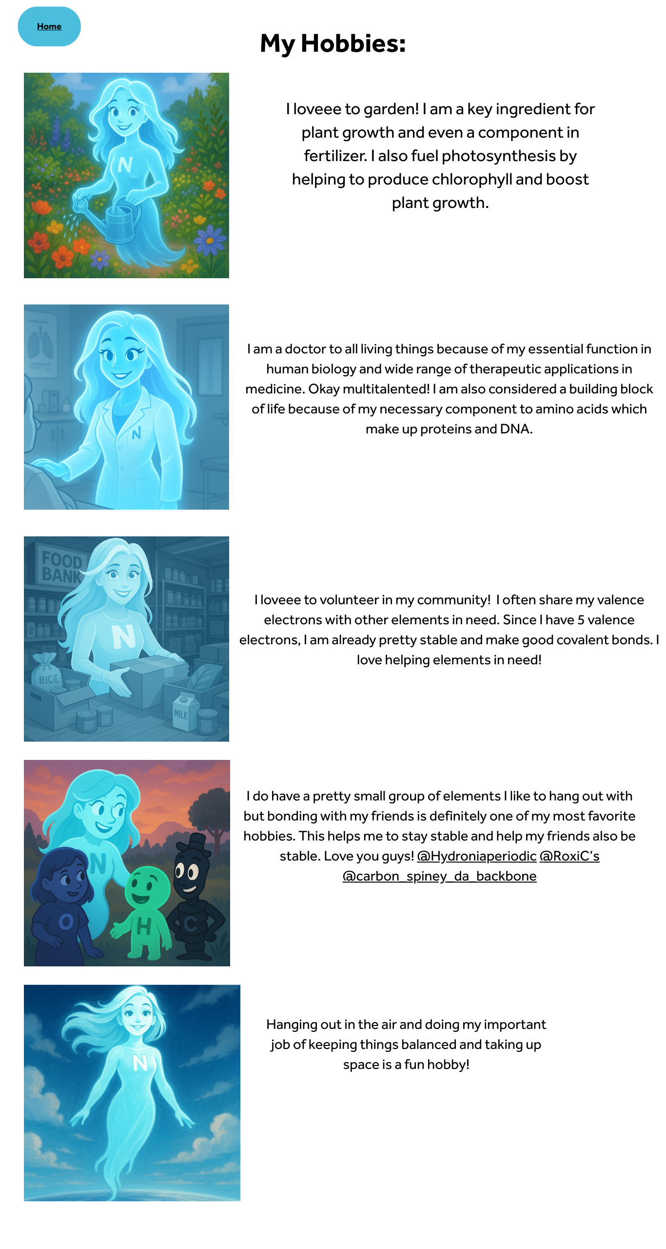 Nitrogen, a vital element that interacts with critical organic molecules such as DNA and proteins, won Julia Leonard ’30 over. She said, “My element for the project was Nitrogen, where I was supposed to give our element a personality that matched how they reacted with other elements and how they were in real life. I named my element ‘Nitrina’ and gave her all sorts of different personality traits based on how Nitrogen is in real life. Some of these traits do not react with a lot of elements, but Nitrogen can be very outgoing with others, since it is a large percentage of air. I loved this project because we were able to be as creative as we wanted, and I really enjoyed giving something that seemed boring some personality. The most challenging part for me was definitely making the website layout appealing and realistic. It took me a while to organize my website so it was easy to navigate and still looked interesting! I really enjoyed working on this project, and it helped me have a better understanding of many different elements, beyond the element I chose.”