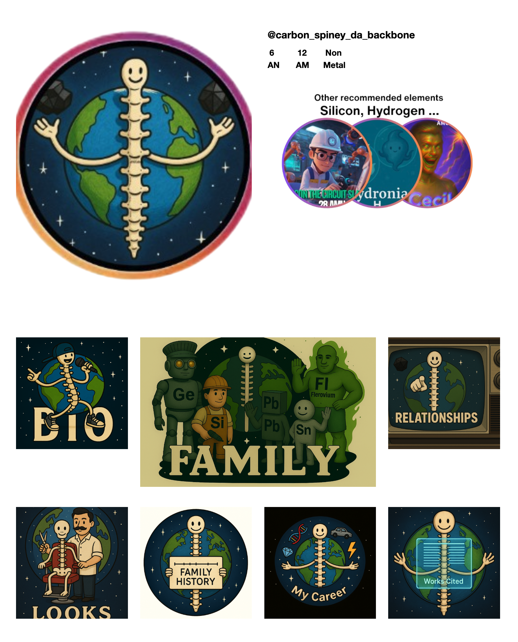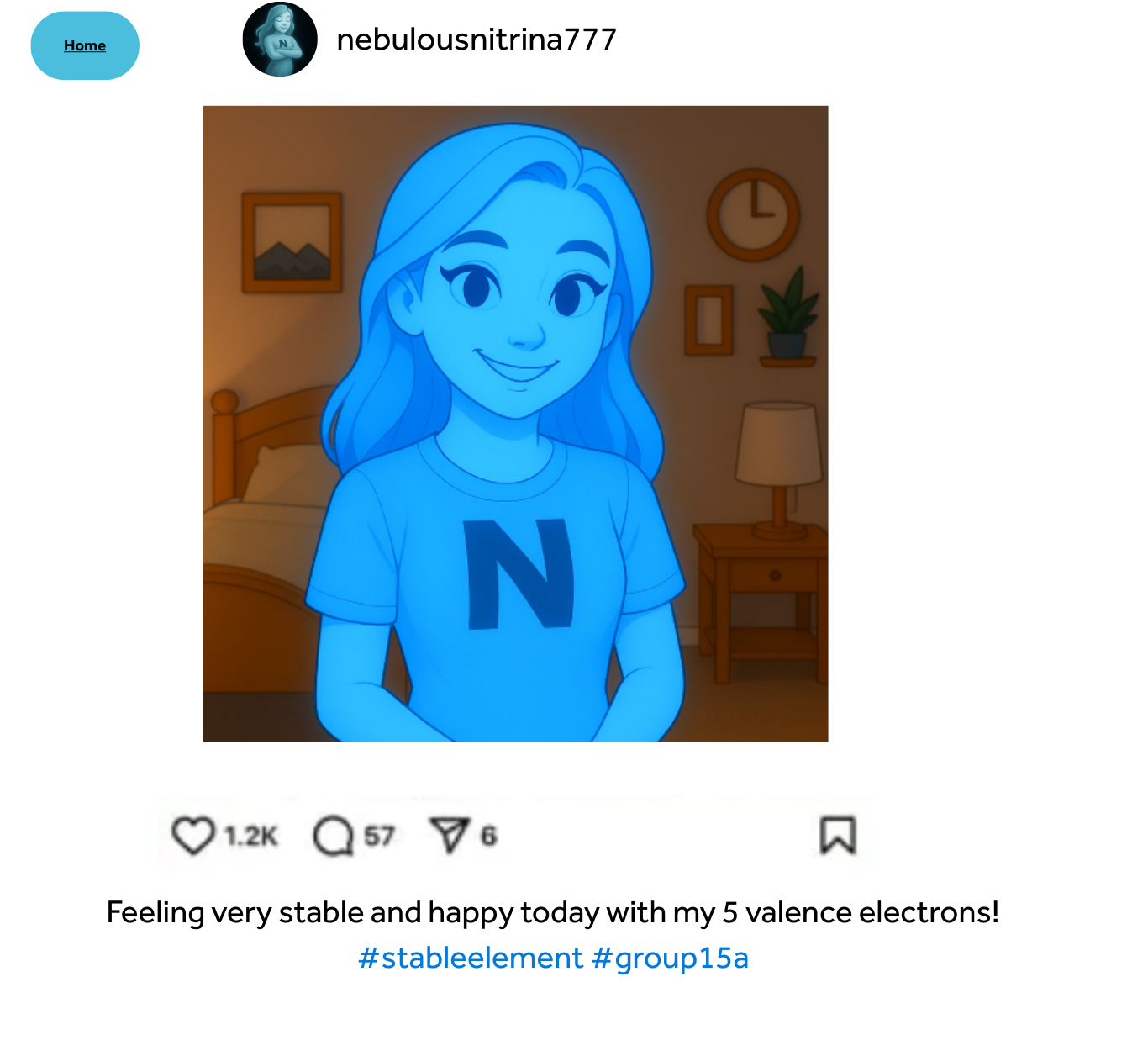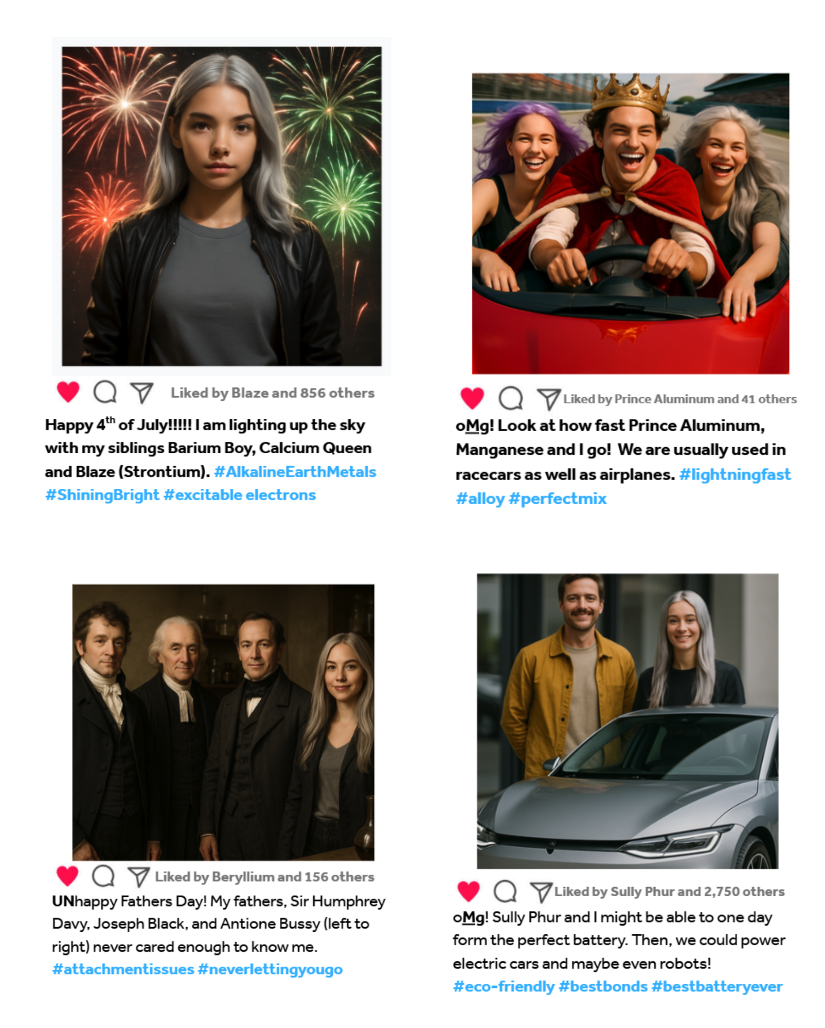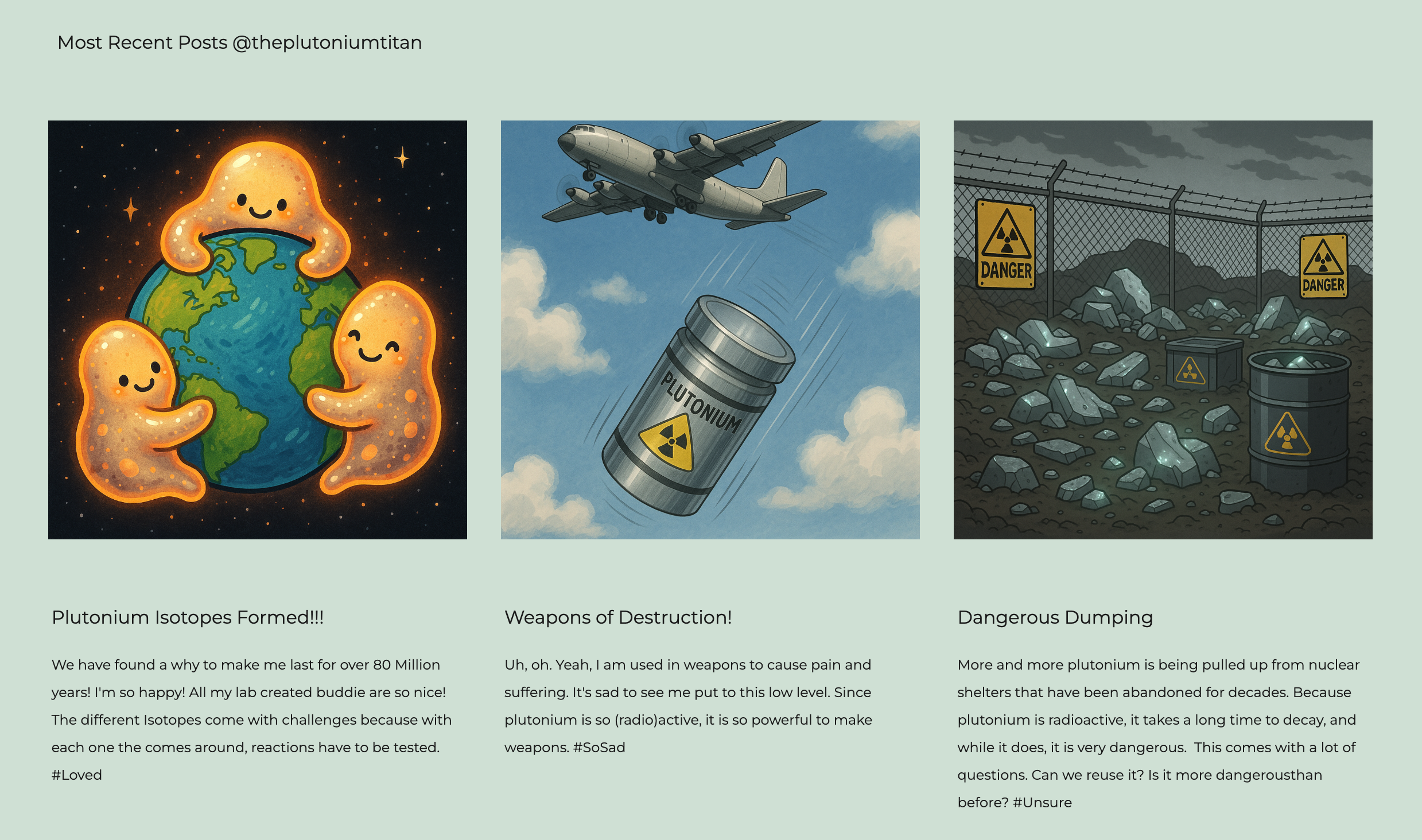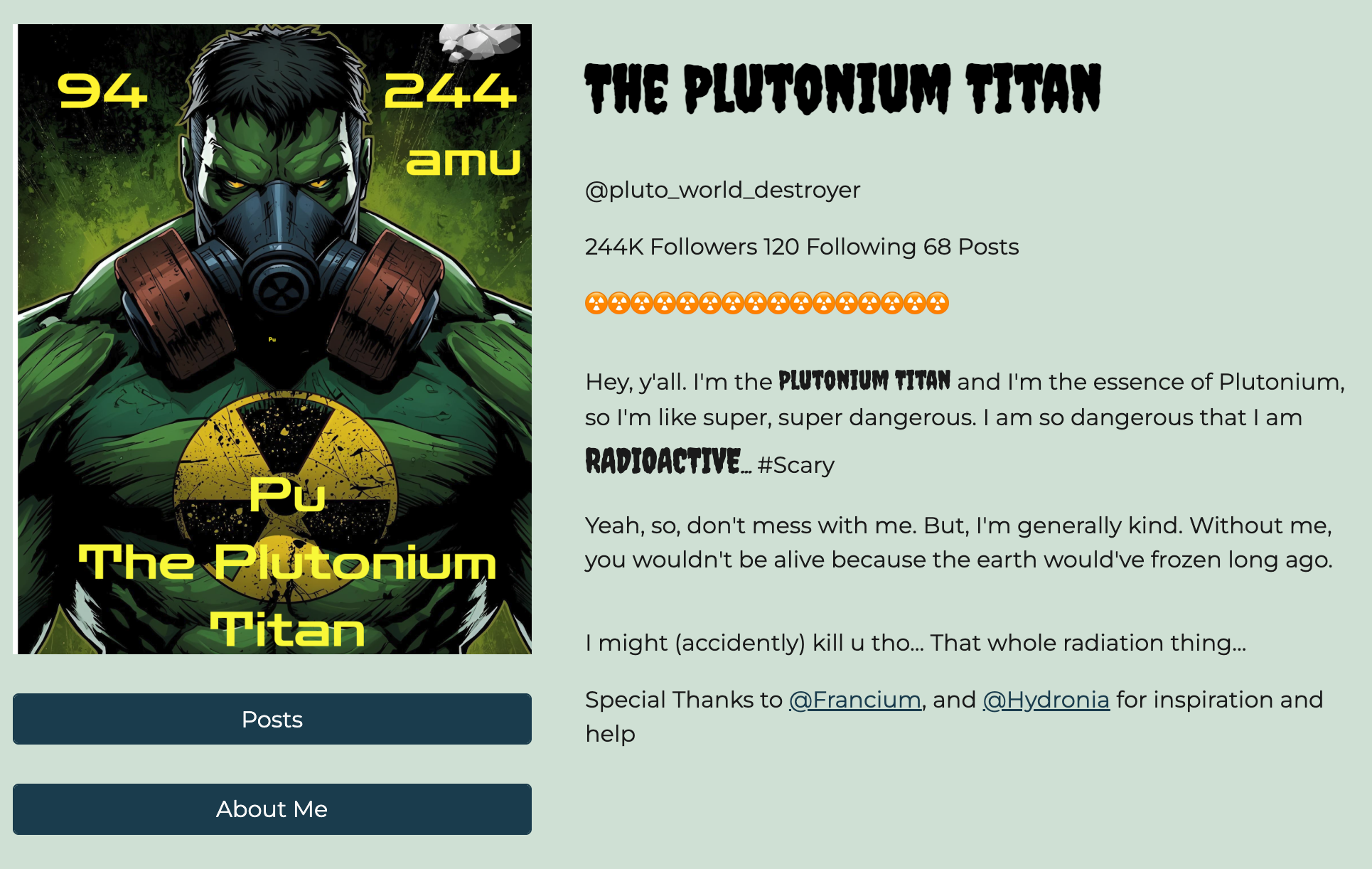 Another highly-reactive element “entered the chat” through Pete Martens ’30. “I chose plutonium as I didn’t know a lot about it,” he said. “It’s most commonly known for its nuclear power. We used Flint AI to generate the image of our character that looked like a square on the periodic table. It was challenging to integrate a personality into the element. I created the Plutonium Titan and used that as the basis for my social media account. Plutonium has a big personality. It’s very reactive with most elements. It gets along with a lot of them, but since it’s radioactive, a lot of the relationships are explosive. I loved starting from scratch with this project and letting our creative abilities flow in an unstructured way.”