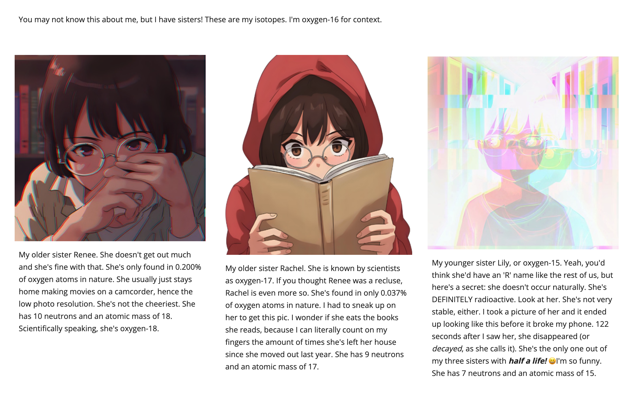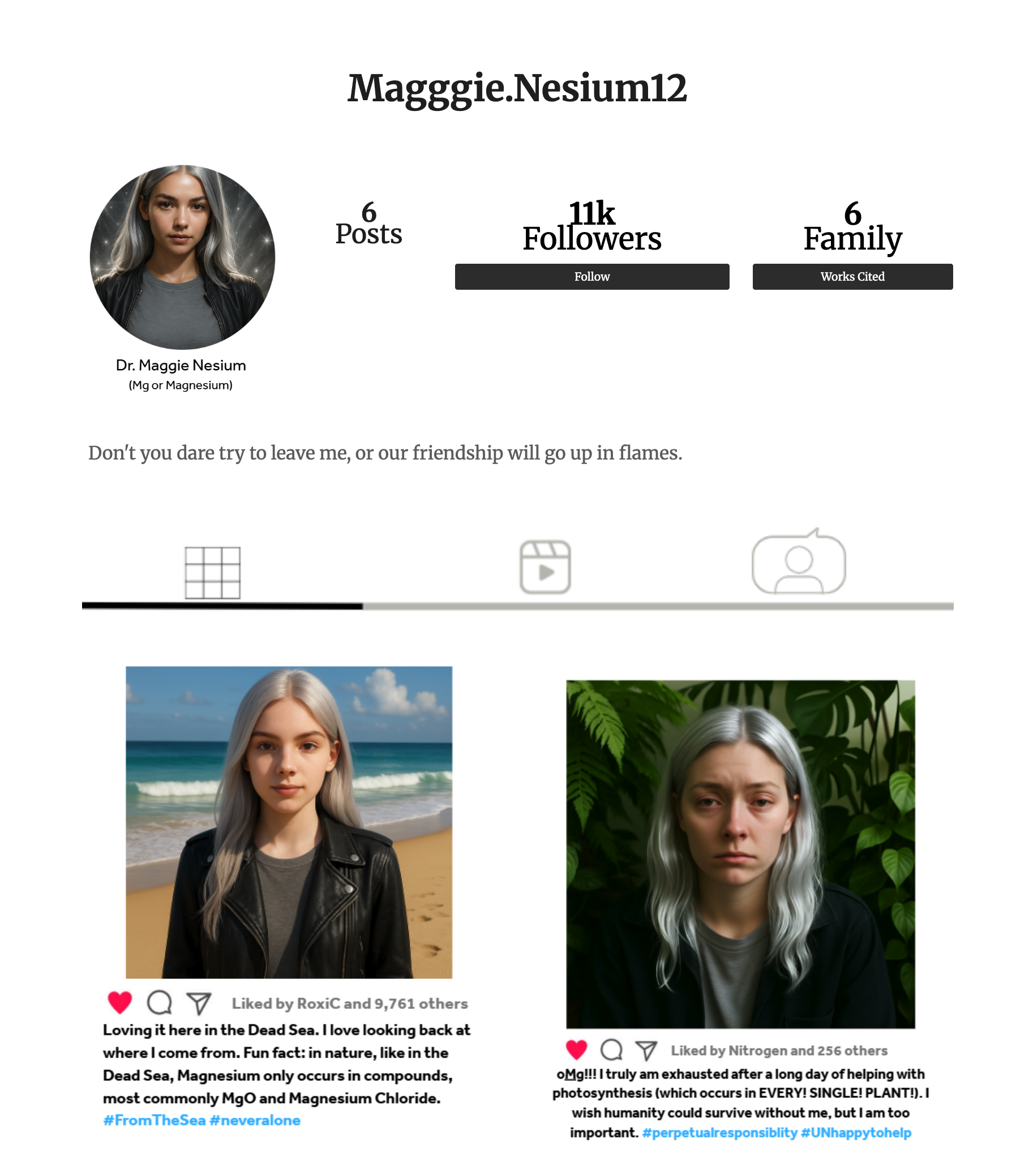 We can’t leave out the most gregarious and outgoing element: oxygen. Rosie Kelley ’30 breathed new life into this important element and said, “My character’s name was Roxi (short for Roxanne), and I liked how confident and fun I made her. I tried to structure her posts like an influencer. What surprised me was how much research and overall work were involved in the process. I really enjoyed making faux Instagram posts for Roxi’s page.”