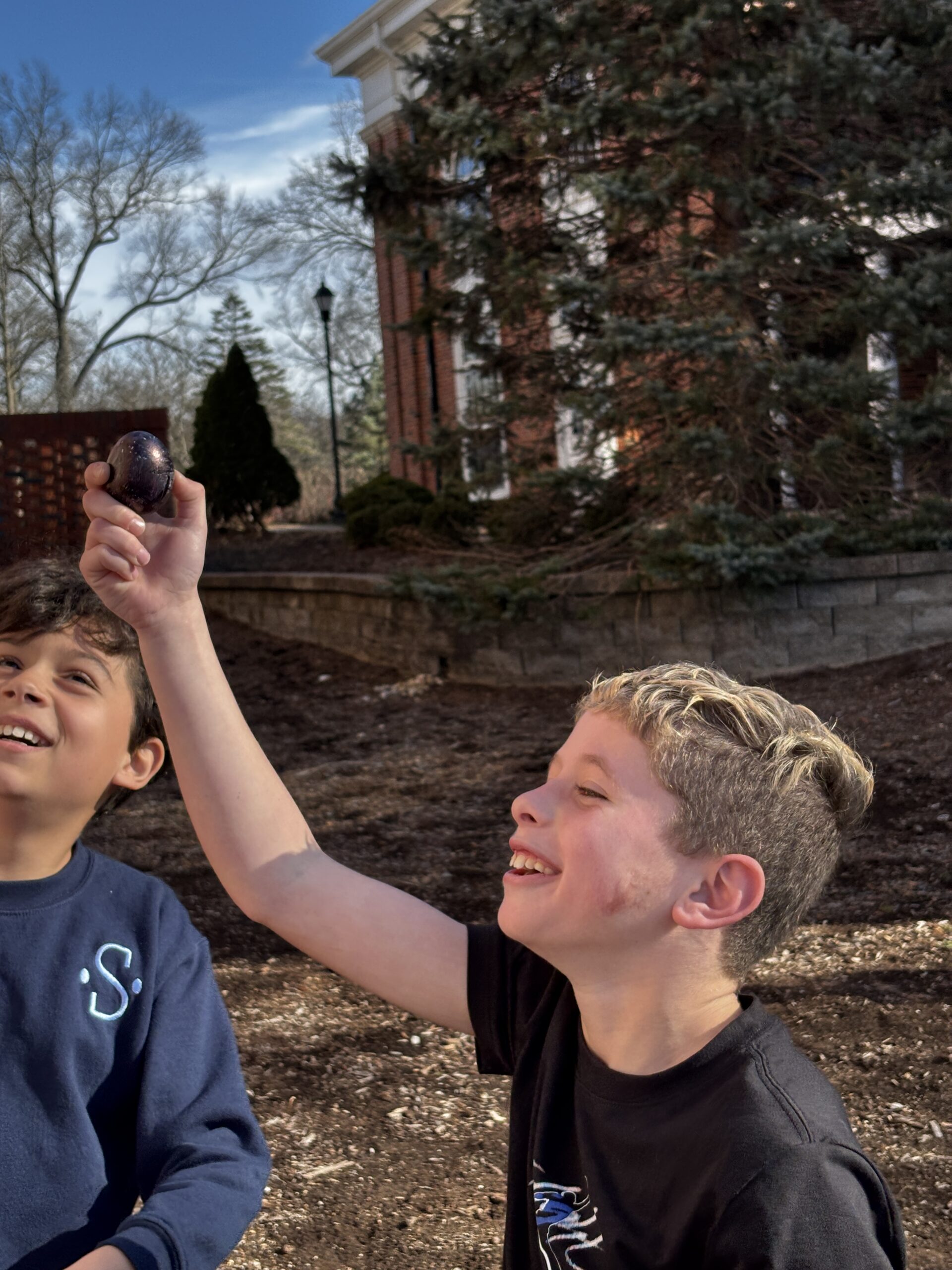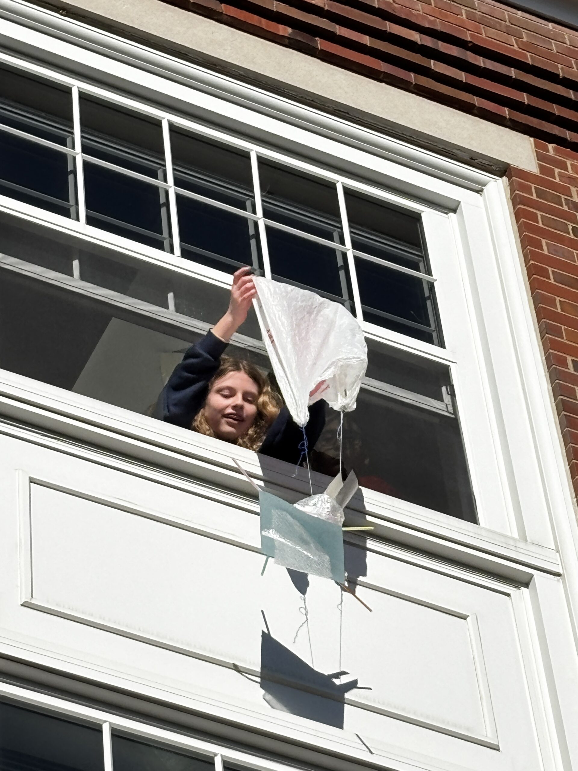 Another favorite activity among the students was an egg drop challenge. This challenge had small groups of students work together to create a device that would allow an egg to land safely after being dropped from Dr. Sontheimer’s second-story window. Like several of their other challenges, they were forced to stay within the constraints of limited tape, paper, plastic bags, plastic cups, string, and bubble wrap. Riley Stockstill ’33 mentions that the best part of these challenges is the ability to “collaborate and work together as a group to discover new techniques to build a fun solution to the challenge.”