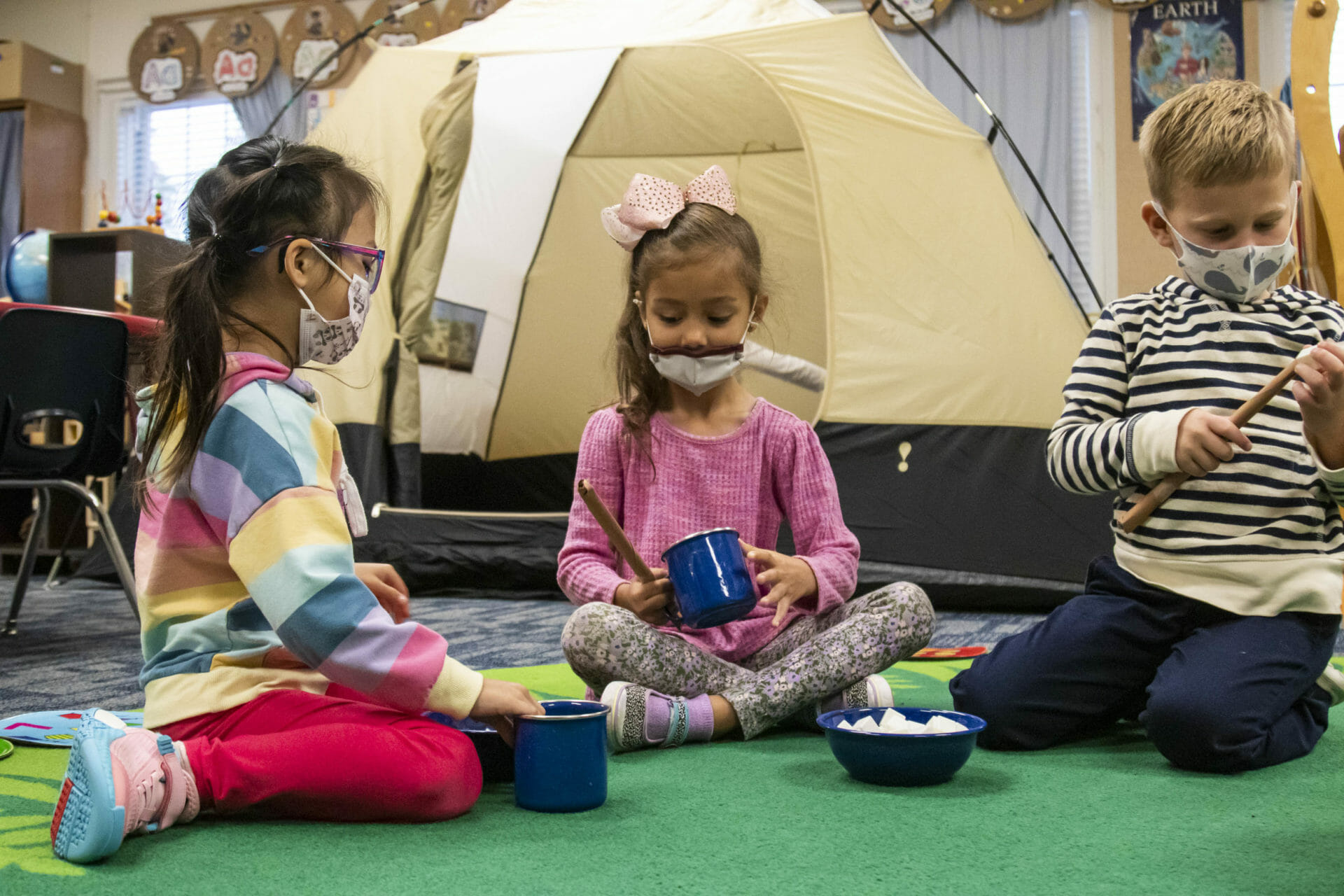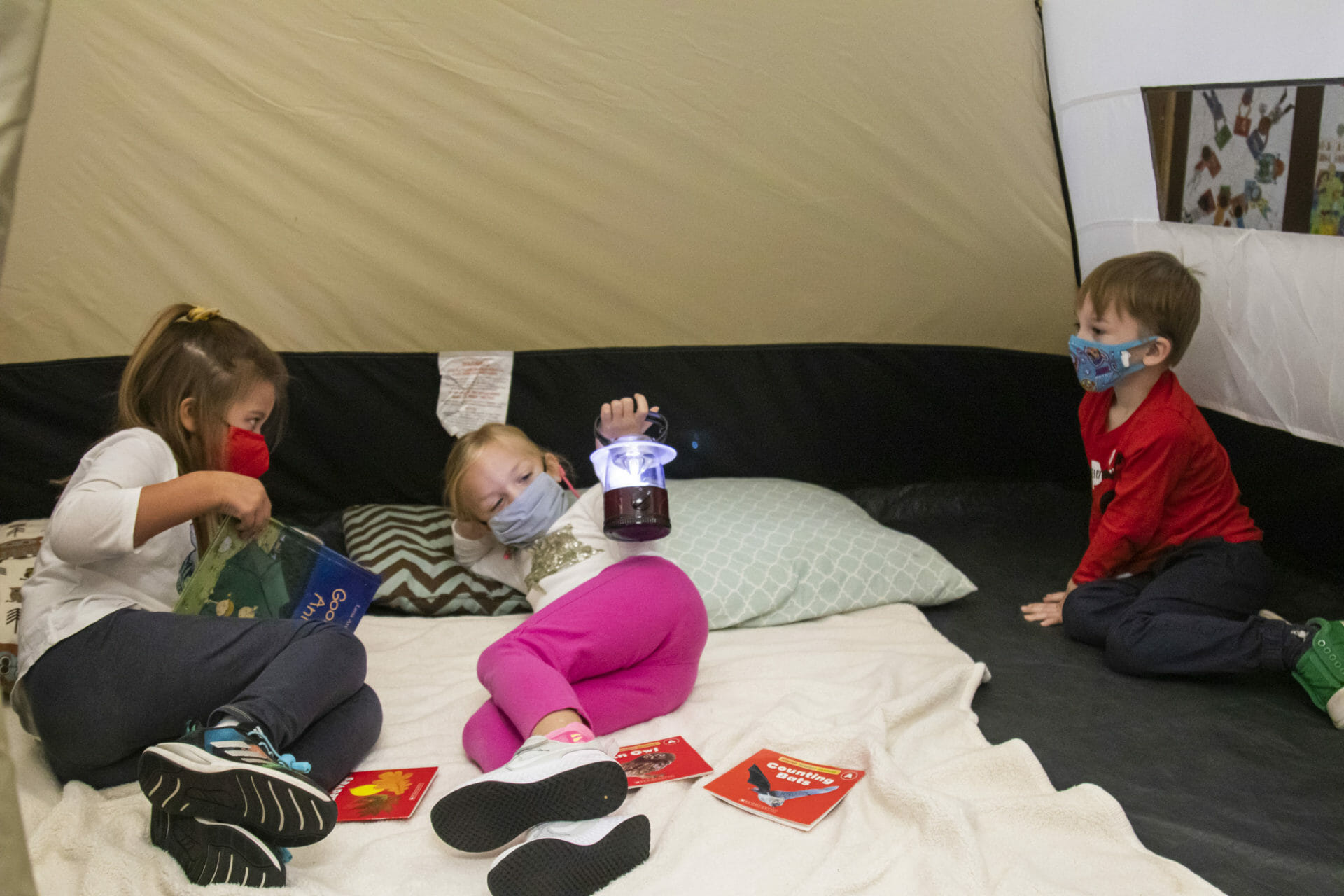 Junior Kindergarten Teacher Ginny Otto shared, “The tents help us think about the forest environment as well as the food and water that we would take with us (or find in the woods) and how the tents fill the role of shelter for us in the forest. Plus, it’s just fun!”
