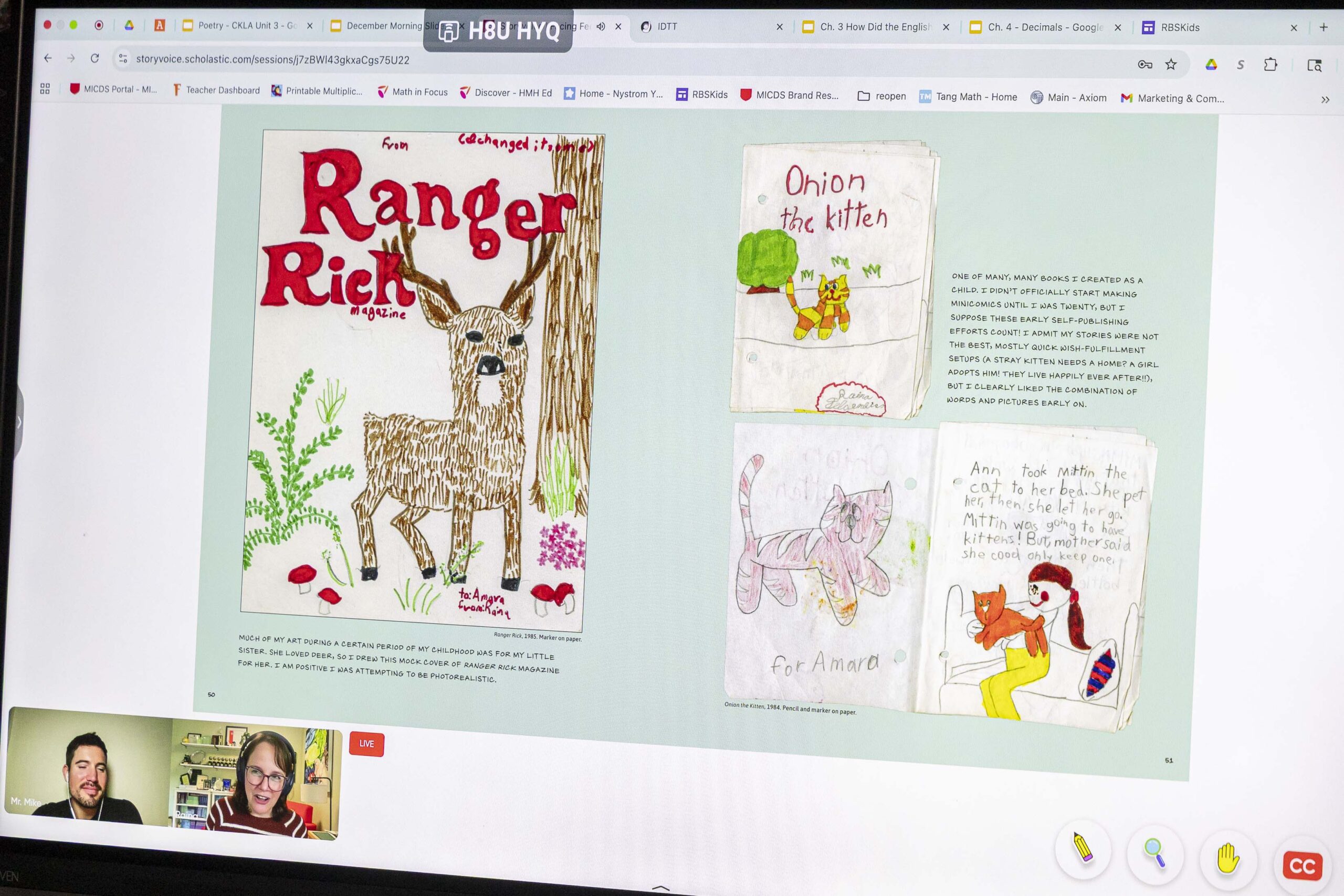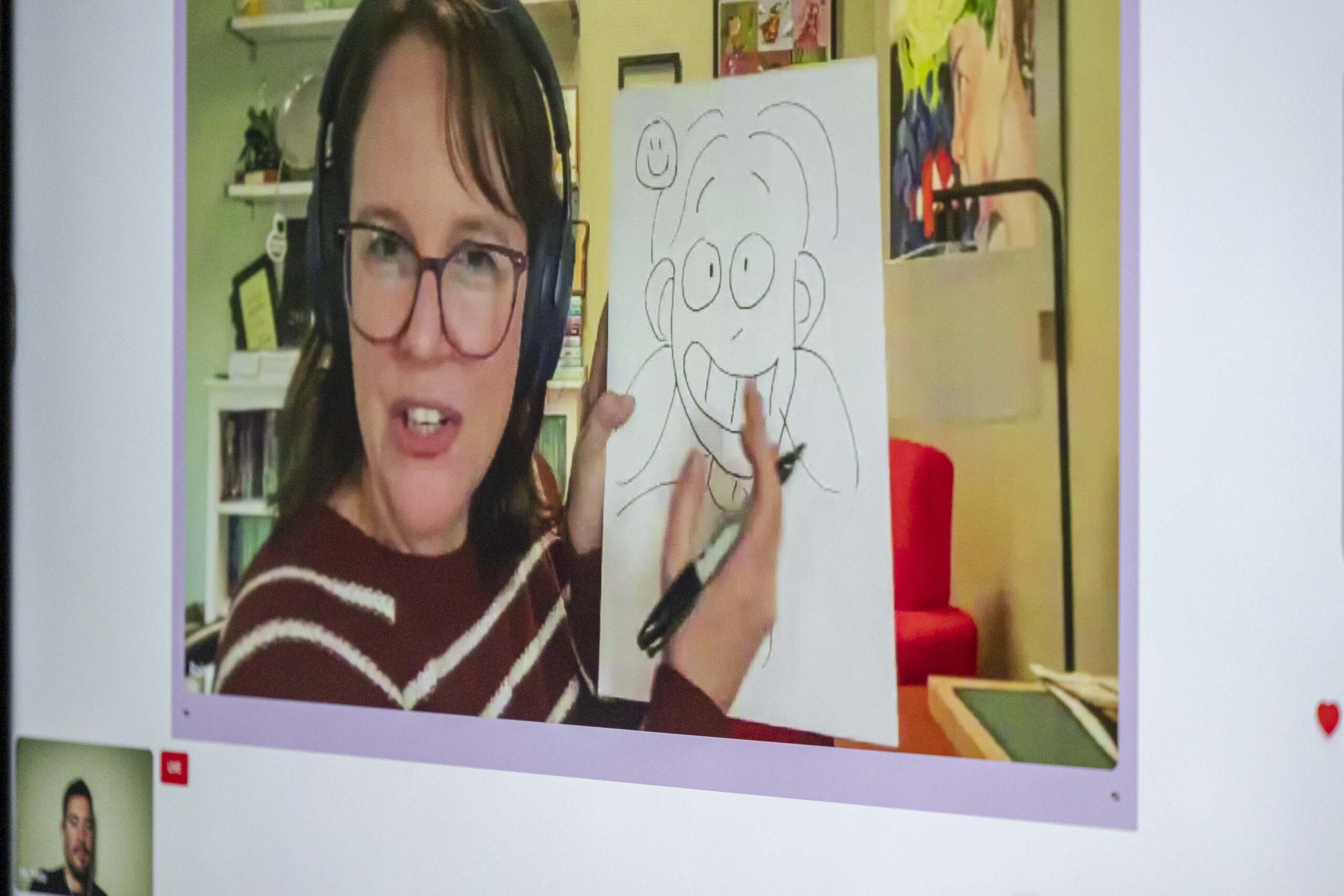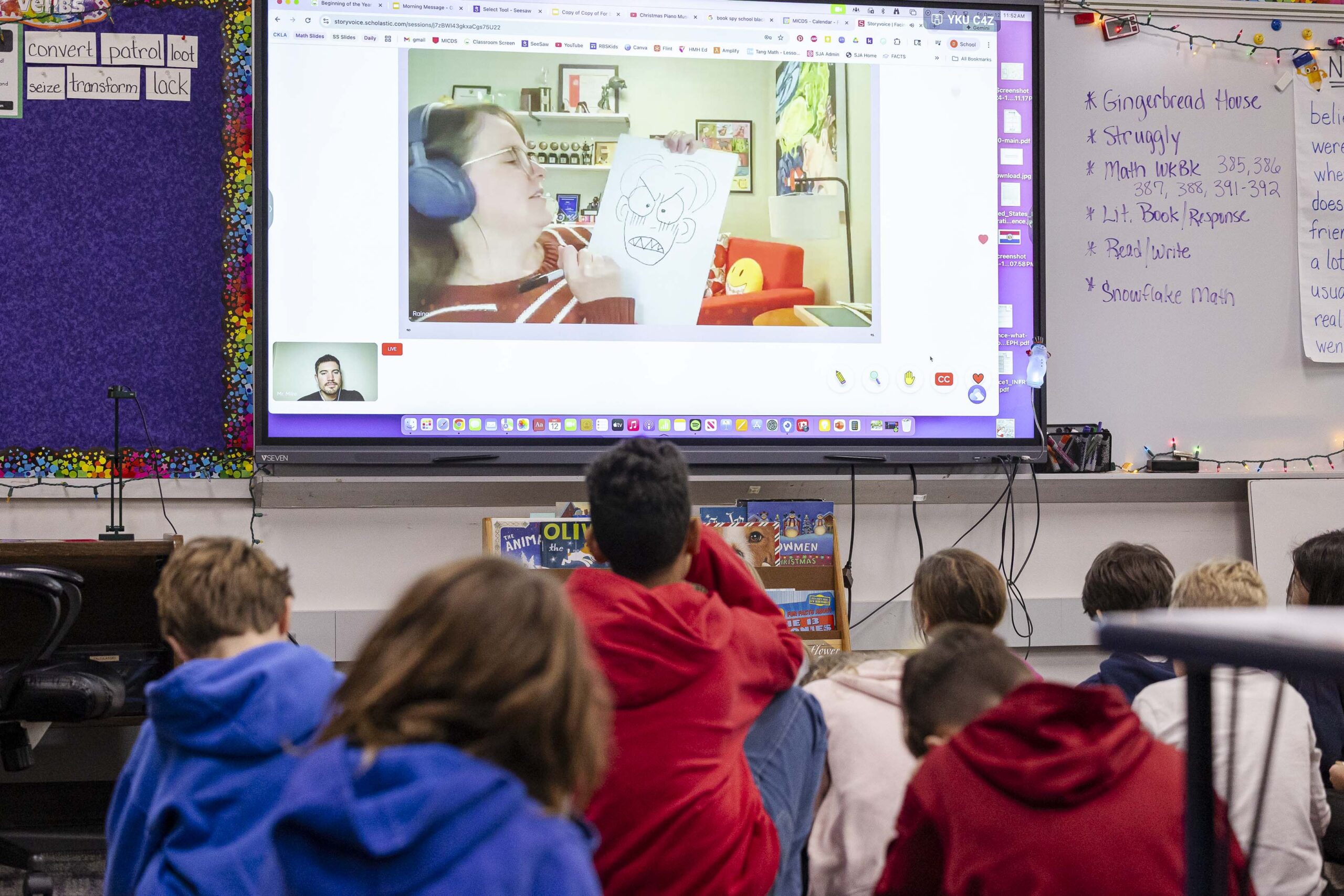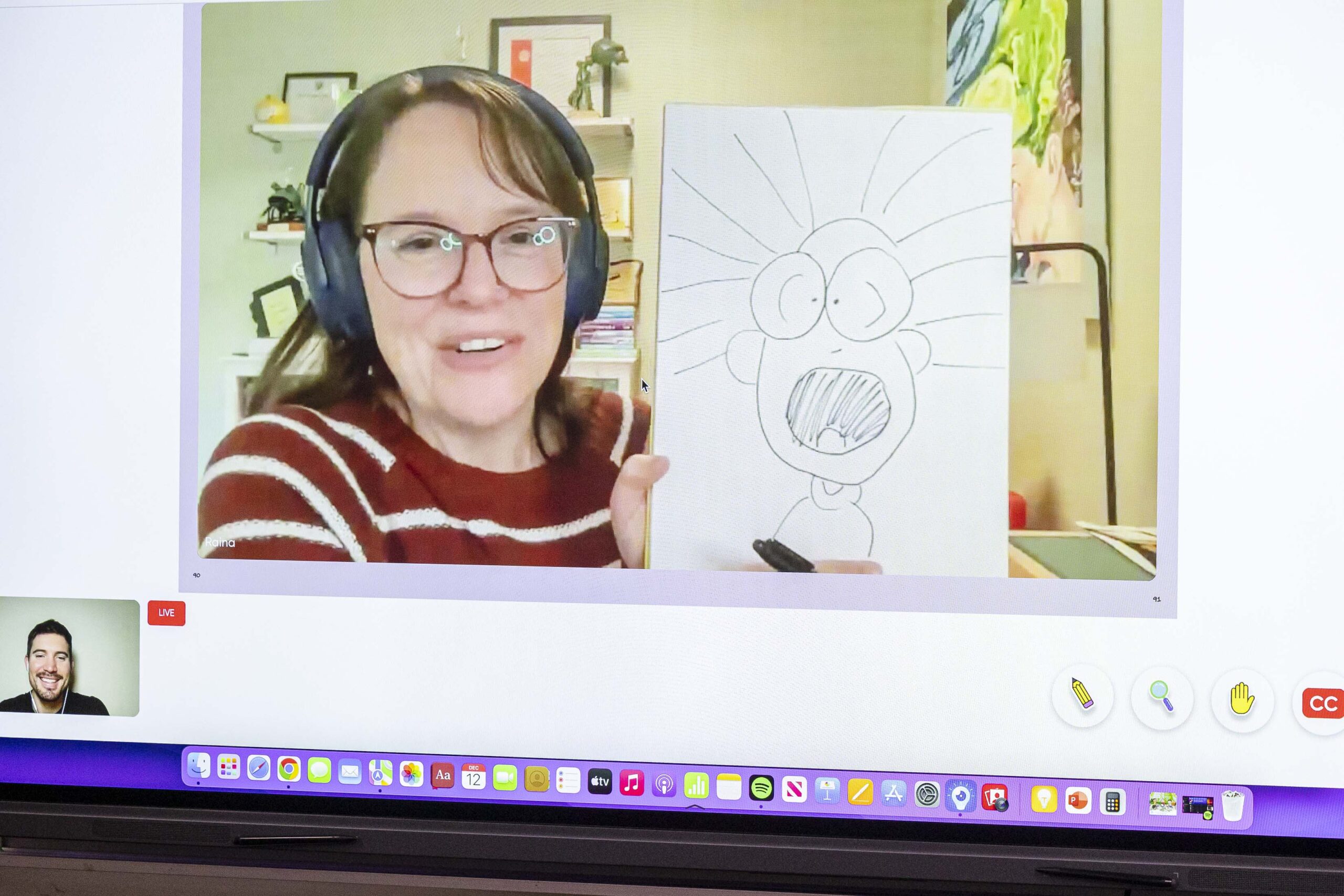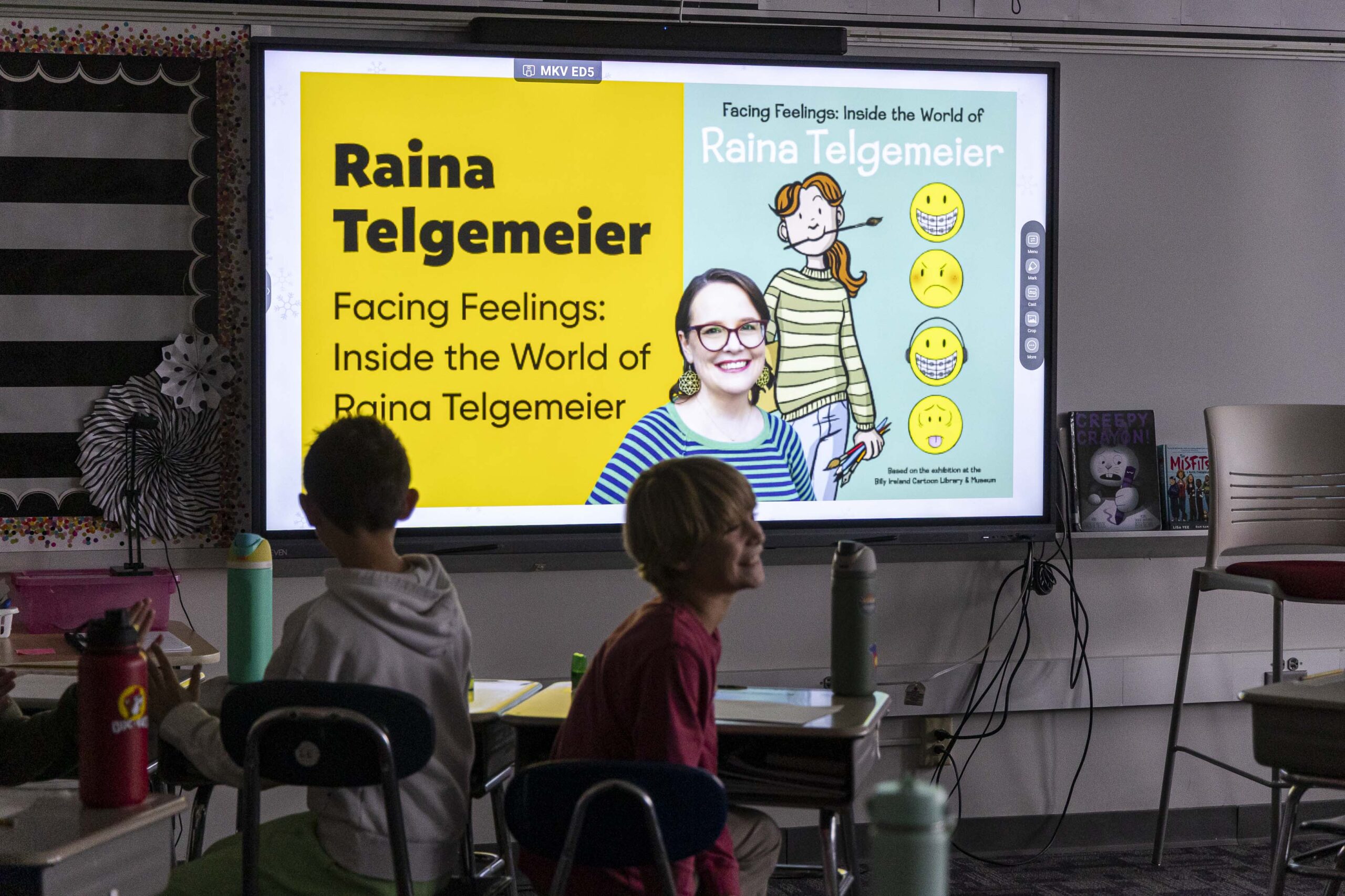 The rustling of paper and the scratching of pencils filled two of our three fourth-grade classrooms as a familiar face appeared on the big screen: Raina Telgemeier. Telgemeier, an American cartoonist and New York Times bestselling author, visited the classrooms of Allison Antolik and Donna Waters simultaneously via Zoom as part of a special Scholastic Books program.