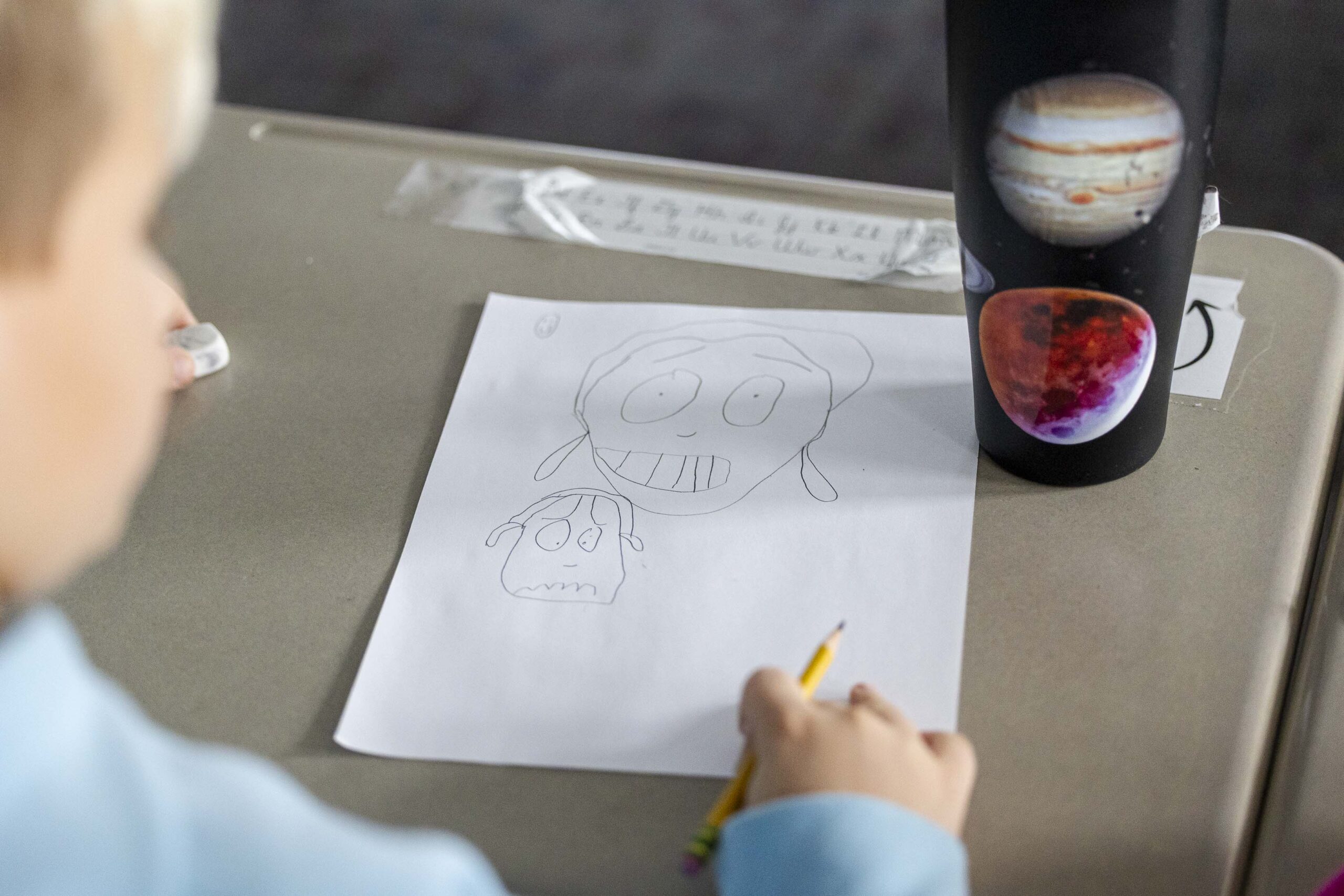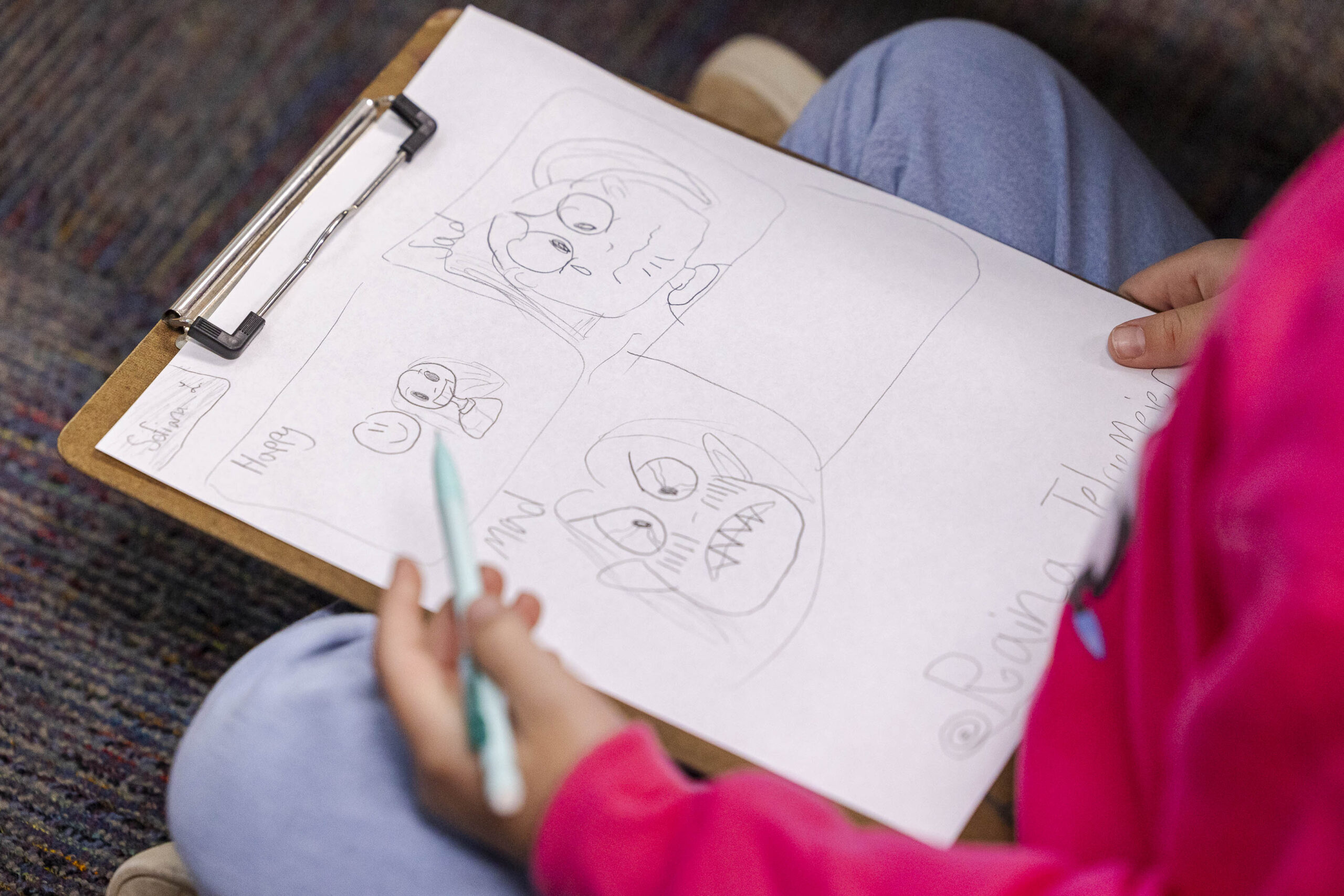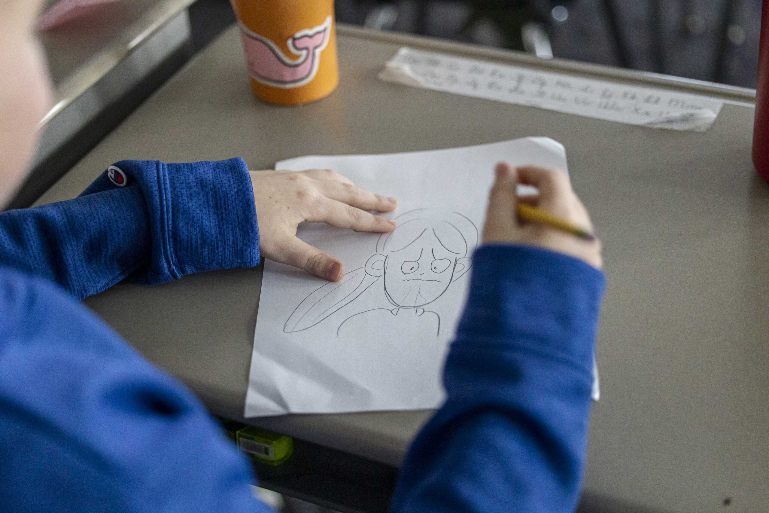 Much of it comes down to the shape of the eyebrows, eyes, mouth, and teeth, with the shape or design of the nose, hair, ears, and clothes being less critical. Student heads were bent low over desks and laps as they mimicked Telgemeier’s pencil strokes, experimenting with the arch of a surprised eyebrow or the jagged line of an angry mouth.