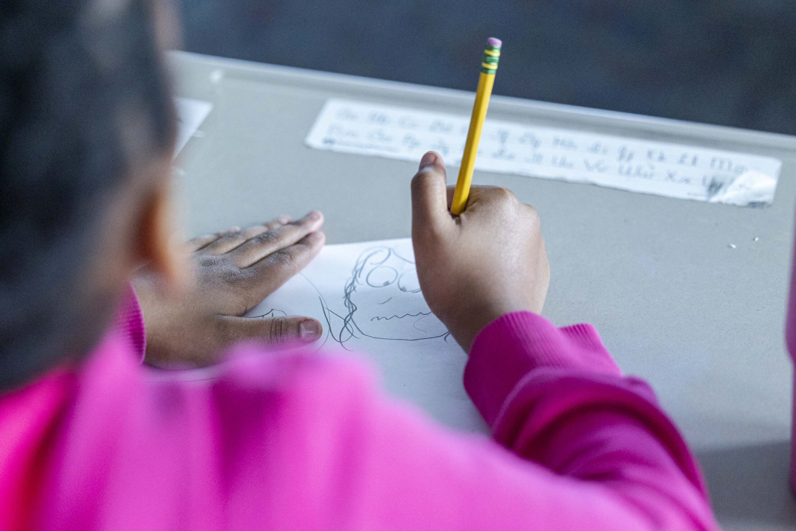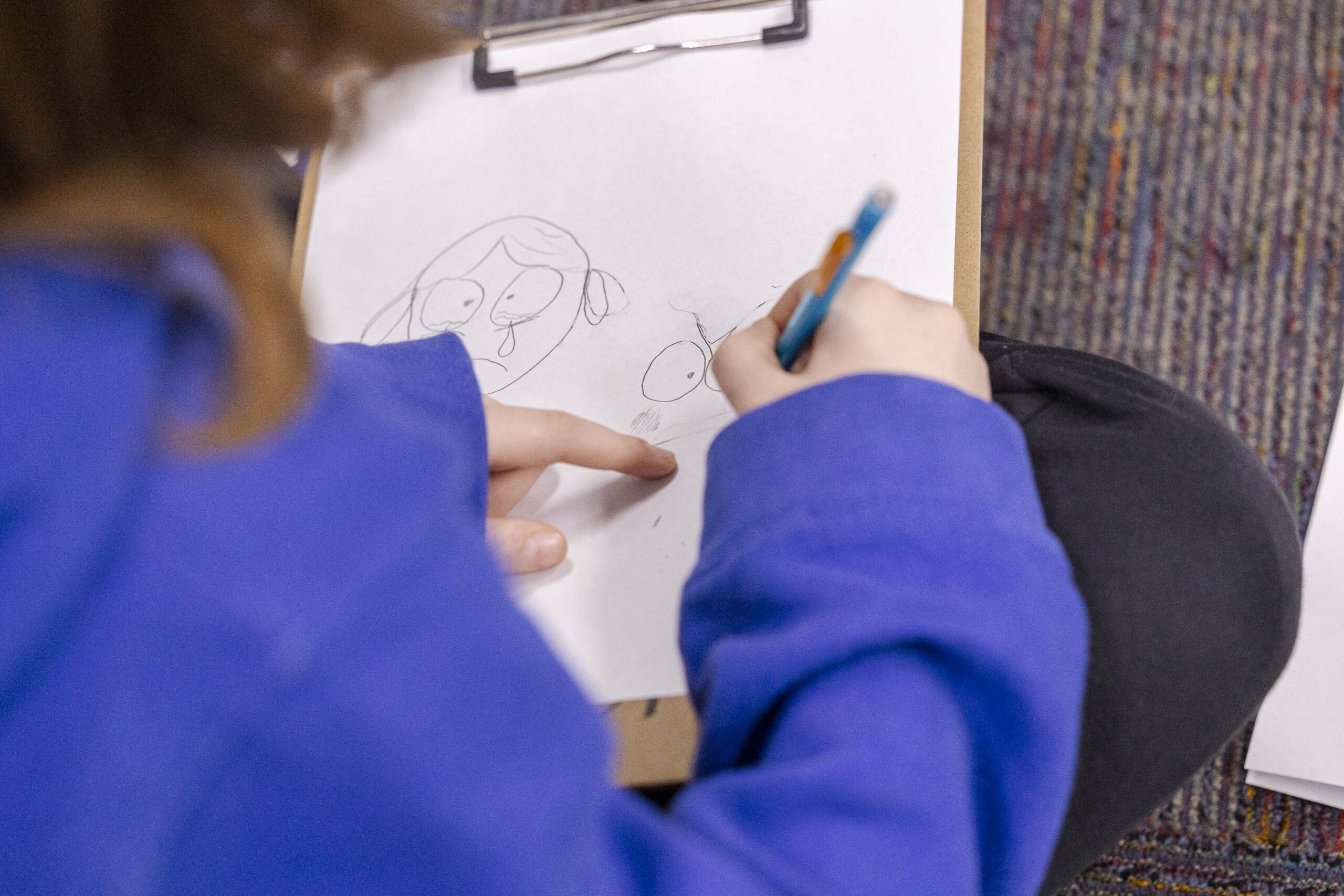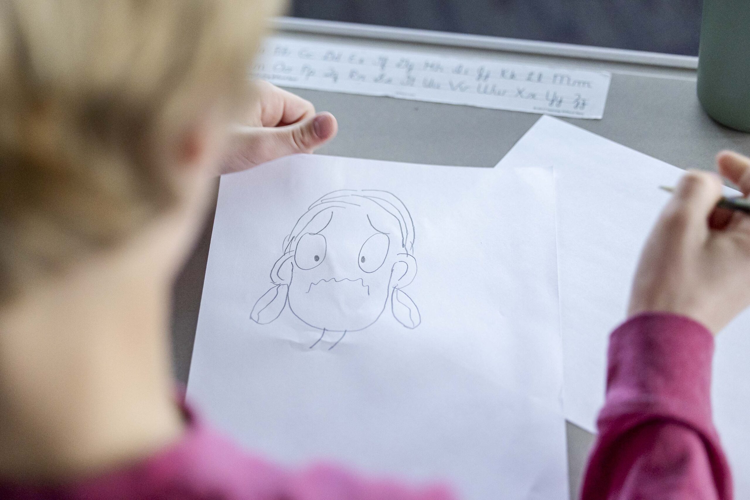 Much of it comes down to the shape of the eyebrows, eyes, mouth, and teeth, with the shape or design of the nose, hair, ears, and clothes being less critical. Student heads were bent low over desks and laps as they mimicked Telgemeier’s pencil strokes, experimenting with the arch of a surprised eyebrow or the jagged line of an angry mouth.