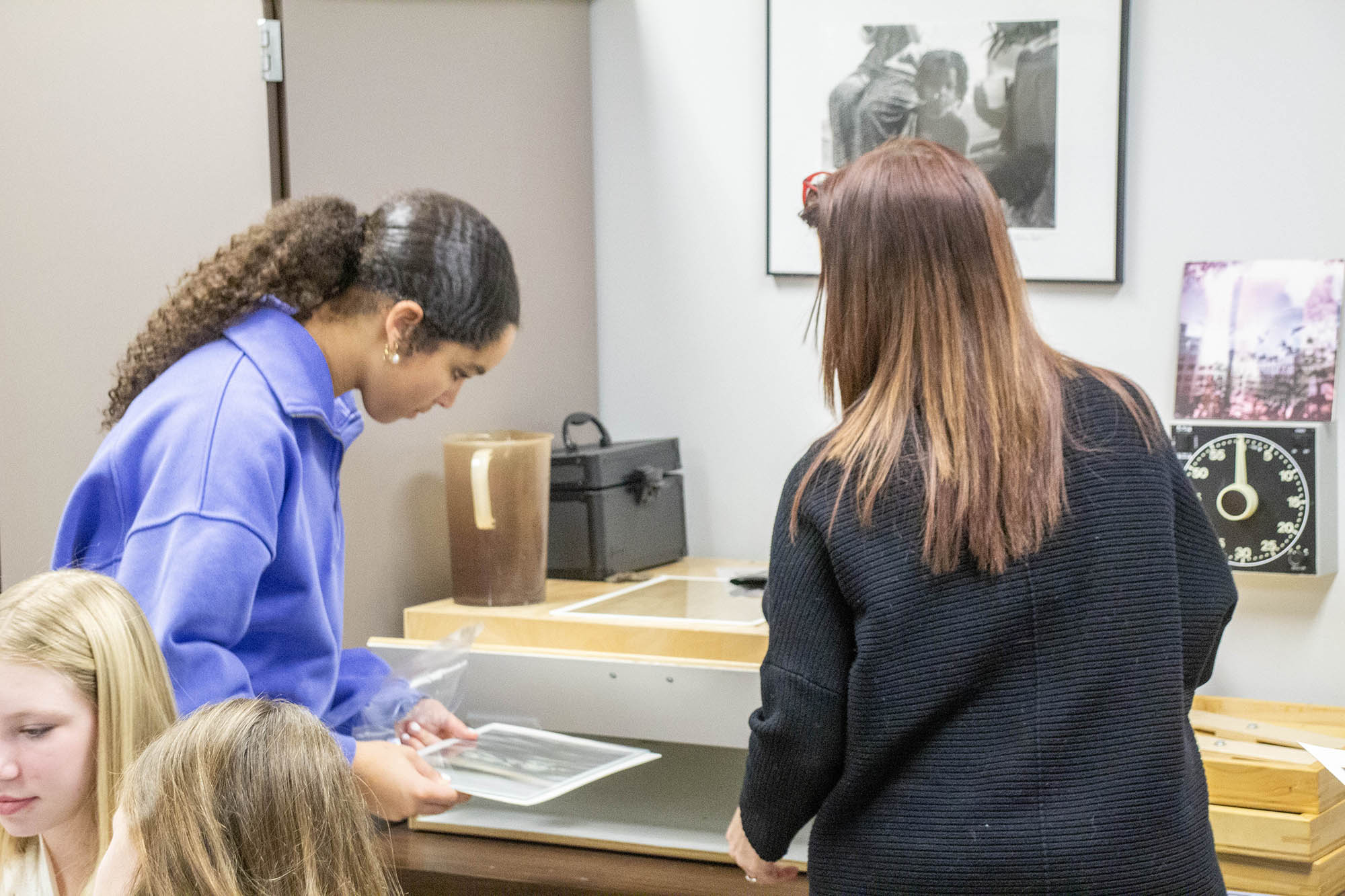 Ms. Douglas also encourages students to accept mistakes as part of learning. Prints can come out too light, too dark, or with unexpected streaks, but those results still teach something. Students learn to adjust exposure time, improve how they place objects on the paper, and refine their rinsing technique. Over time, the class becomes less about getting a perfect print on the first try and more about building skill through repetition. As Ms. Douglas always says, “Focusing on the end print isn’t ideal, it’s about making sure the process is correct as you go through the steps.”