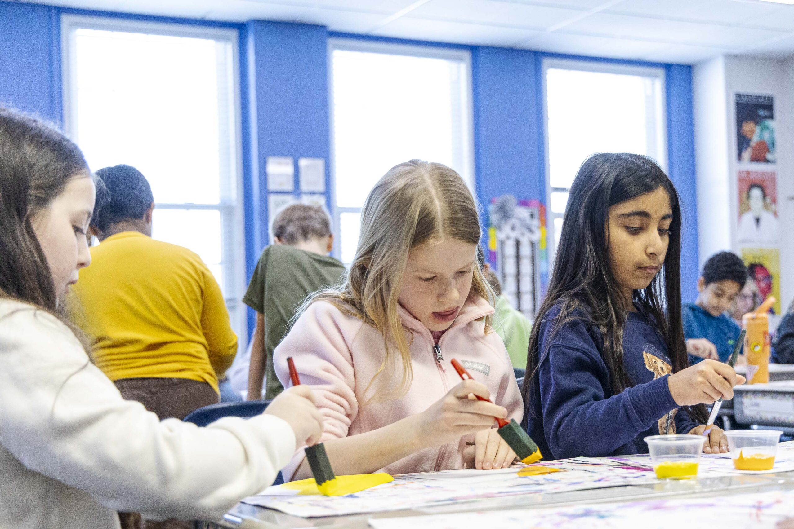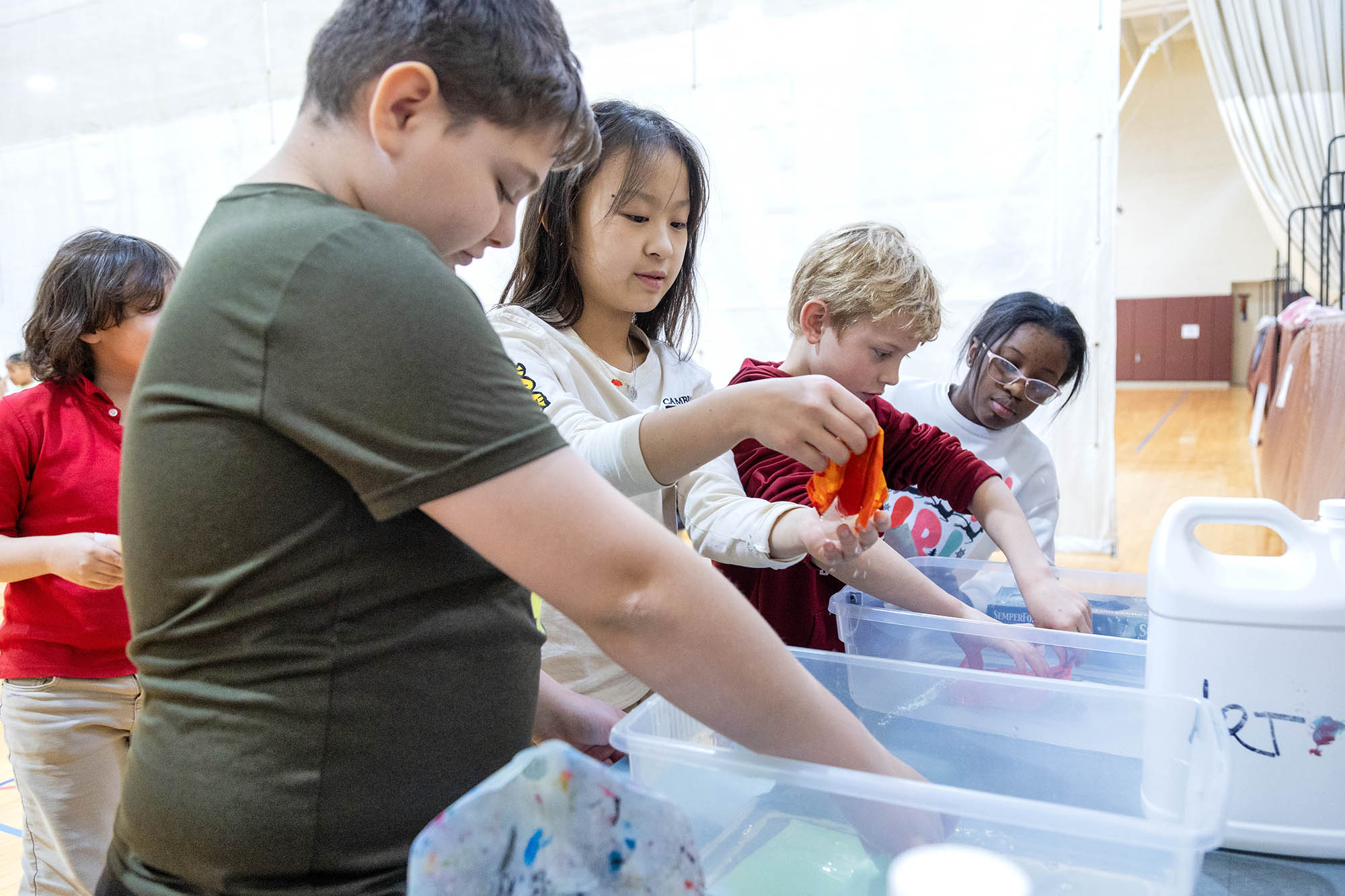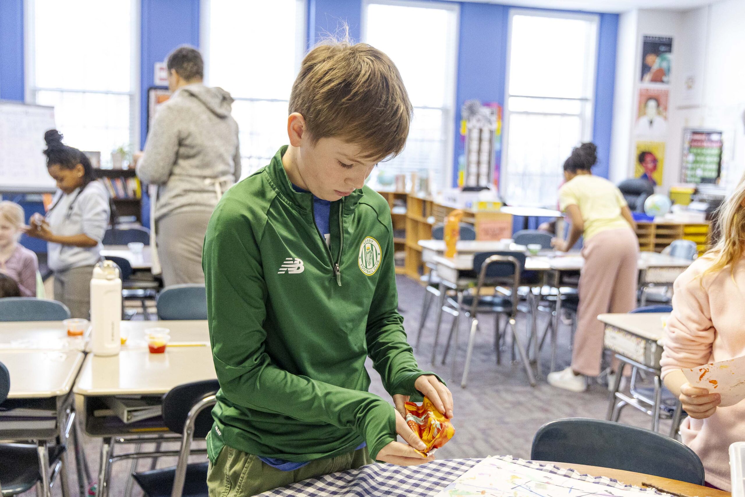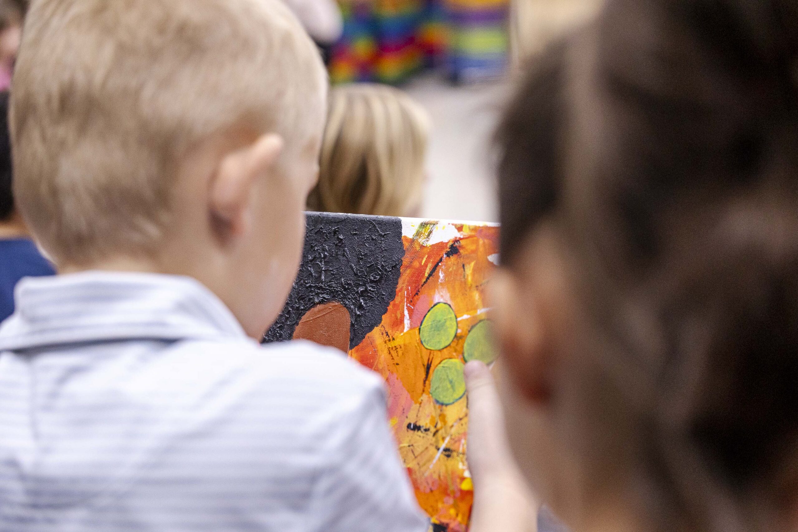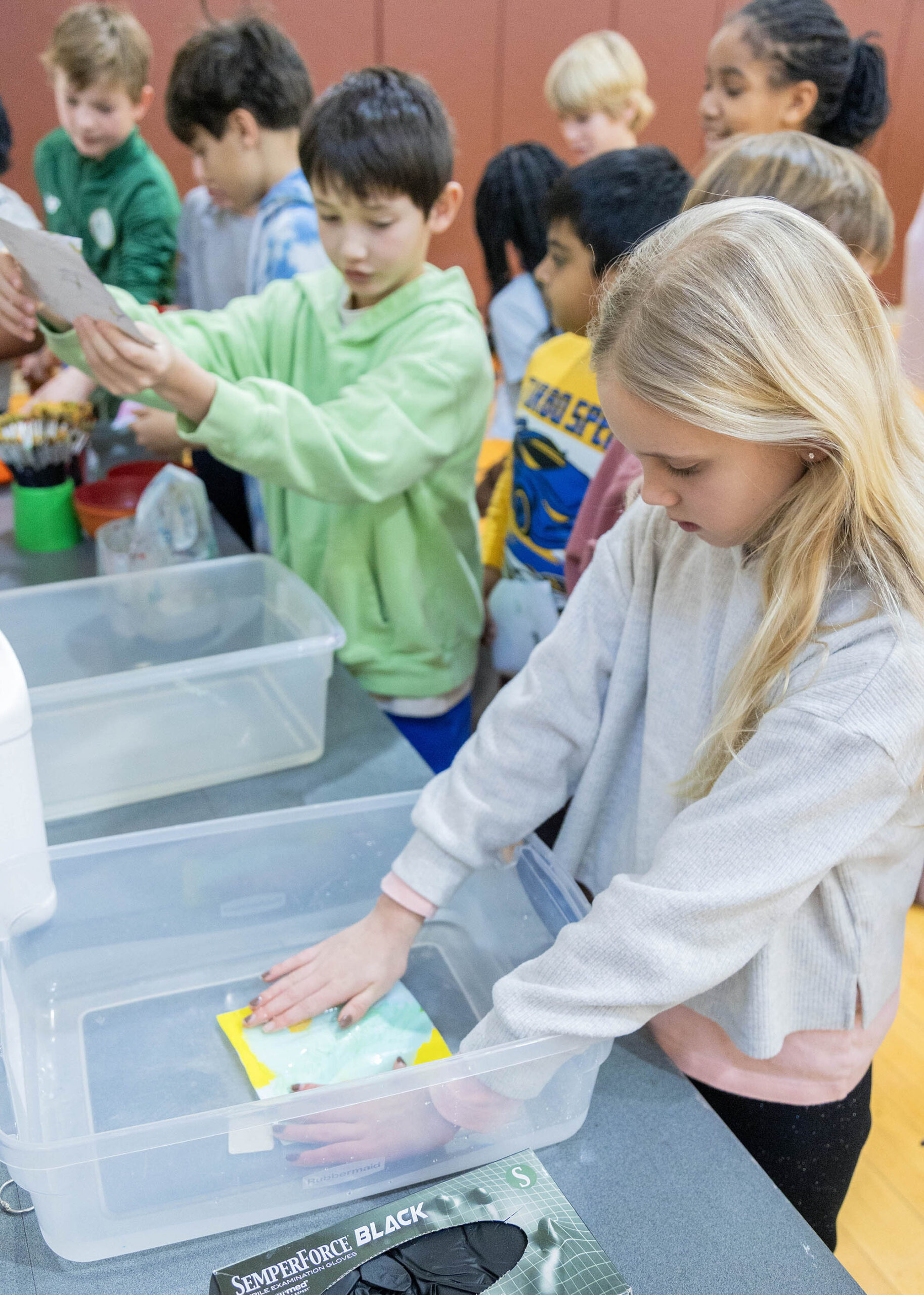 After the assembly, Griffin and Lower School Art Teacher Sarah Garner set up a painting station in the fourth-grade classrooms, where all fourth-grade students could create their own paint sculptures. Excitement, focus, chatter, and giggles filled the room as students dipped paintbrushes into the paint pots, creating abstract 6″x6″ masterpieces before lining them up at the drying stations. Later in the day, fourth graders gathered in the South Gym to wet, sculpt, dry (again), and seal their final pieces to harden the surface. The gym tables looked like a garden filled with colorful popcorn shapes!