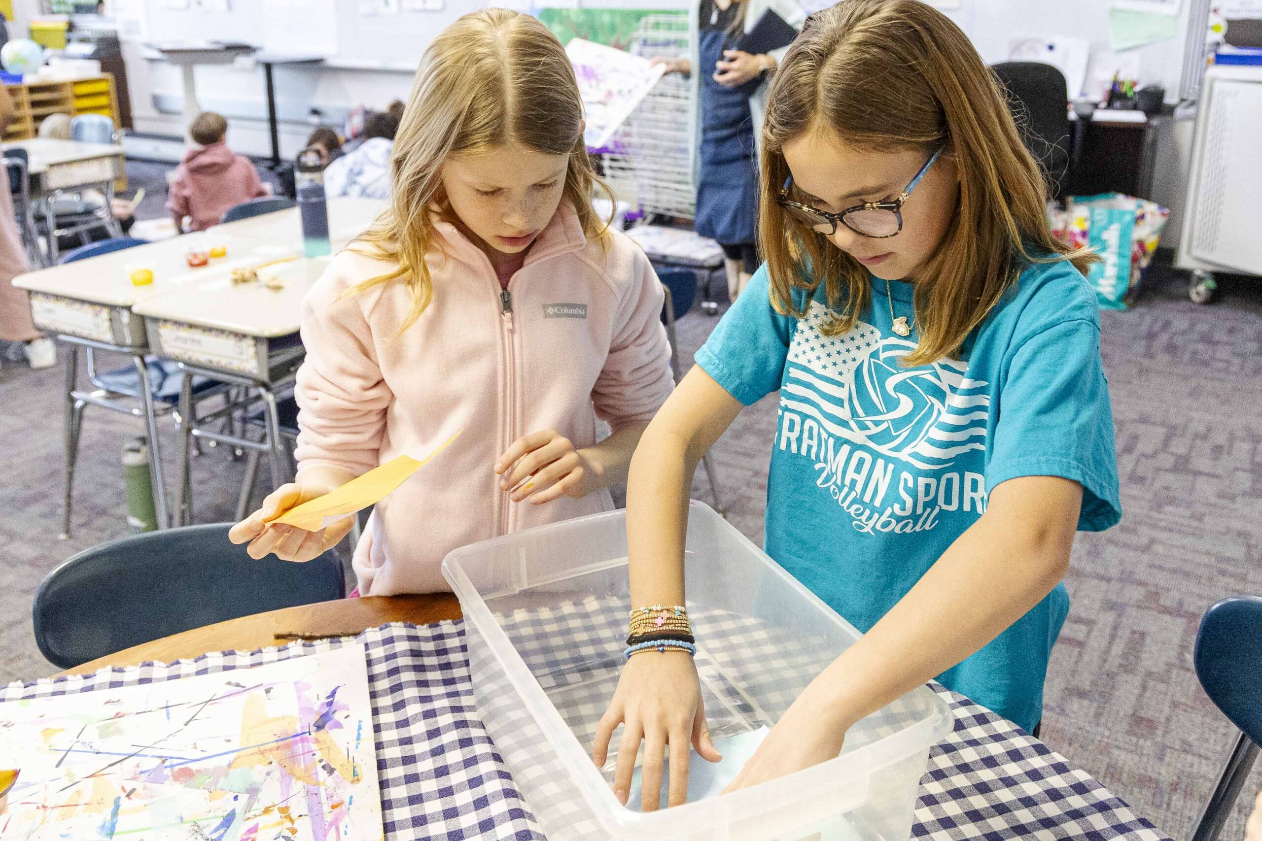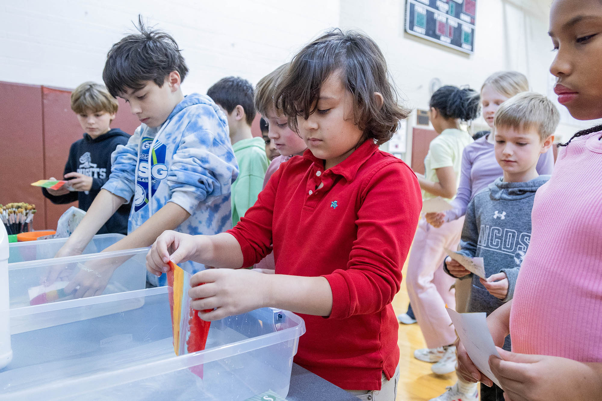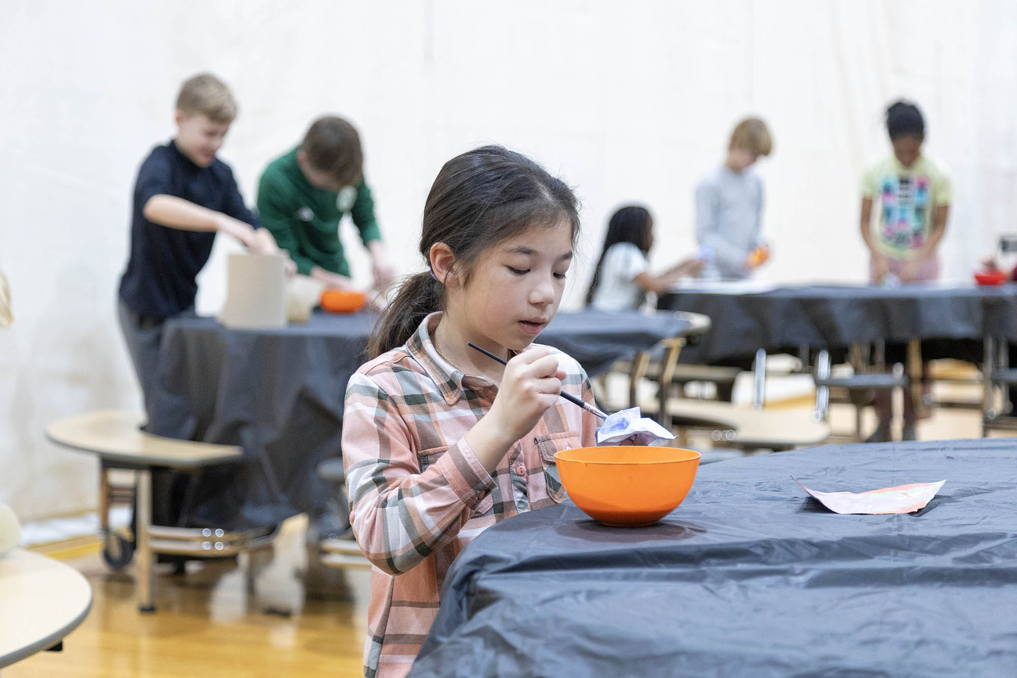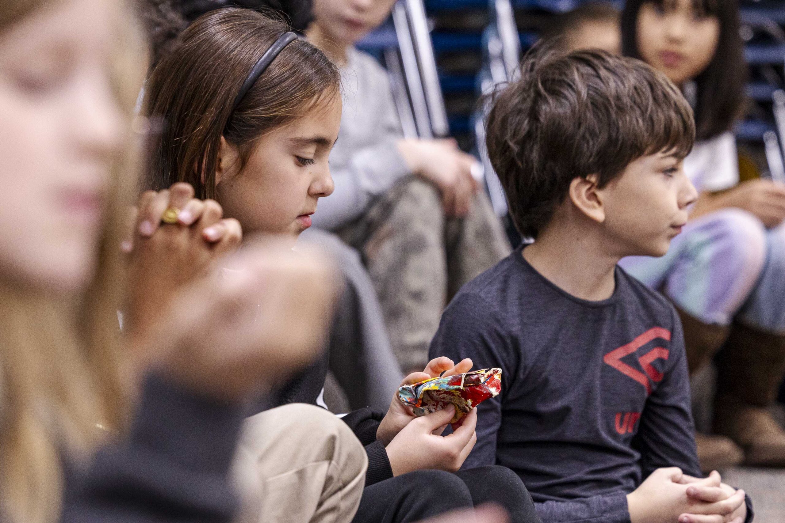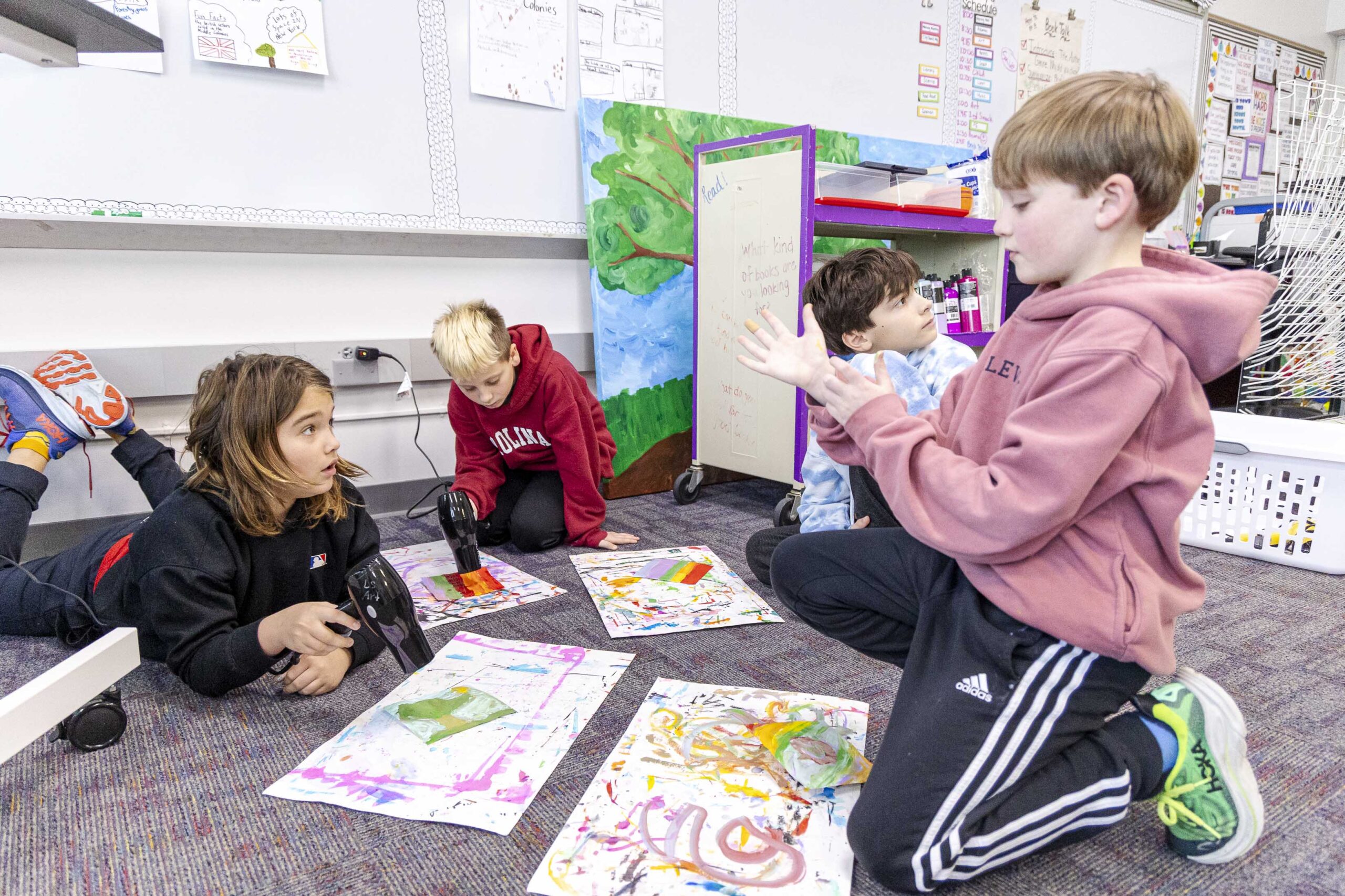 After the assembly, Griffin and Lower School Art Teacher Sarah Garner set up a painting station in the fourth-grade classrooms, where all fourth-grade students could create their own paint sculptures. Excitement, focus, chatter, and giggles filled the room as students dipped paintbrushes into the paint pots, creating abstract 6″x6″ masterpieces before lining them up at the drying stations. Later in the day, fourth graders gathered in the South Gym to wet, sculpt, dry (again), and seal their final pieces to harden the surface. The gym tables looked like a garden filled with colorful popcorn shapes!
