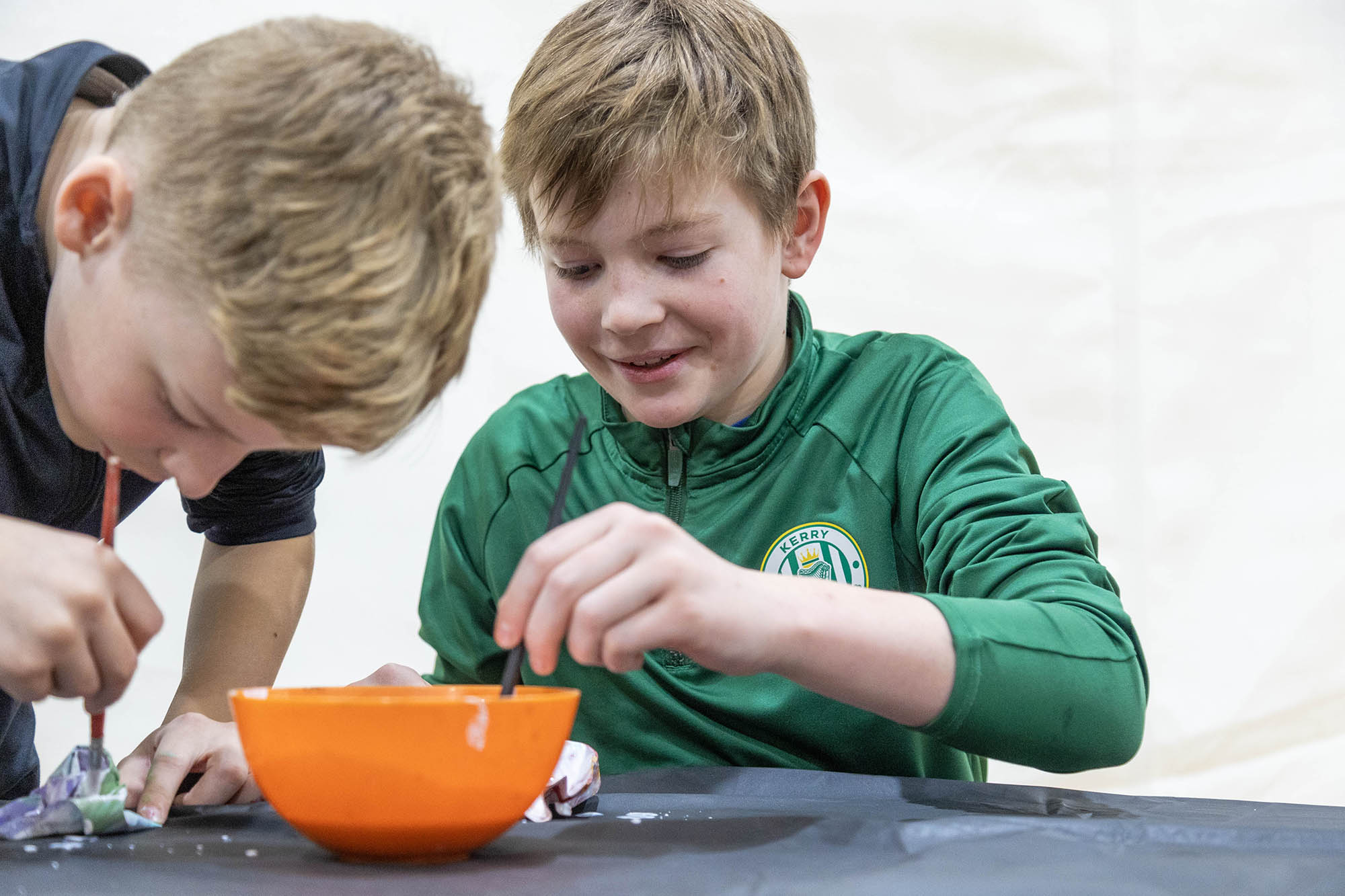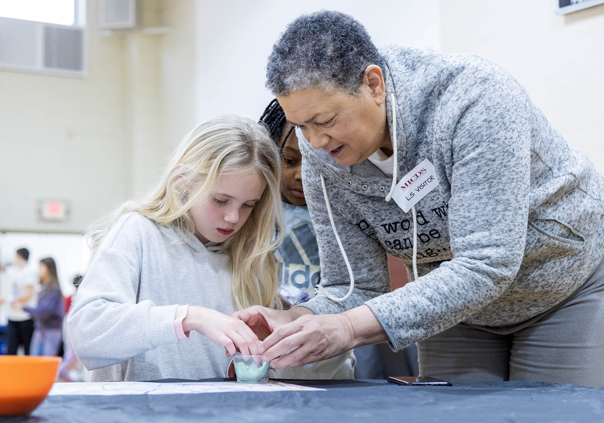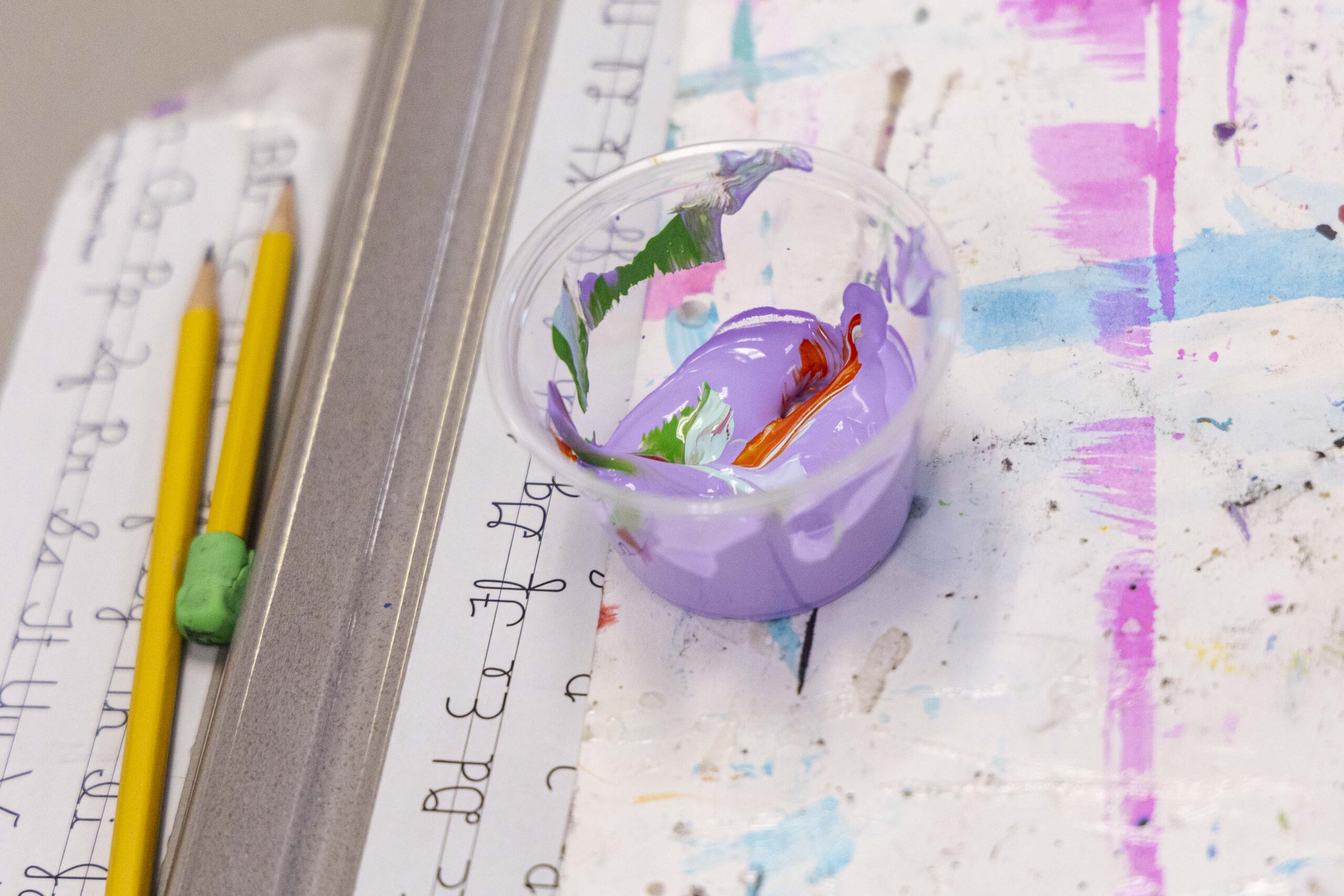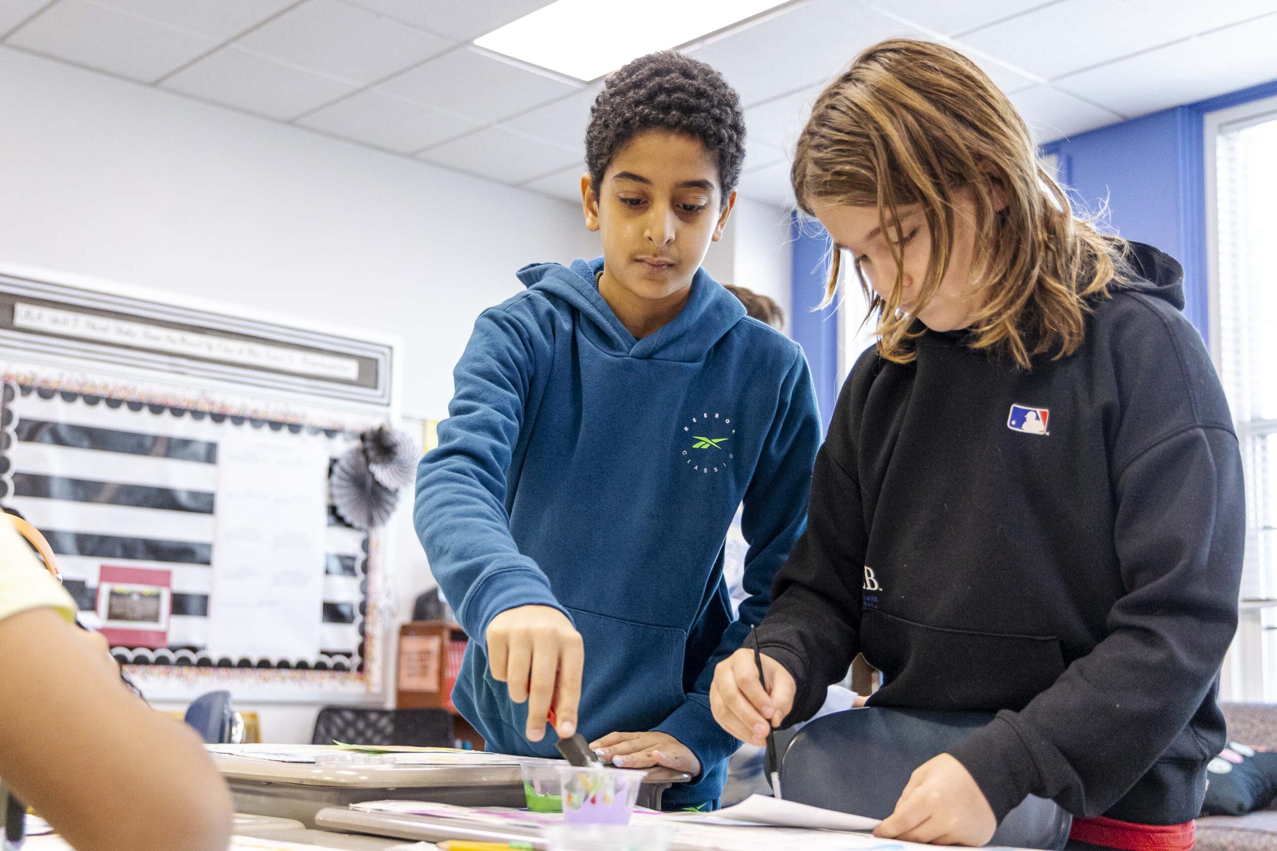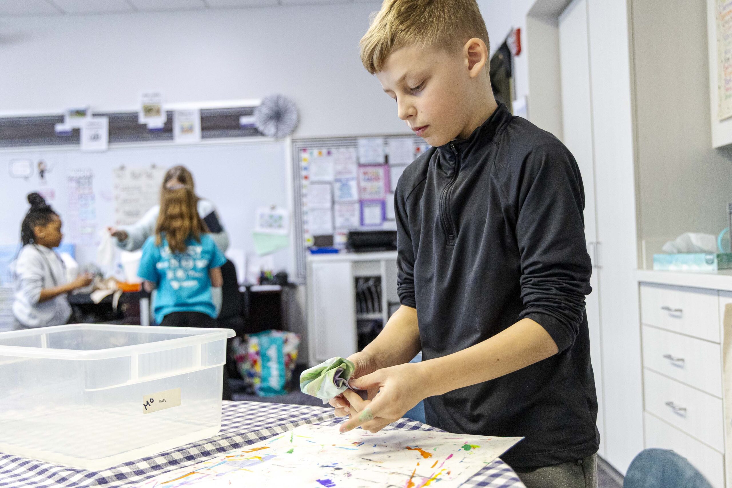 After the assembly, Griffin and Lower School Art Teacher Sarah Garner set up a painting station in the fourth-grade classrooms, where all fourth-grade students could create their own paint sculptures. Excitement, focus, chatter, and giggles filled the room as students dipped paintbrushes into the paint pots, creating abstract 6″x6″ masterpieces before lining them up at the drying stations. Later in the day, fourth graders gathered in the South Gym to wet, sculpt, dry (again), and seal their final pieces to harden the surface. The gym tables looked like a garden filled with colorful popcorn shapes!