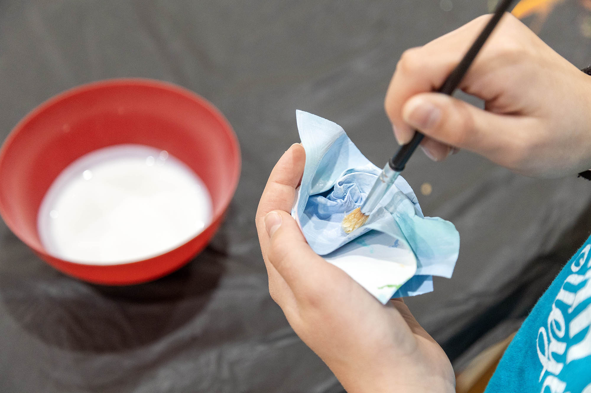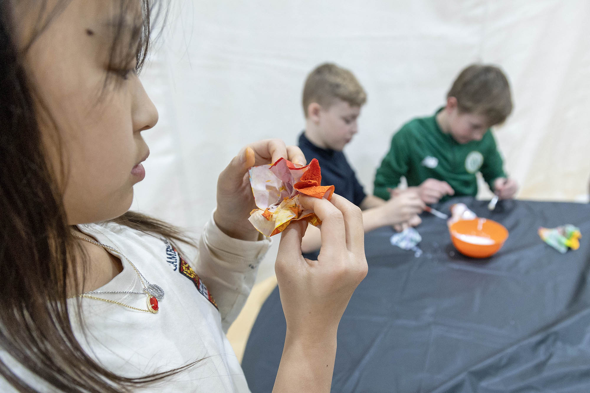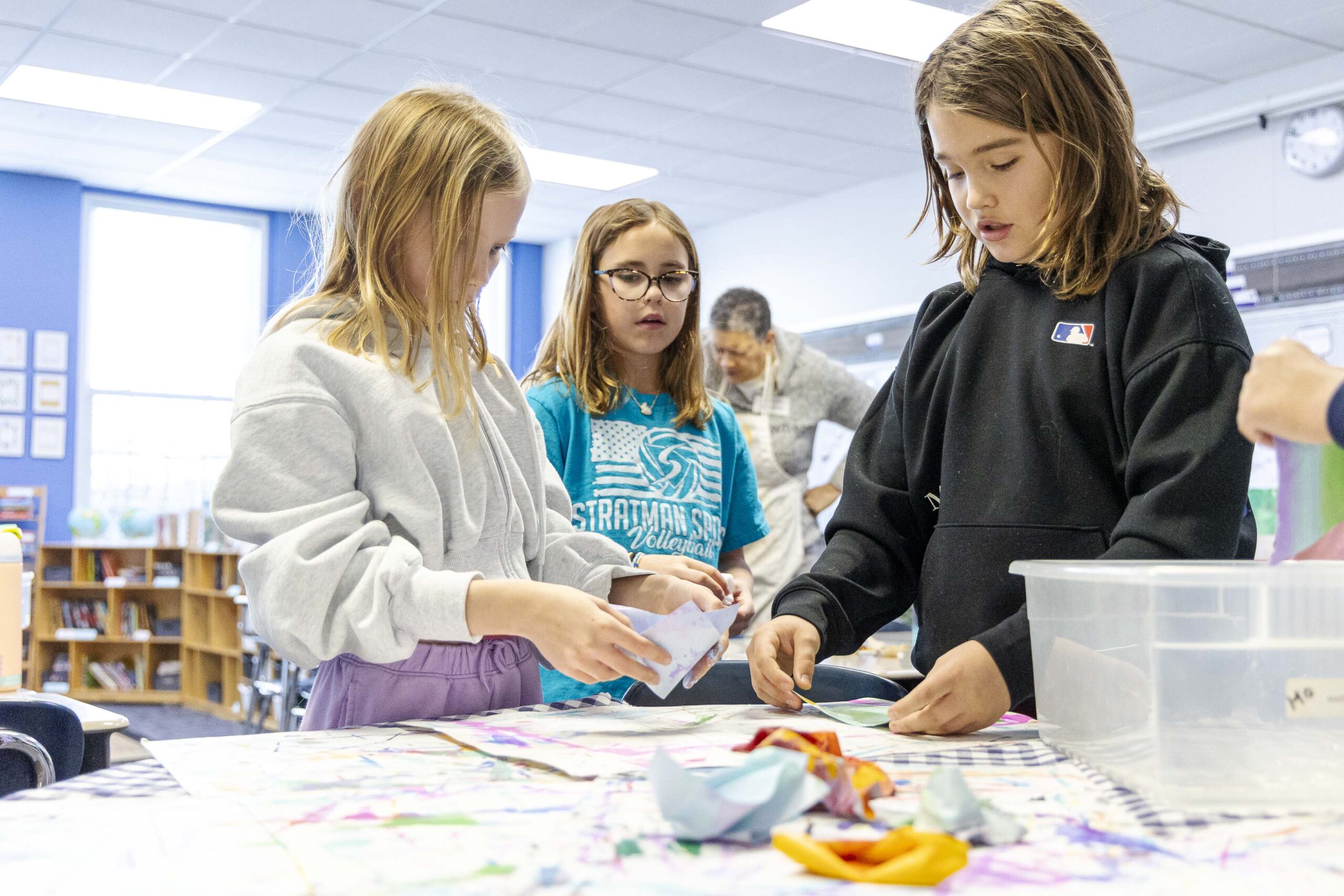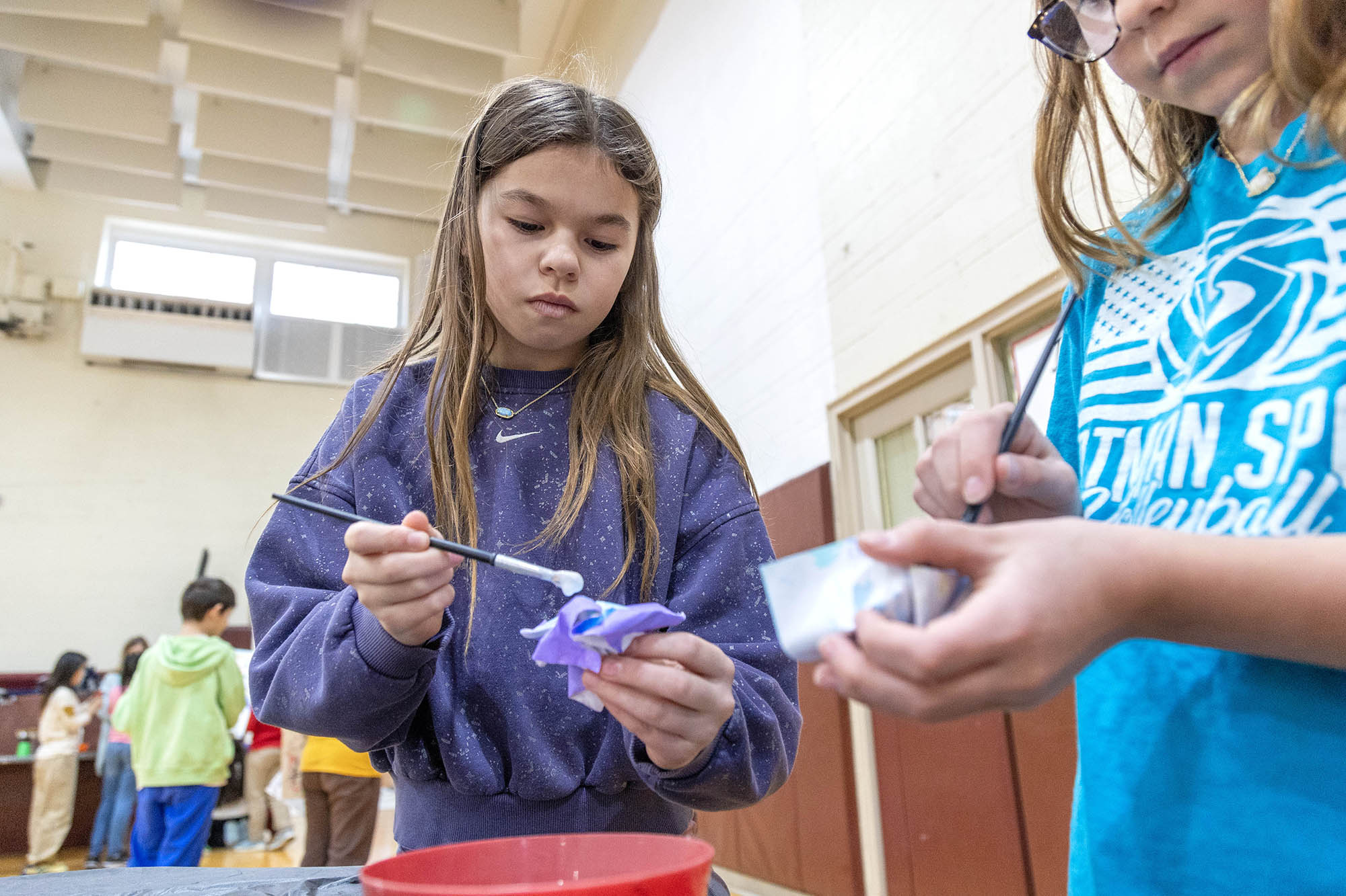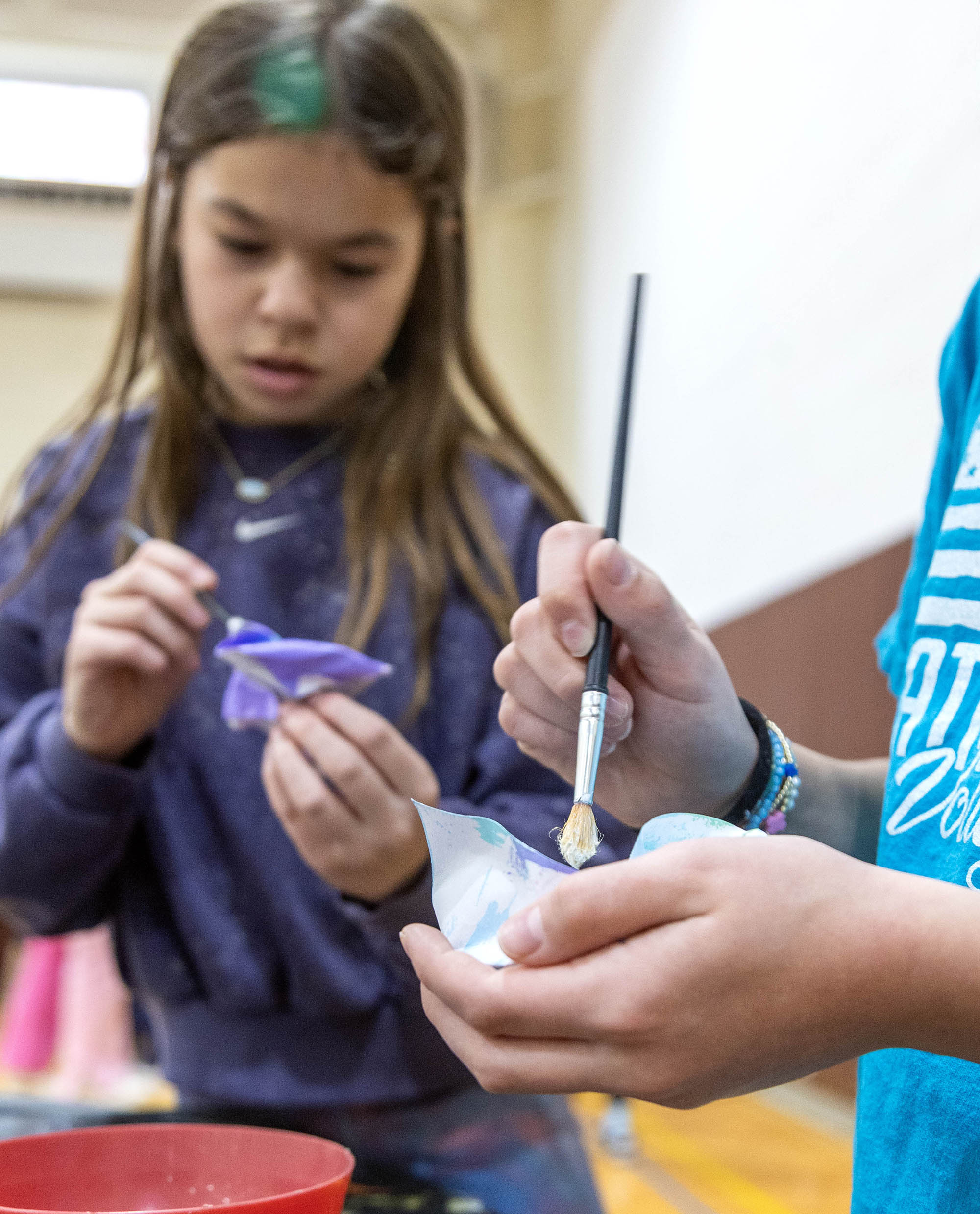 Centering on the “crumple” method, with the support of a handful of fourth-grade volunteers, she led the students through a demonstration on how to create a small sculpture from a painting. With paintbrushes in hand, the student volunteers began painting their small squares of paper with any design of their choosing, while Griffin shared more about her art process, passed around samples of her work, and took questions from the audience. Once the small paintings were complete, students dried them with heat guns, an essential step in sealing the paint to the surface. Students then briefly dipped the dried paintings into a tub of water to soften the paper before beginning to shape their pieces.