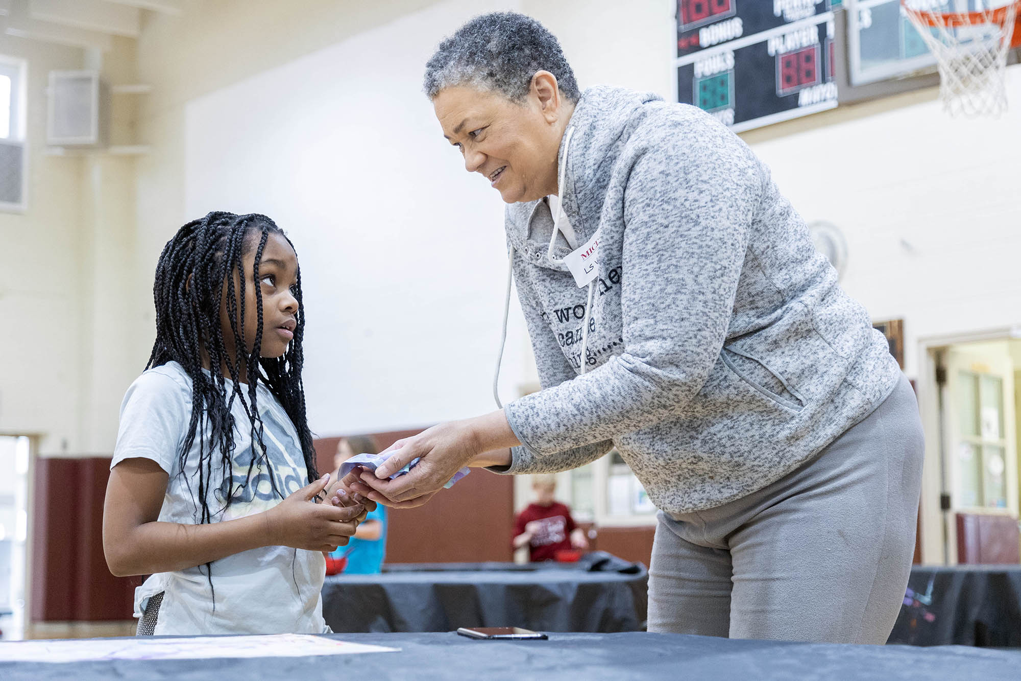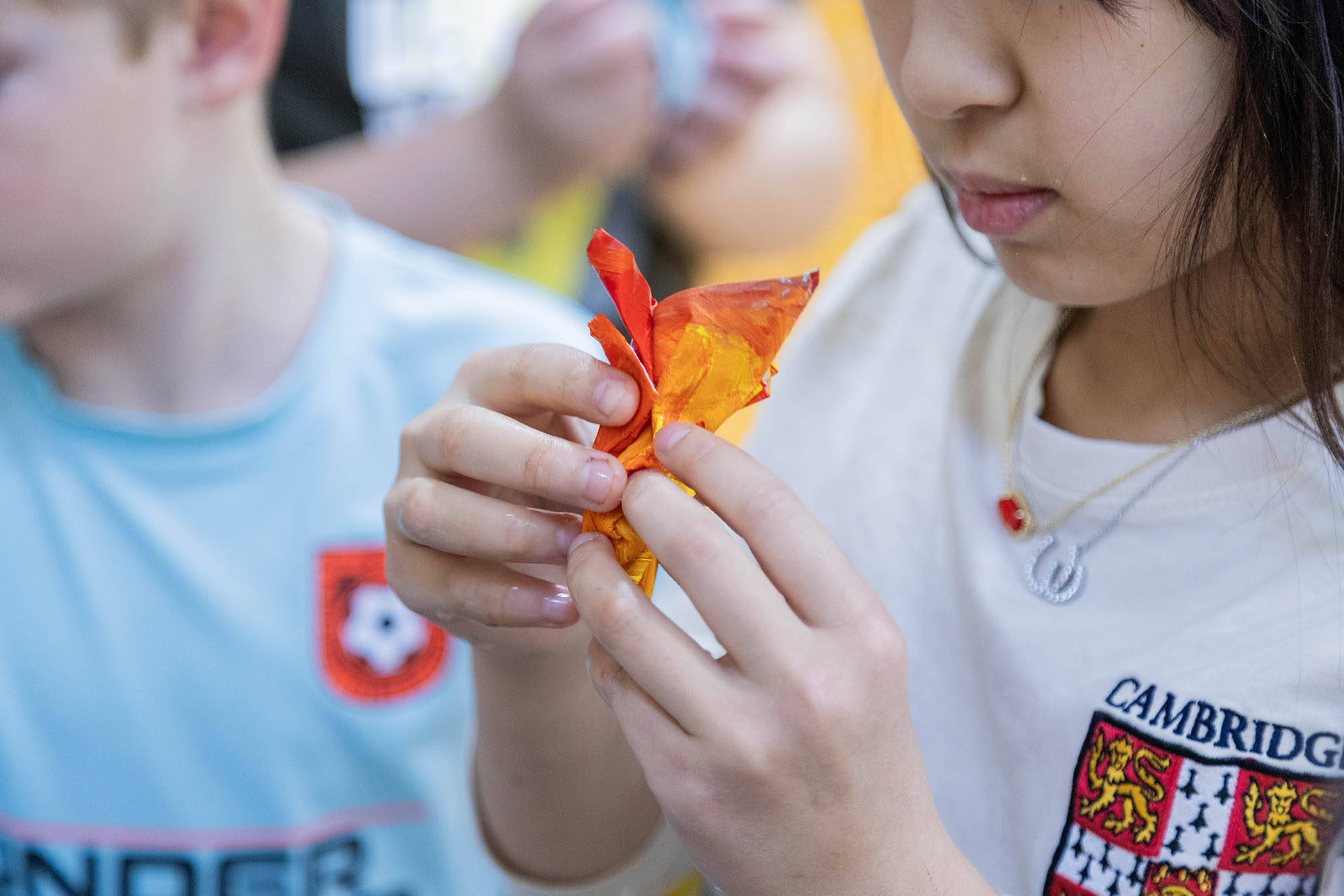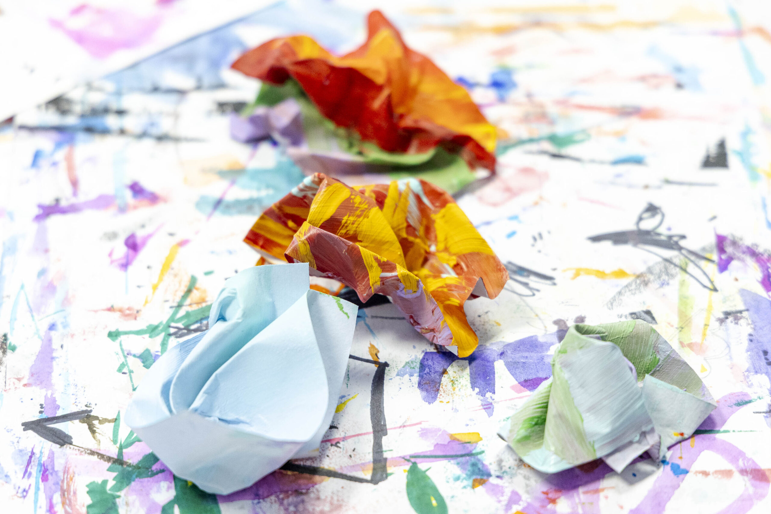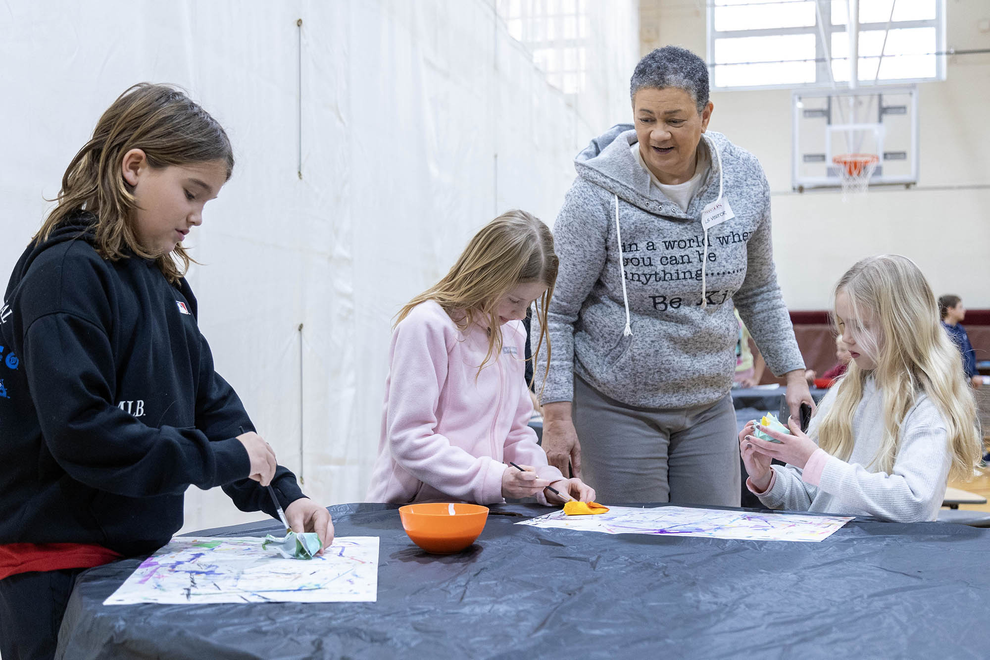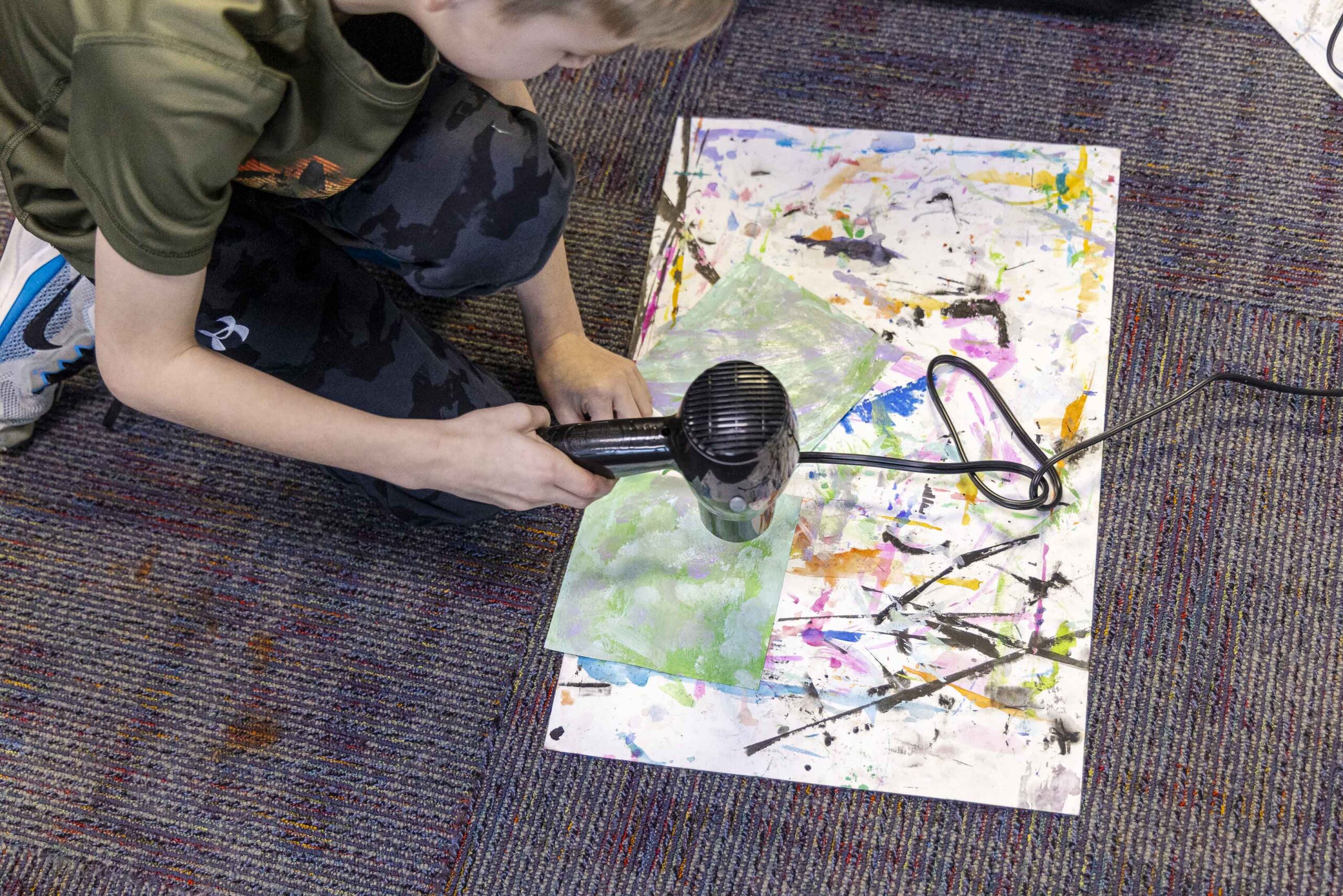 Centering on the “crumple” method, with the support of a handful of fourth-grade volunteers, she led the students through a demonstration on how to create a small sculpture from a painting. With paintbrushes in hand, the student volunteers began painting their small squares of paper with any design of their choosing, while Griffin shared more about her art process, passed around samples of her work, and took questions from the audience. Once the small paintings were complete, students dried them with heat guns, an essential step in sealing the paint to the surface. Students then briefly dipped the dried paintings into a tub of water to soften the paper before beginning to shape their pieces.