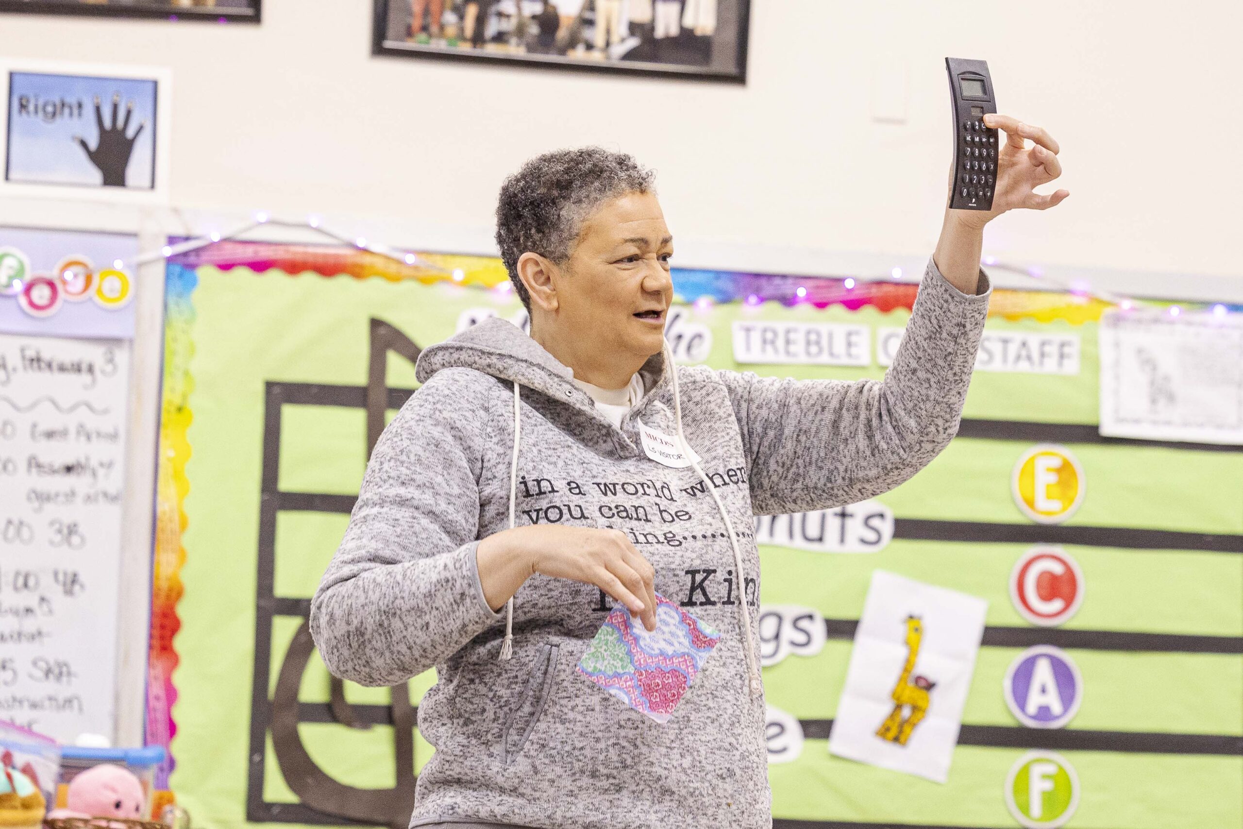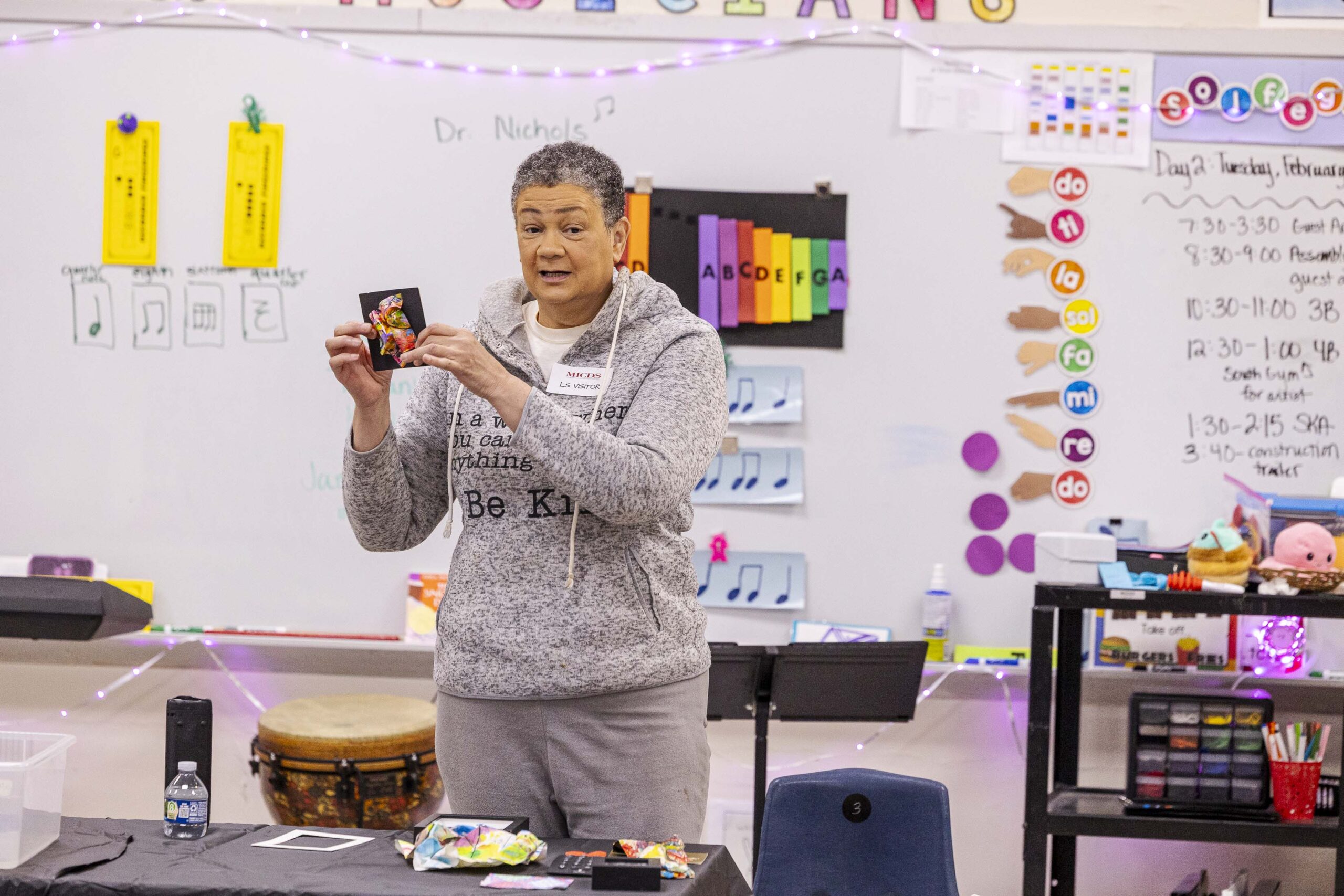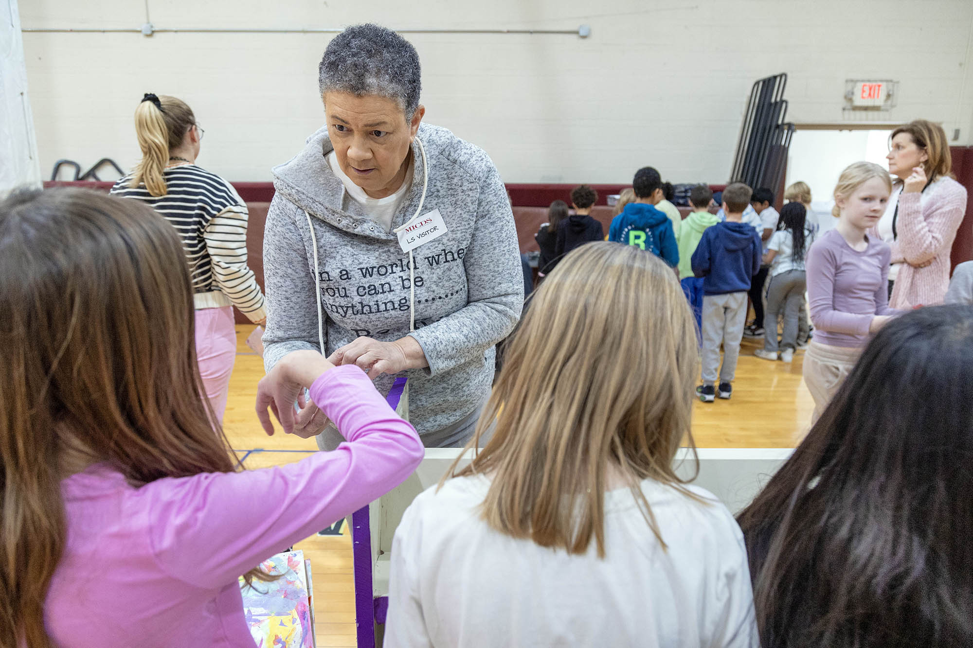When visiting the Lower School assembly, she told the students, “One day, I created a painting, but decided I didn’t like it and crumpled it up. The result became a work of art in itself.” She also shared a story of perspective. One of her earlier painting efforts, once finished, was far from what she had in mind. She said, “Painted on a sheet of inexpensive paper, I was seconds from balling it up and tossing it in the trash – and then my eye fell on a small white [picture frame] mat. Maybe, just maybe, I could salvage a small part of the painting by placing the mat on various portions. As it turned out, I placed the mat in the middle of the painting, and voilà: the painting destined for the trash can just moments before suddenly became a beloved piece. Beauty is in the eye of the beholder, or in other words, your perspective.