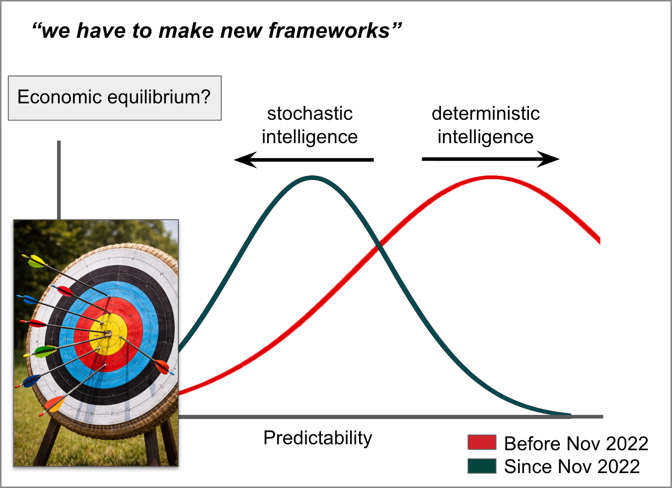 Since November 2022, however, greater educational and professional security may obtain in complementing these deterministic behaviors with others less correlated with predictability—creativity, spontaneity, risk tolerance, trial and error, and ingenuity, for example. The word “stochastic,” which computer scientists use to describe the introduction of randomness into LLM AI processes, derives from the Ancient Greek word for an archery target. In a perfectly deterministic system, the flight path of the arrow never changes. In a hybrid deterministic and stochastic system, the flight path of the arrow is generally true to the target but varies with each shot.