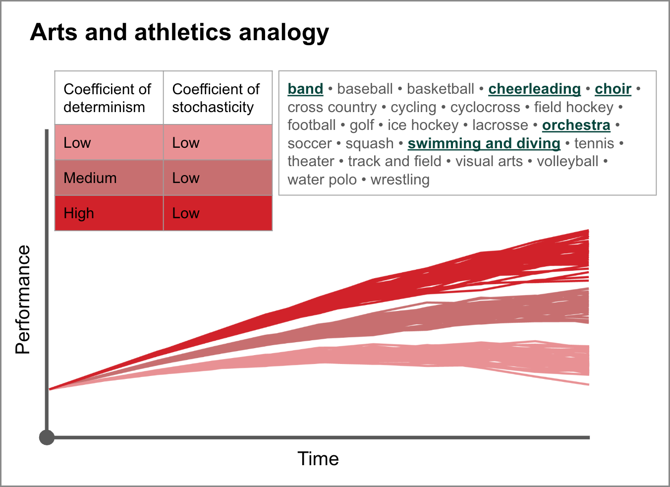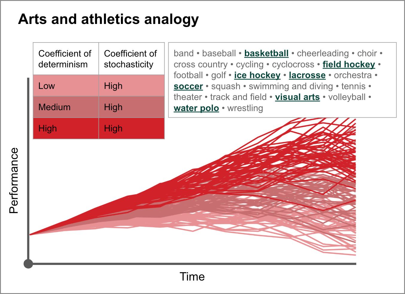 Our arts and athletics offerings at MICDS, like archery, are similarly analogous to the design of LLM technologies. Some are much more deterministic than stochastic—more predictable than random—and performance is therefore highly correlated with behaviors like consistency and repetition. Other programs, however, are significantly stochastic. After the ball is inbounded in a basketball or soccer game, for instance, the events that follow, with so much opportunity for variety, are nearly impossible to predict; and the production of visual art—painting a blank canvas, say, or shaping an undefined lump of clay—is perhaps least predictable of all. How wonderful that so many different kinds of artistic and athletic experiences, each requiring in its own balance of deterministic and stochastic intelligences, are available to our students in anticipation of their “real-world” lives.