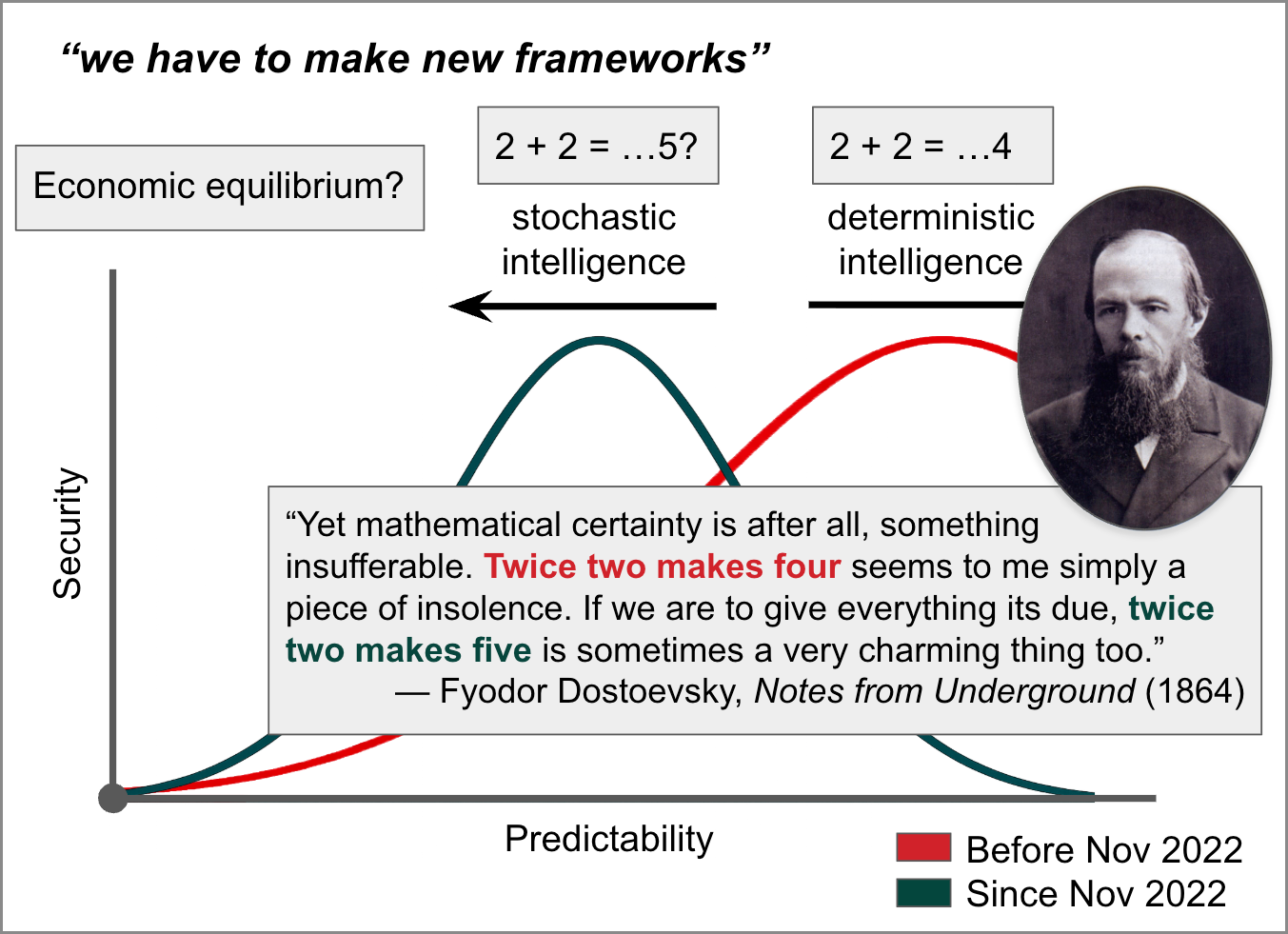I am reminded that as long ago as 1864—158 years before ChatGPT made its debut—the Russian writer Fyodor Dostoevsky posited a similar connection between unpredictability and happiness. “Mathematical certainty is after all, something insufferable,” says the narrator of his novella Notes from Underground. “Twice two makes four seems to me simply a piece of insolence. If we are to give everything its due, twice two makes five is sometimes a very charming thing too.” The point is not to abandon the determinism of twice two makes four; the point is to embrace simultaneously—and strategically, in the face of the rise of LLM AI—the stochasticity of twice two makes five.