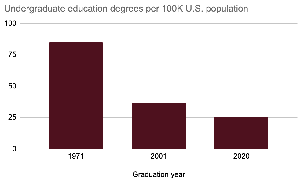 Viewed through a different lens—one that comprehends the importance of maintaining a sufficiently sized K-12 teaching workforce for the sustainability of a high-functioning society—these data reveal a decrease from 85 undergraduate education degrees conferred per 100,000 United States residents in 1971 to only 26 in 2020, a 69% drop in the population of new entrants into the teaching profession relative to the population of the citizenry they serve. Parental attitudes surely play a role in this decline. In 1969, only 15% of United States parents answered “no” when asked, “Would you like your child to become a teacher?”’ In 2018, 54% of parents answered “no.”