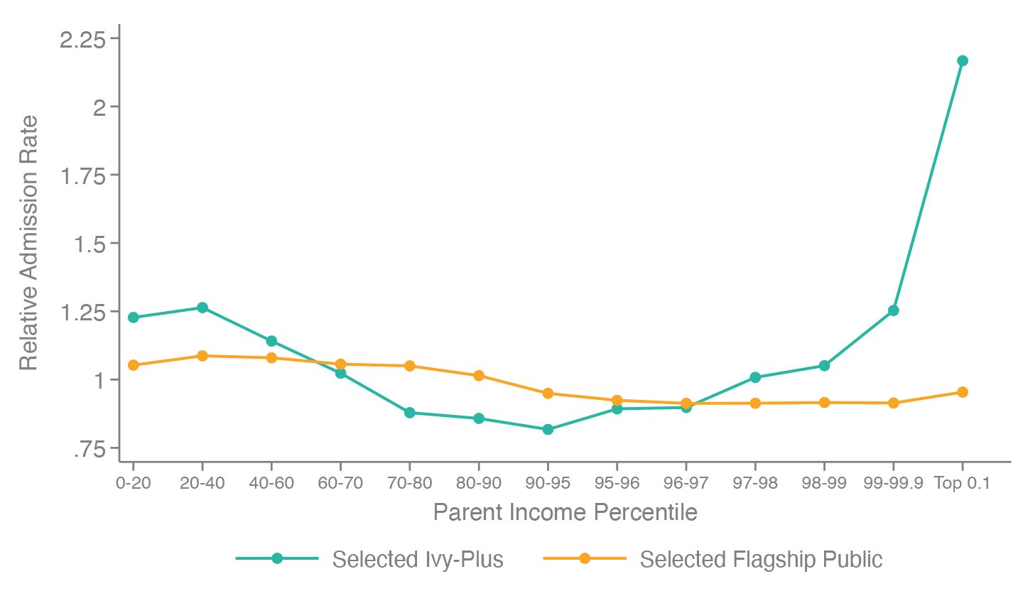 As for White students, while it is true that undergraduate populations at Ivy-Plus institutions are now “majority minority” (65% of American households are White, whereas only 40% of Ivy-Plus domestic undergraduates are), because about half of their domestic White students are from the top 4% of households, and because high-income applicants have the greatest admissions advantage at Ivy-Plus institutions, White students enjoy the highest average likelihood of acceptance to those institutions—an advantage that belies the supposed reverse discriminatory impacts of (now illegal) affirmative action programs. At public flagship universities, while higher income-earning households are also overrepresented, no racial or ethnic group has such an advantage.