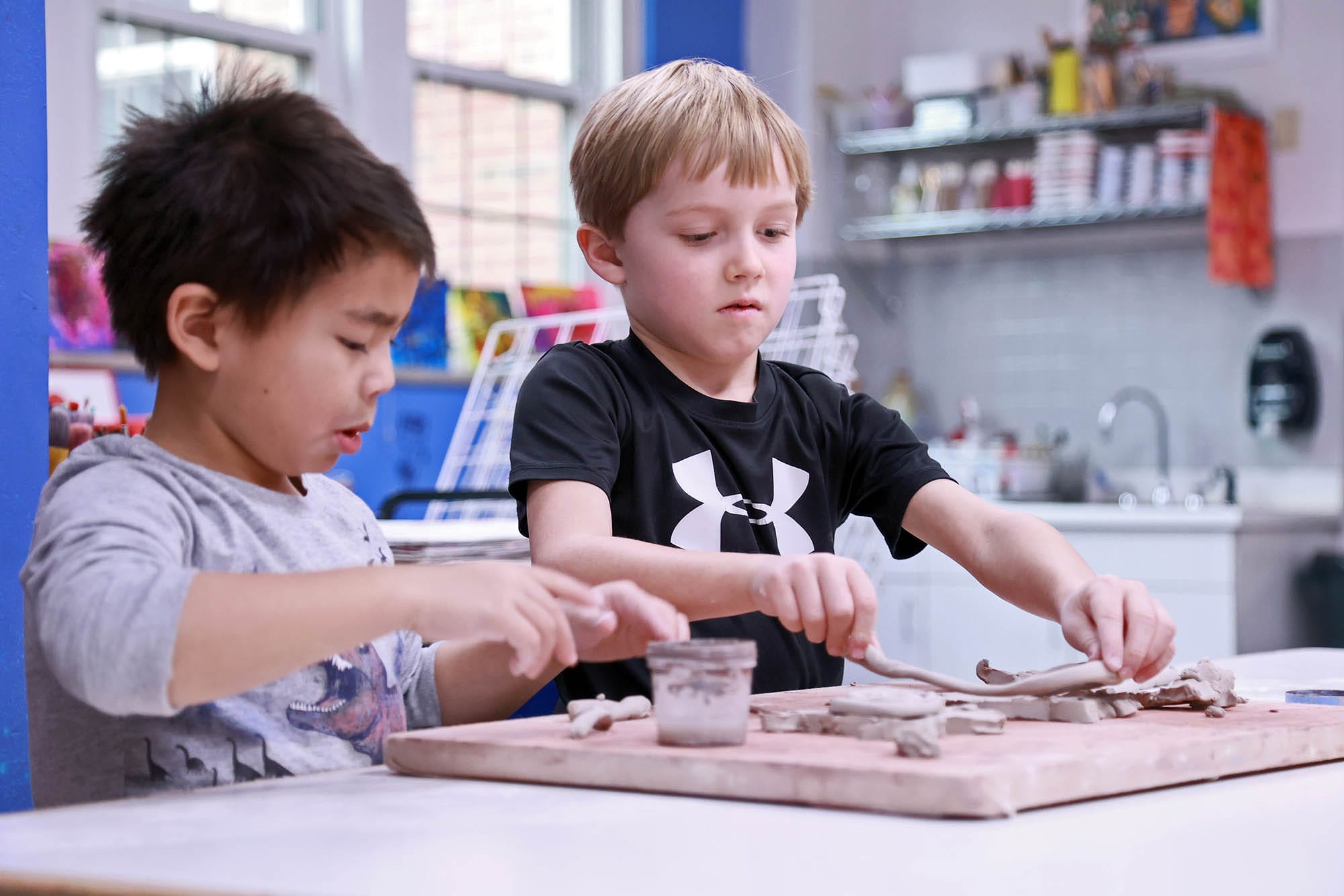 With a clean, smooth stroke, Sarah Garner, Lower School Visual Arts Teacher, pulls a wire through a block of clay. She separates the even slabs and gives them to her students who begin to manipulate the soft material. “Every medium can present challenges in different ways for different artists,” says Garner. This lesson is no different. “As with most mediums we use, students at Beasley have a mindset that includes ‘stretch and explore,'” she explains. “Clay certainly can be tricky,” she says, but the skills students learn in art class are set up to build and be cyclical throughout the JK-4 experience. “As a result, most students feel confident and excited when working with clay.”