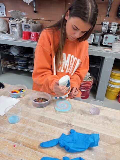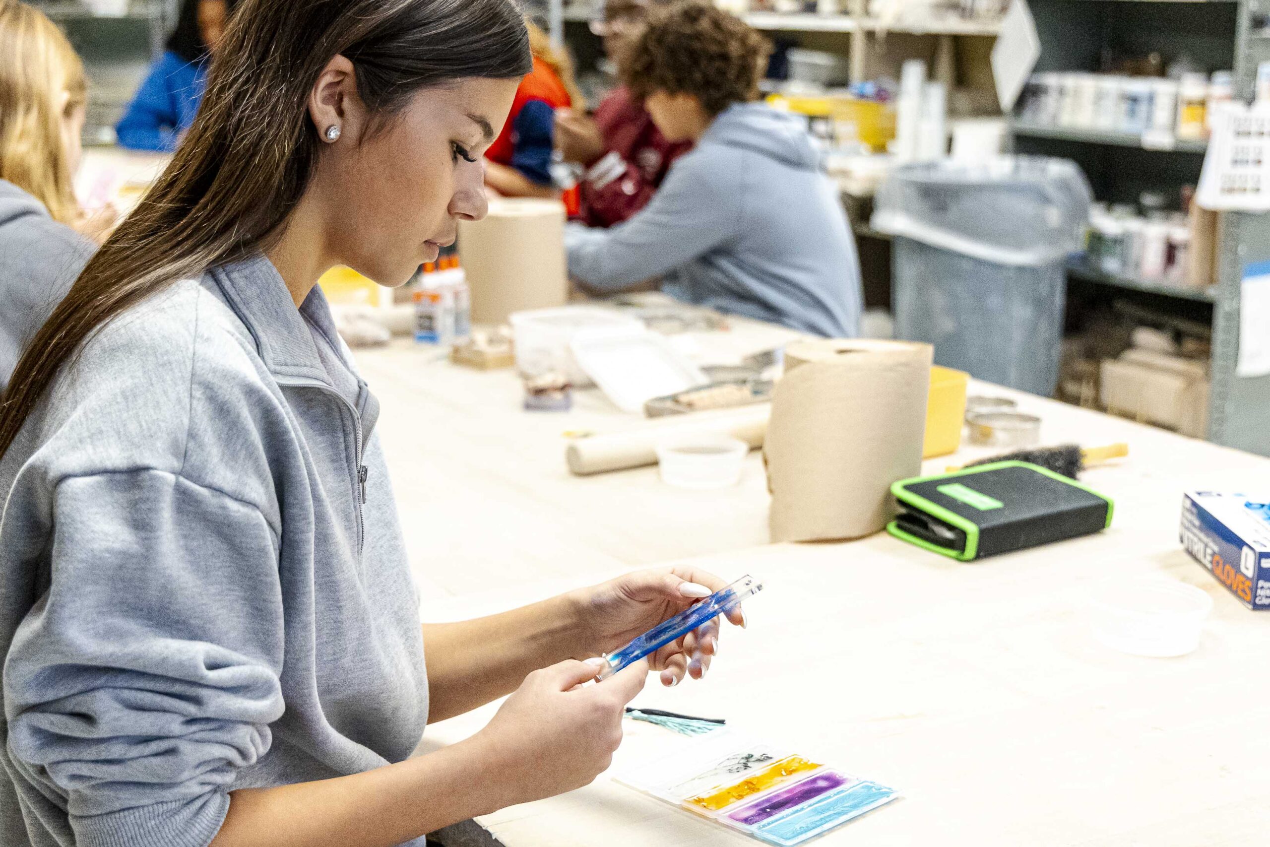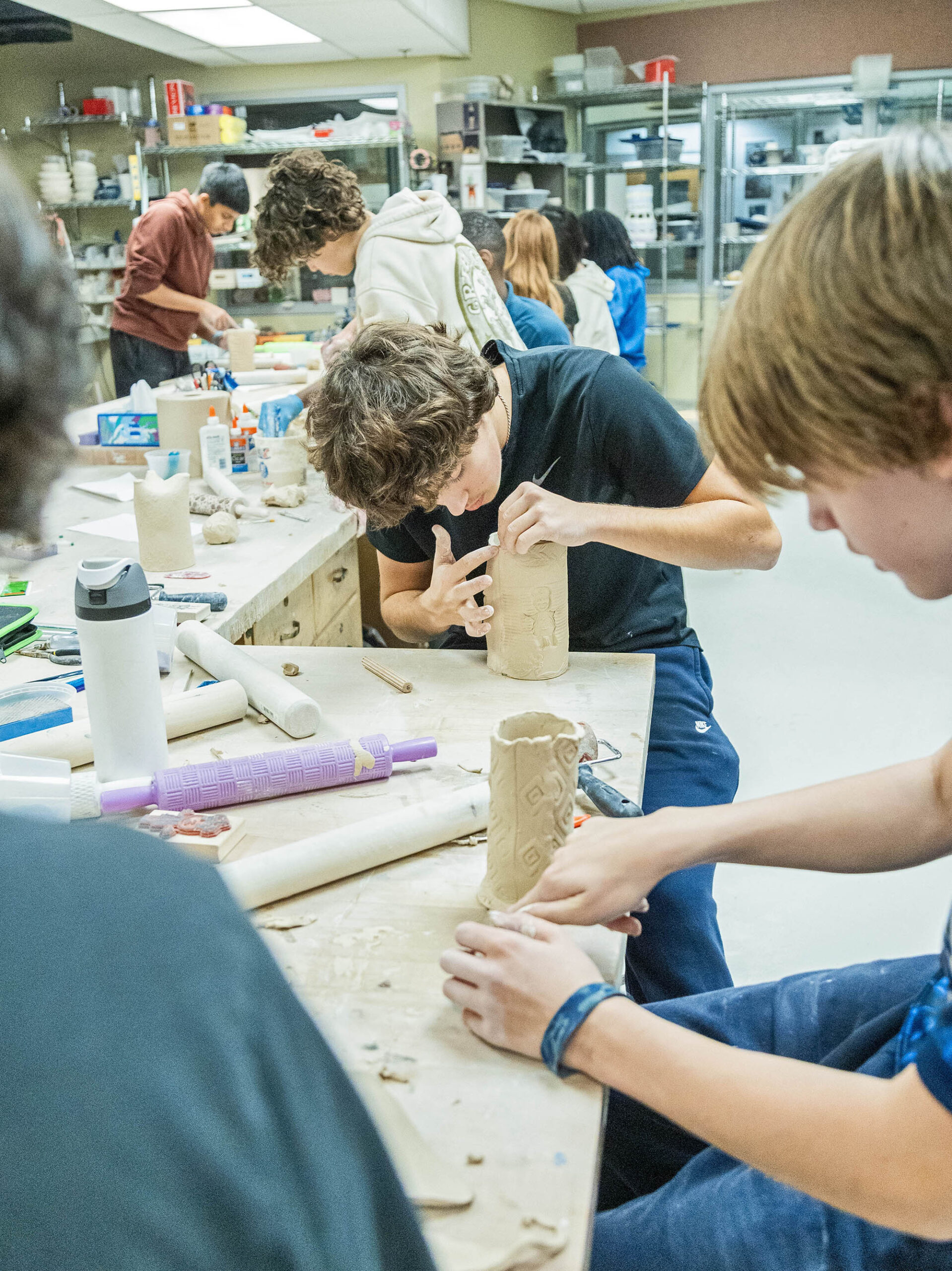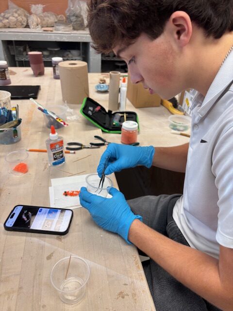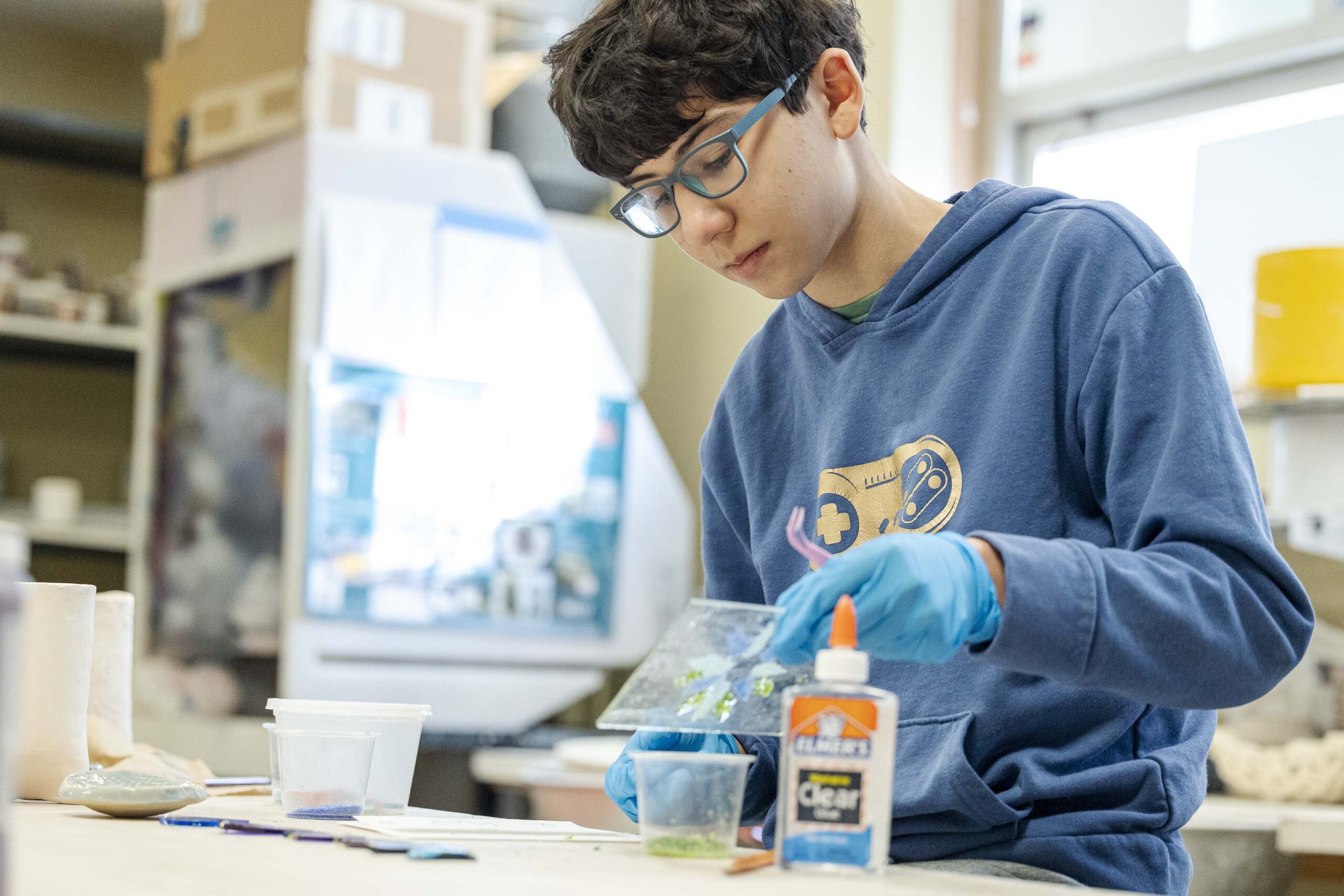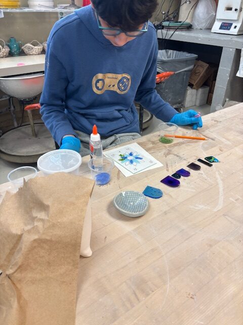 For Cyrus Kummer ’28, a choir student who doesn’t have as much access to a visual arts studio like Kieran, said, “I’ve enjoyed being able to experience tons of types of art that I wouldn’t normally be able to experience. I like working with resin to create molds. Working with clay at the potter’s wheel was challenging. But right now I’m working on a glass suncatcher.”