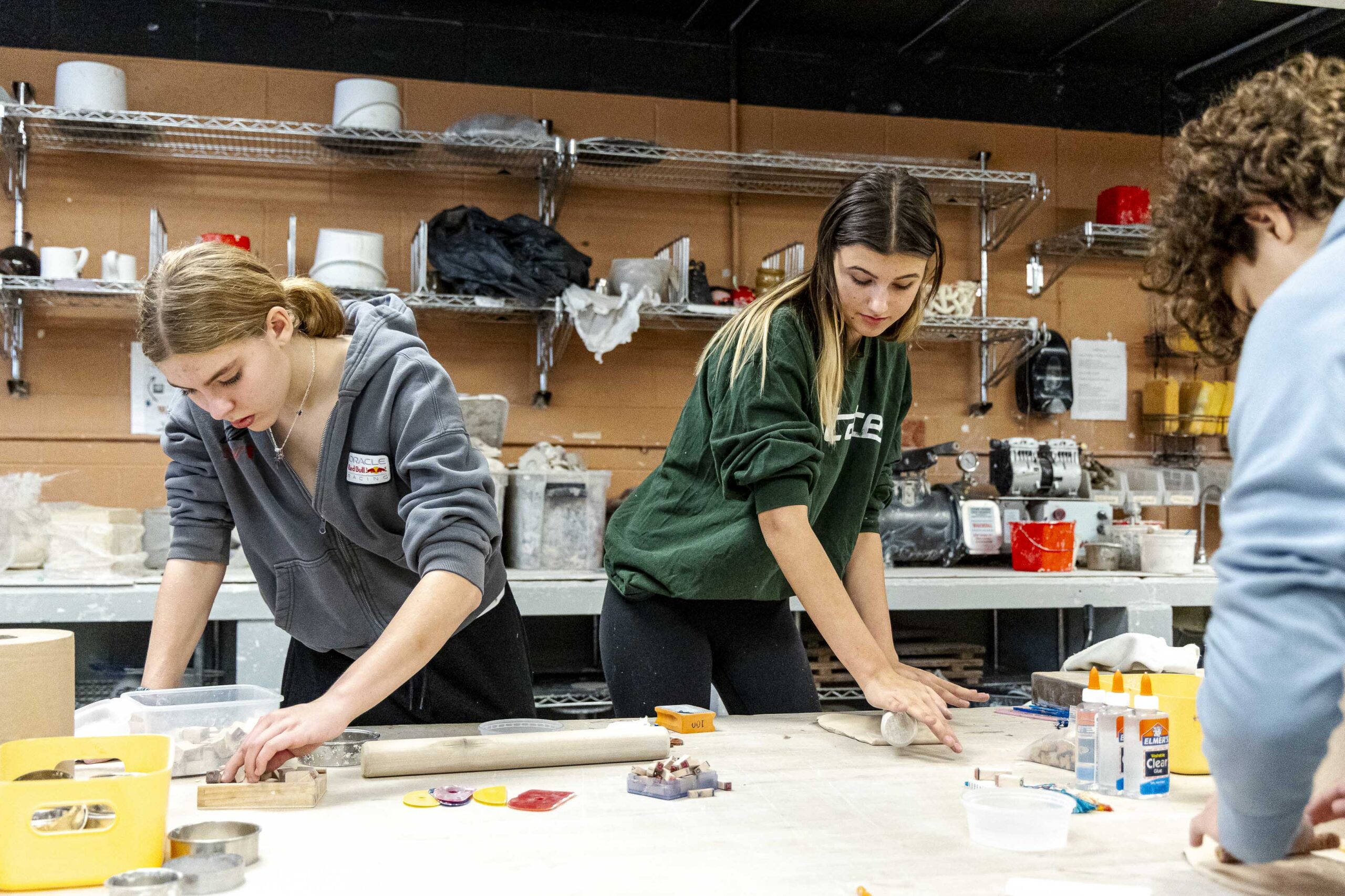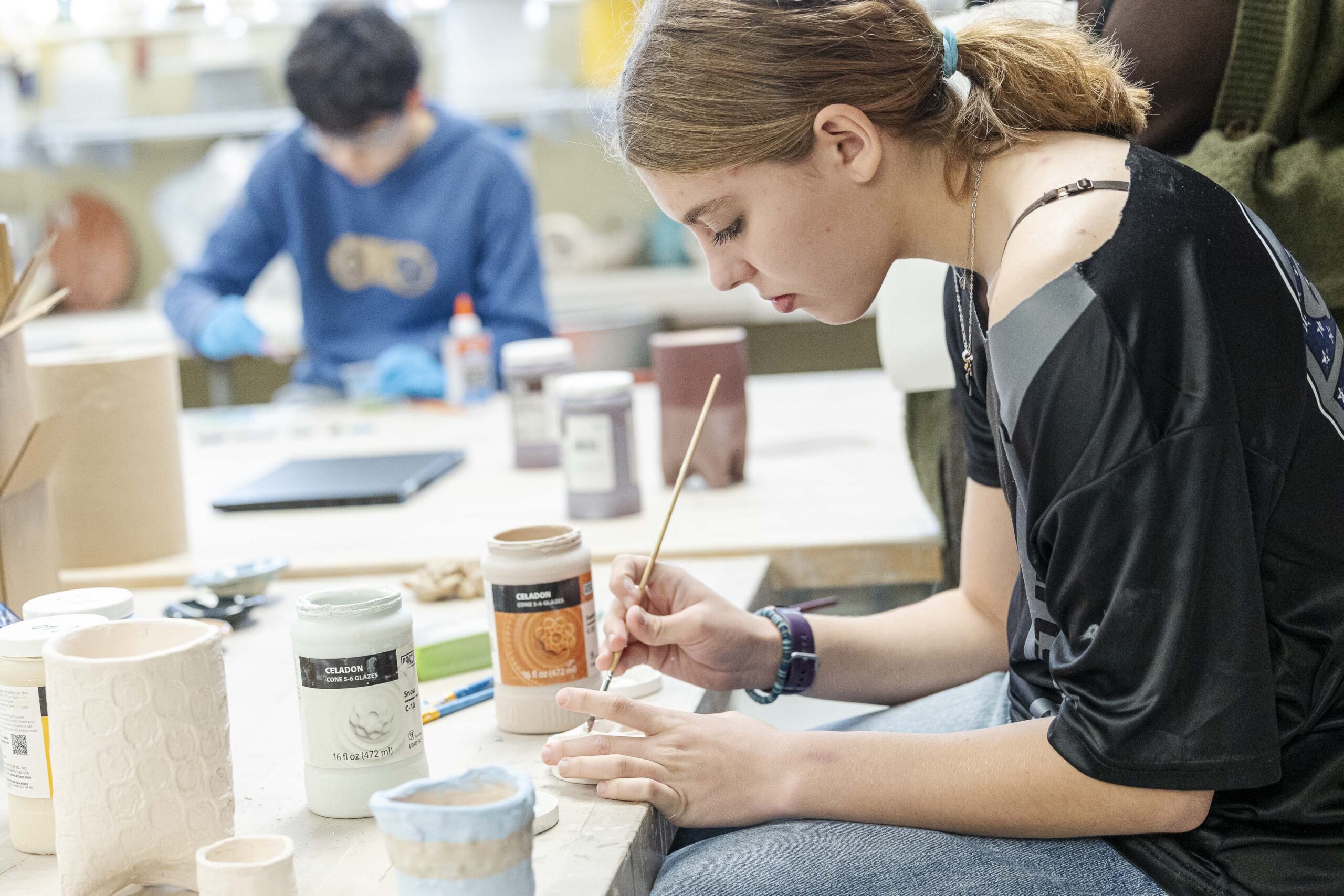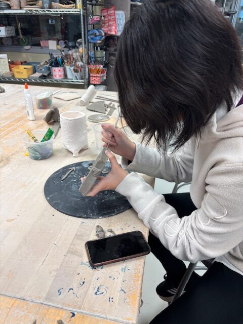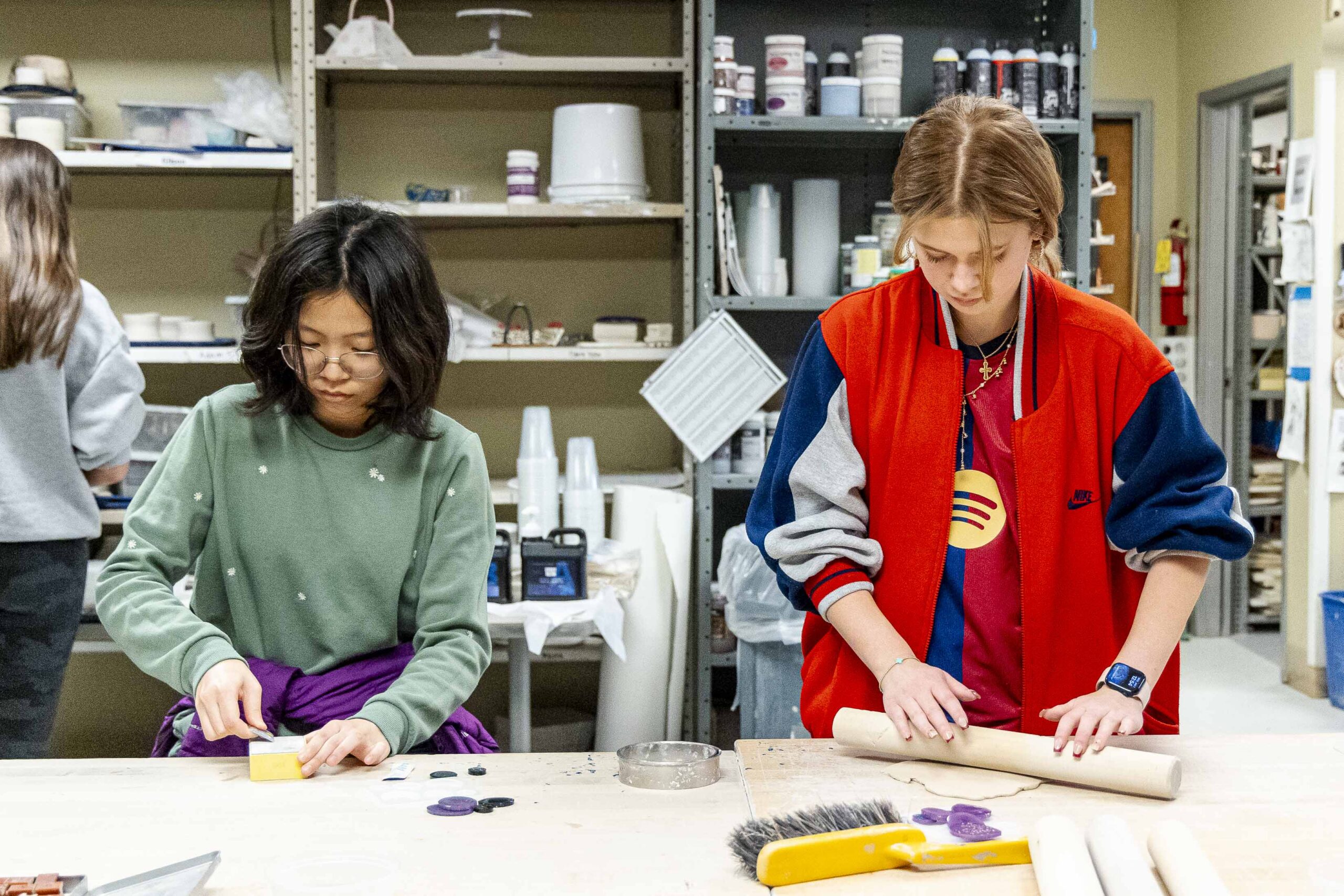 For Cyrus Kummer ’28, a choir student who doesn’t have as much access to a visual arts studio like Kieran, said, “I’ve enjoyed being able to experience tons of types of art that I wouldn’t normally be able to experience. I like working with resin to create molds. Working with clay at the potter’s wheel was challenging. But right now I’m working on a glass suncatcher.”