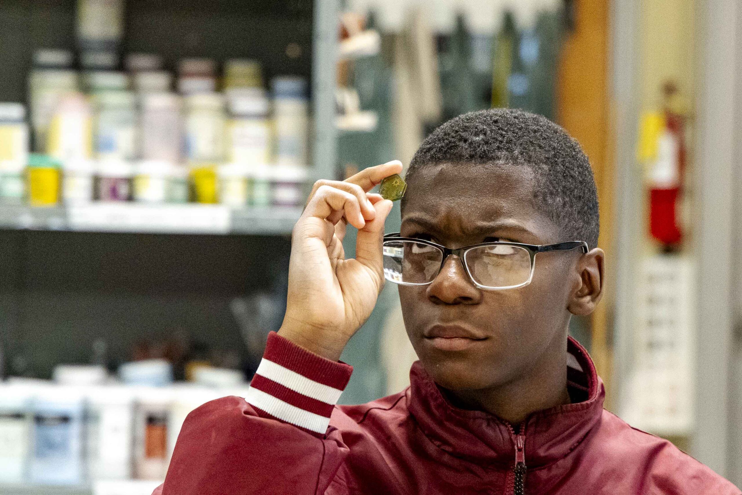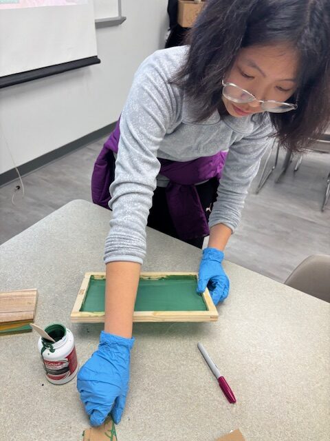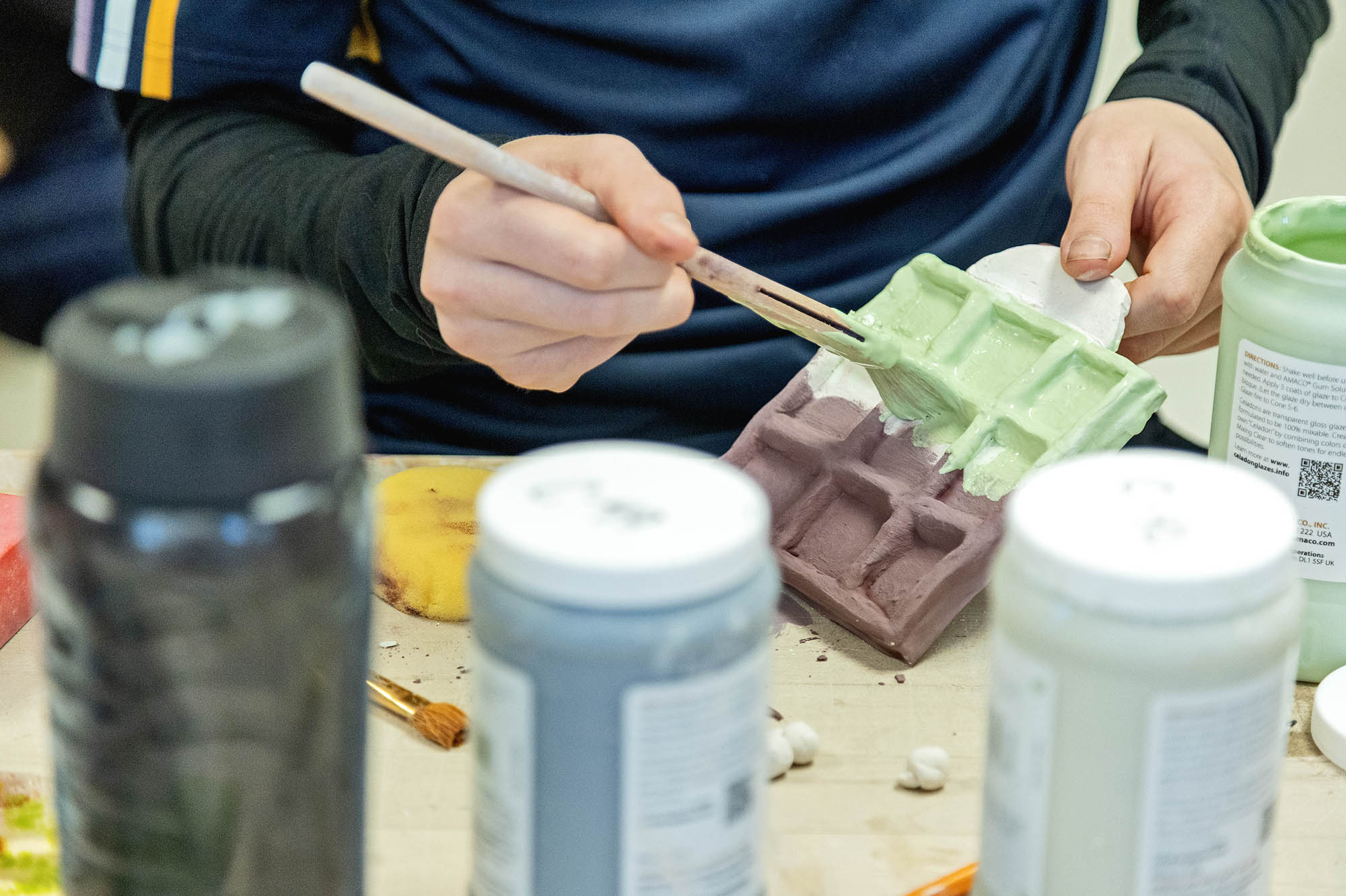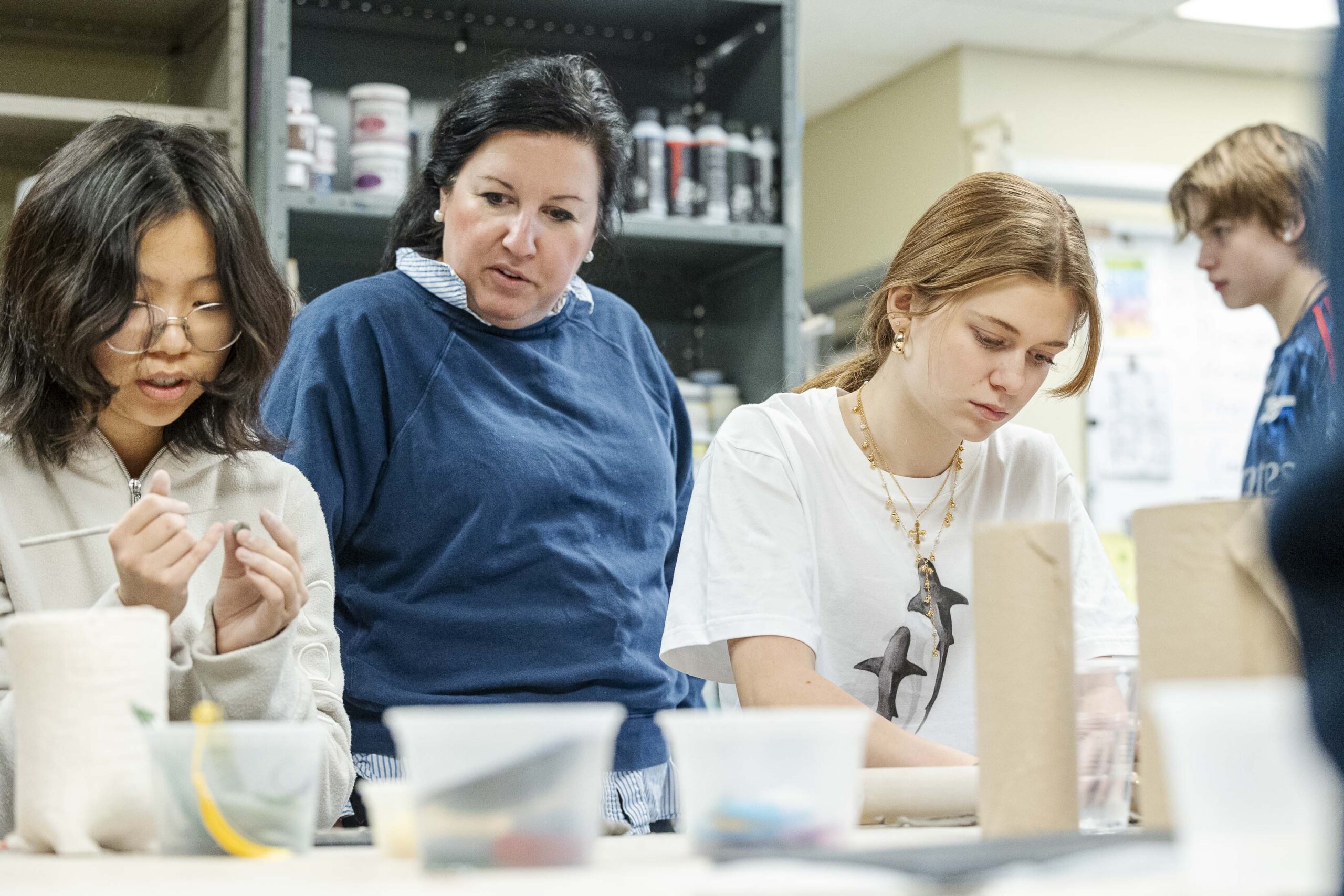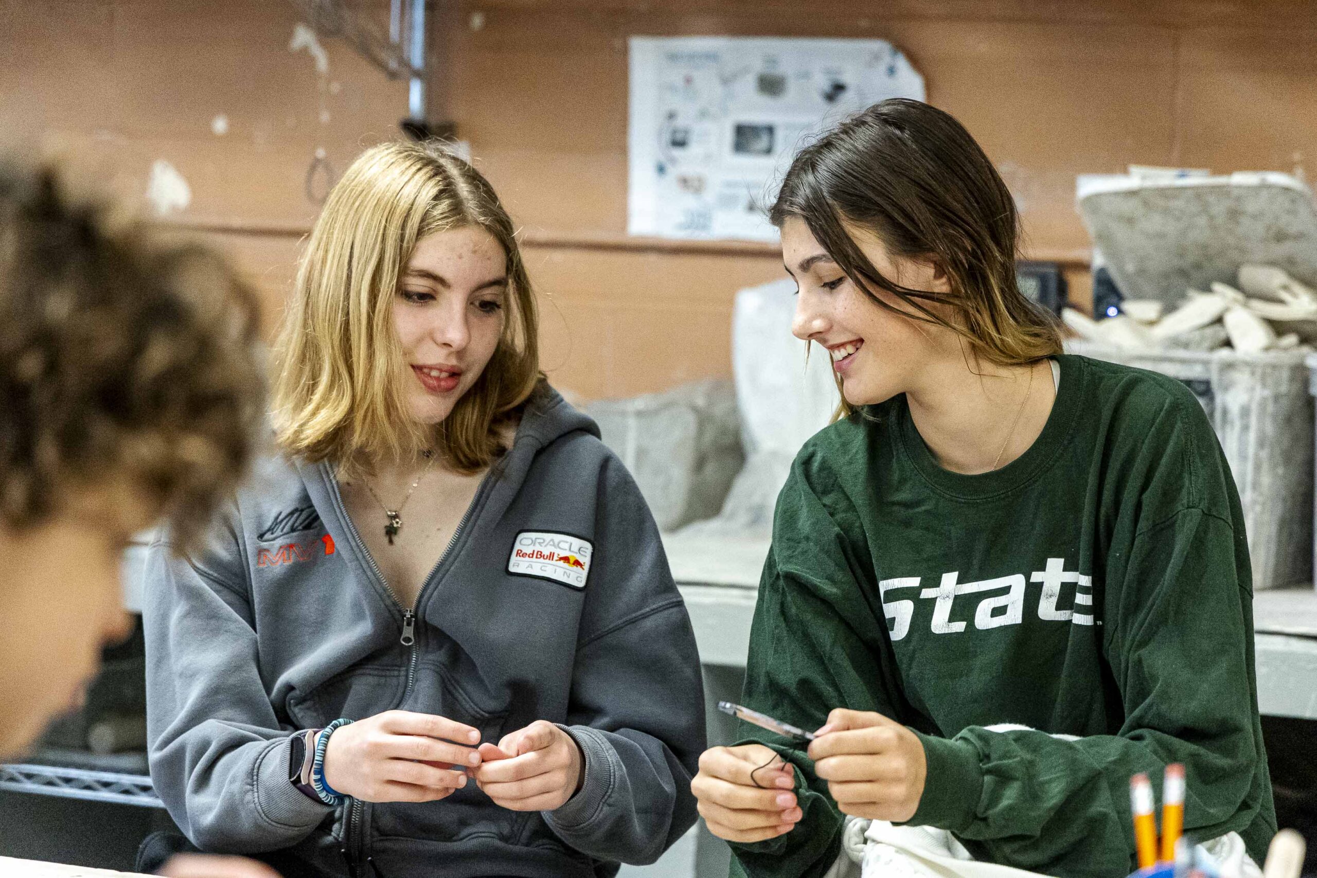 For Cyrus Kummer ’28, a choir student who doesn’t have as much access to a visual arts studio like Kieran, said, “I’ve enjoyed being able to experience tons of types of art that I wouldn’t normally be able to experience. I like working with resin to create molds. Working with clay at the potter’s wheel was challenging. But right now I’m working on a glass suncatcher.”